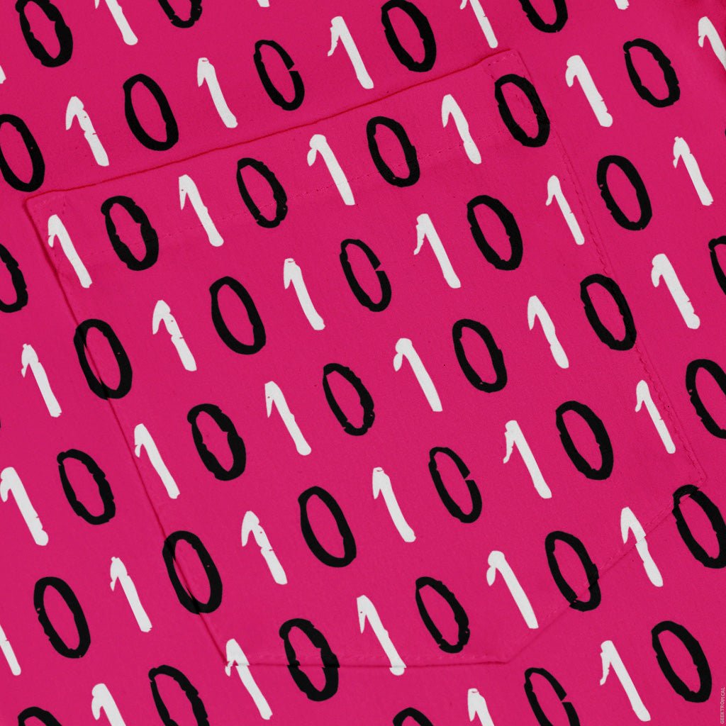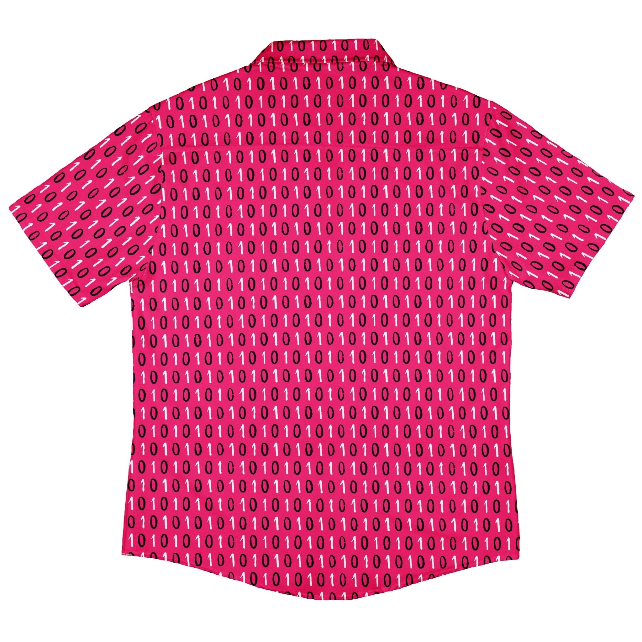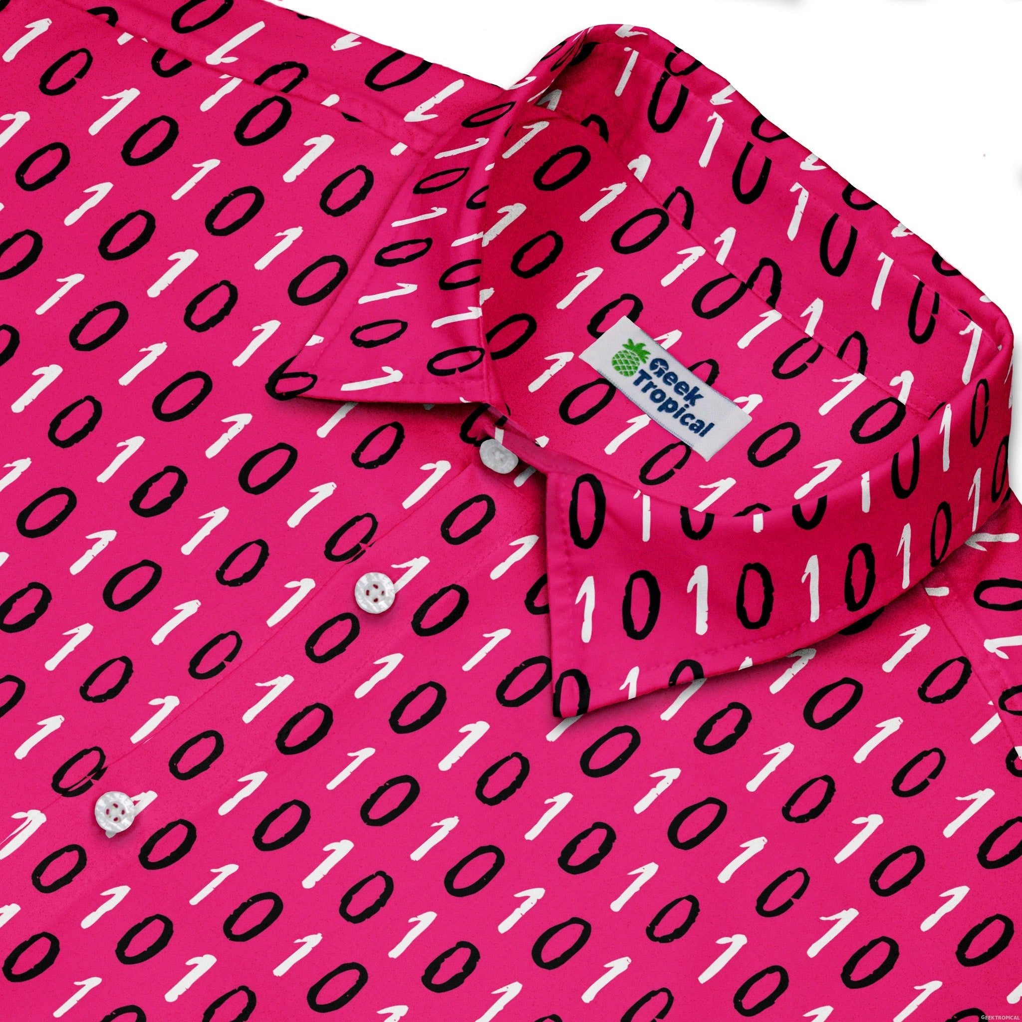 The 1s and 0s Pink Binary Button Up Shirt gives classic code a bold glow-up. On a vivid pink canvas, crisp 1s and 0s stack in neat columns, flowing cleanly across the placket for that satisfying, seamless look. Soft, breezy, and ready for workdays or con nights, it levels up smart-casual with geek flair. Artist-backed and designed by Zirkus Design, with eco-conscious printing your inner dev can feel good about.