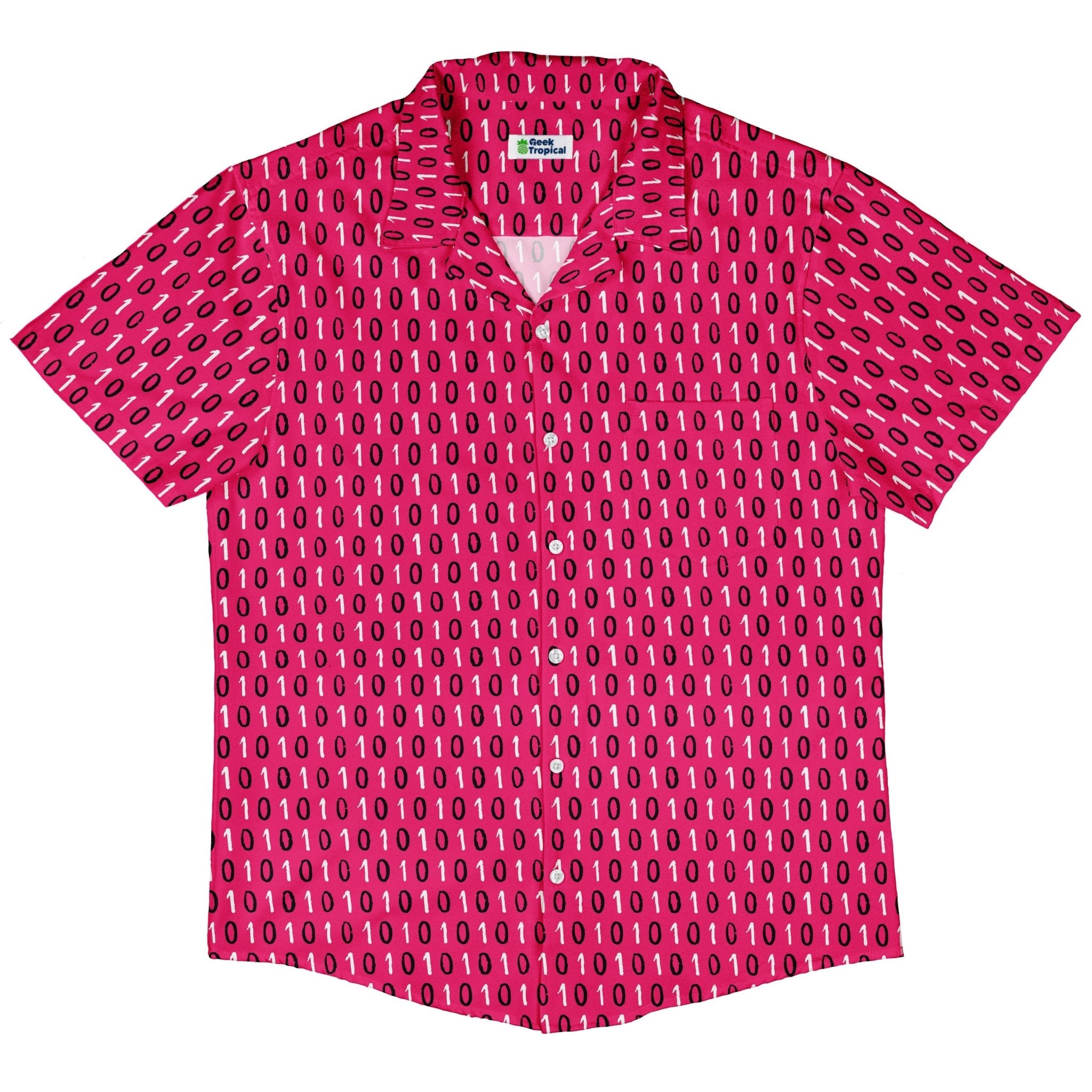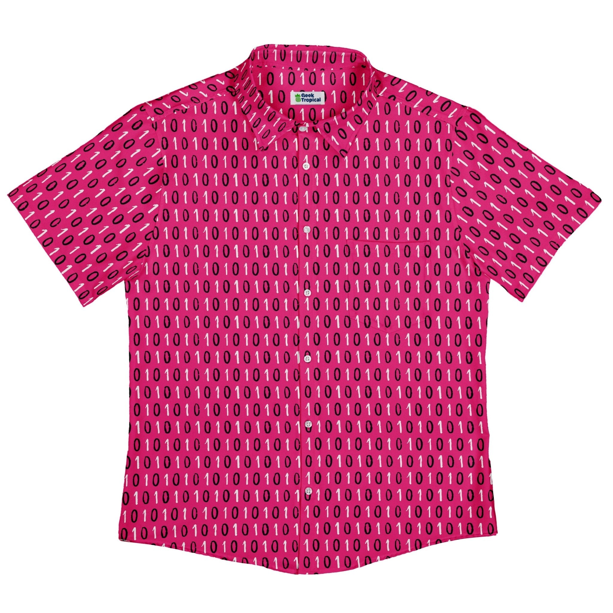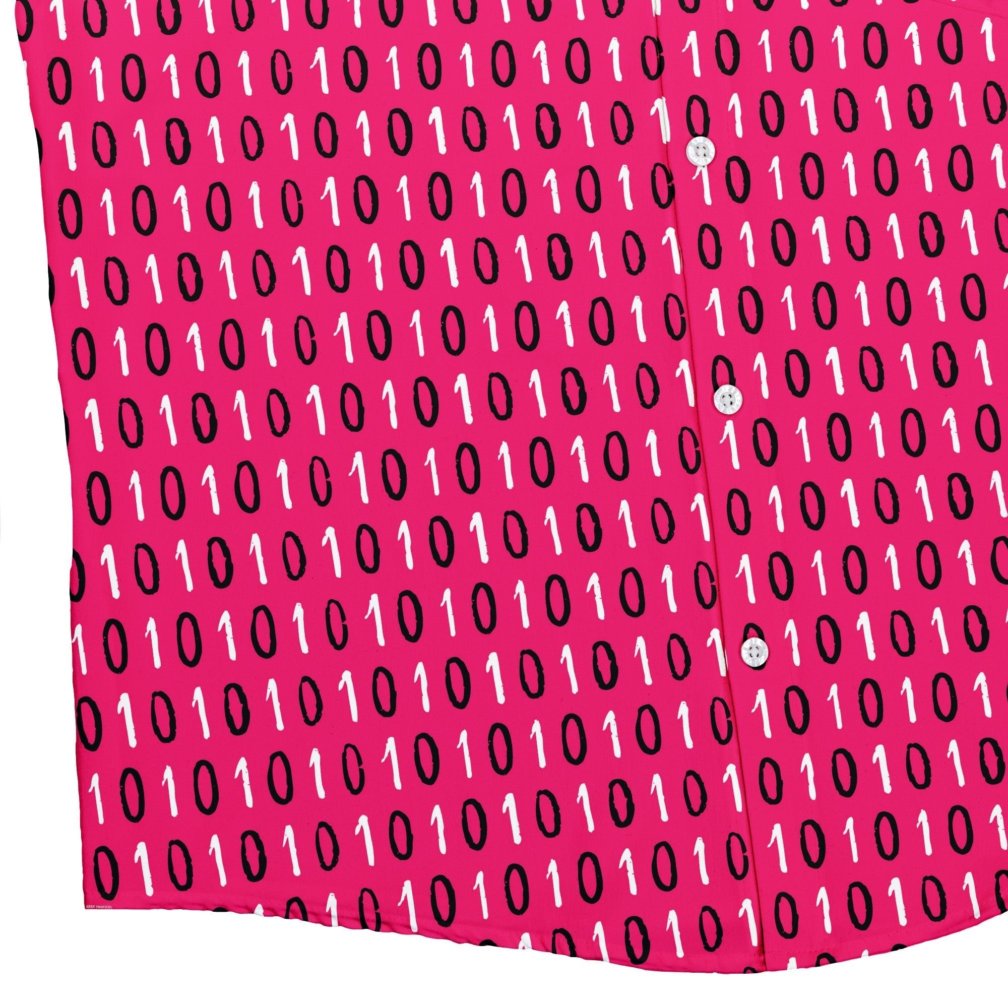 The 1s and 0s Pink Binary Button Up Shirt gives classic code a bold glow-up. On a vivid pink canvas, crisp 1s and 0s stack in neat columns, flowing cleanly across the placket for that satisfying, seamless look. Soft, breezy, and ready for workdays or con nights, it levels up smart-casual with geek flair. Artist-backed and designed by Zirkus Design, with eco-conscious printing your inner dev can feel good about.