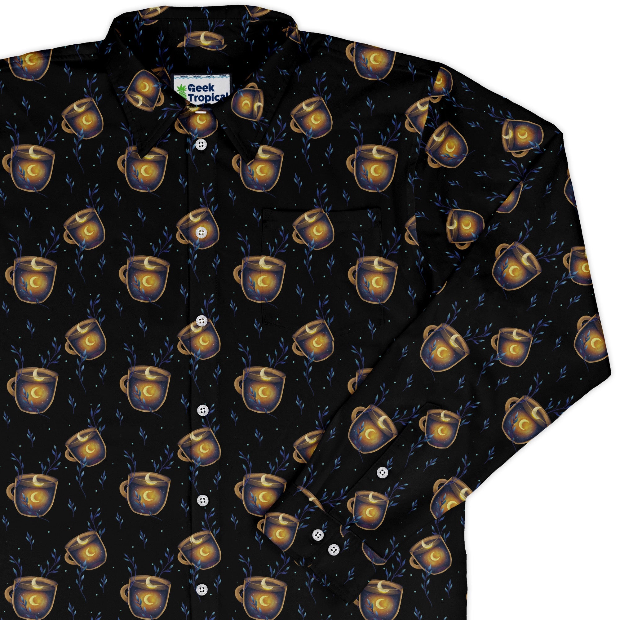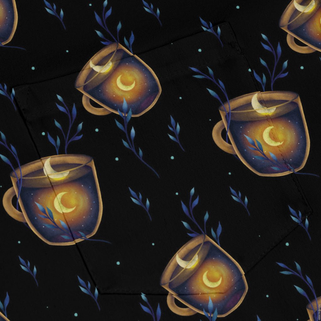 A Cup of Moonshine Long Sleeve Button Up Shirt turns your coffee break cosmic. Set on deep midnight blues, a space-suited explorer floats with a steaming cup of lunar glow, surrounded by stars and crisp crescent moons. The print lines up cleanly across the front and pocket, and the cut feels relaxed yet sharp. Designed by Episodic and printed with earth-kind inks, it’s artist-backed comfort for stargazers and daydreamers.