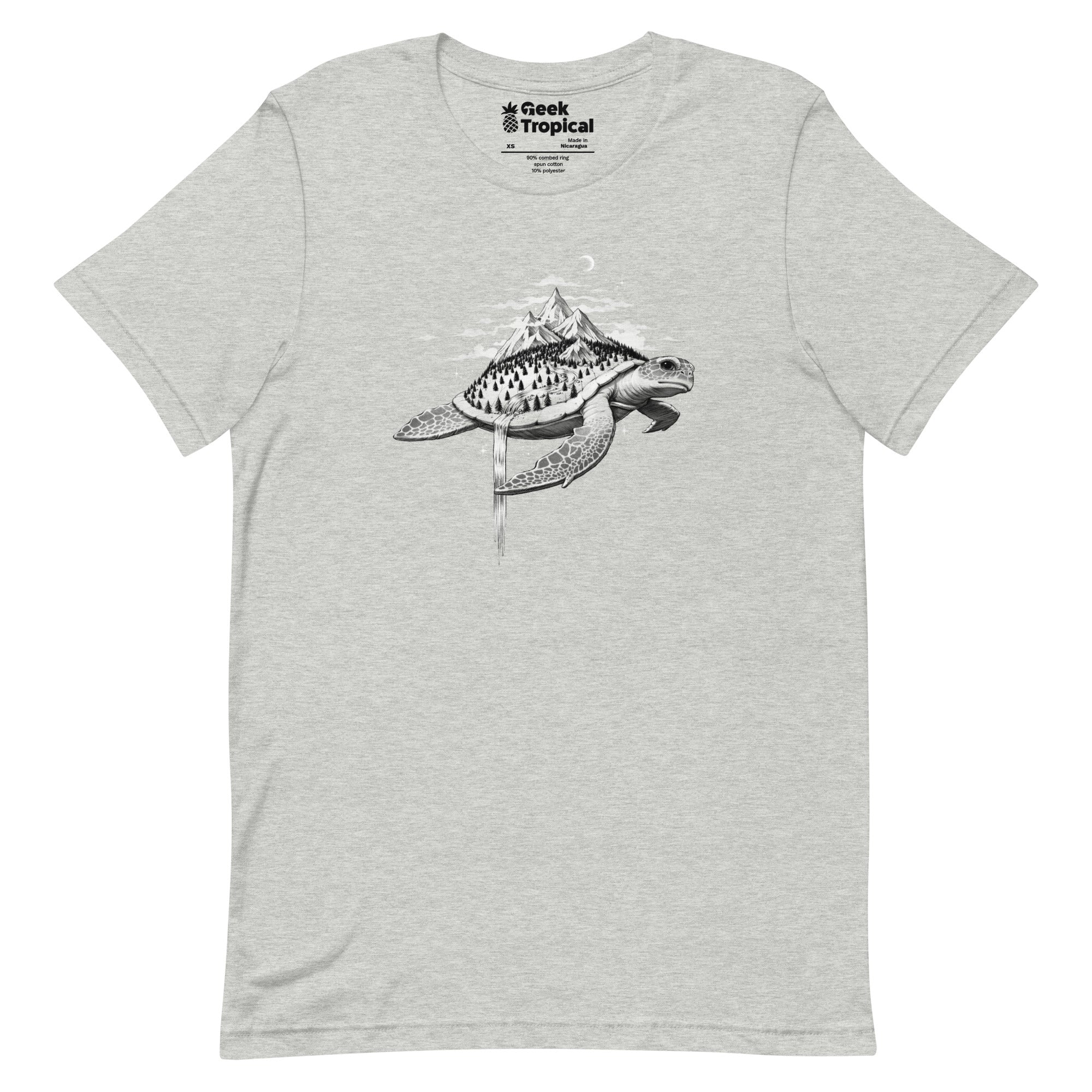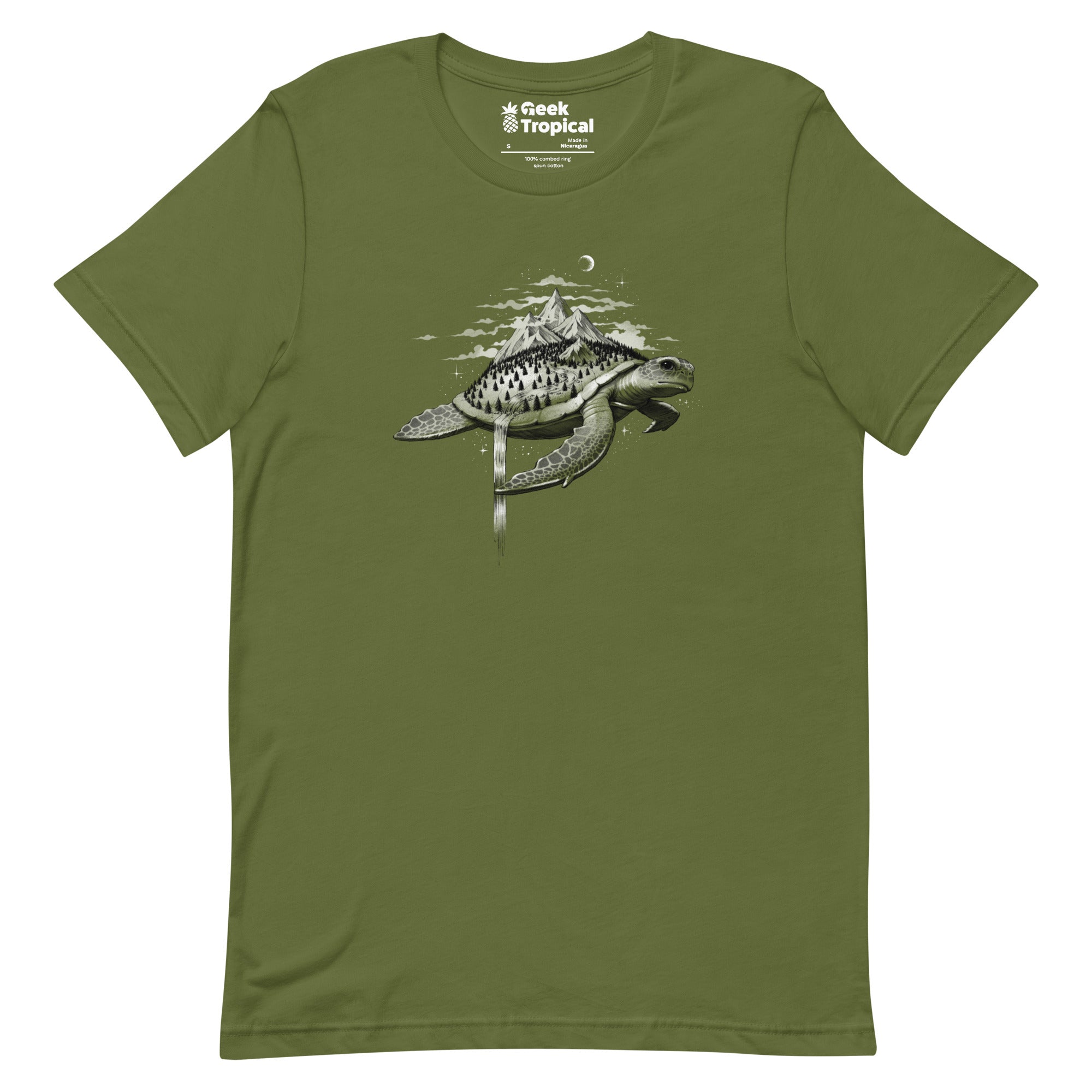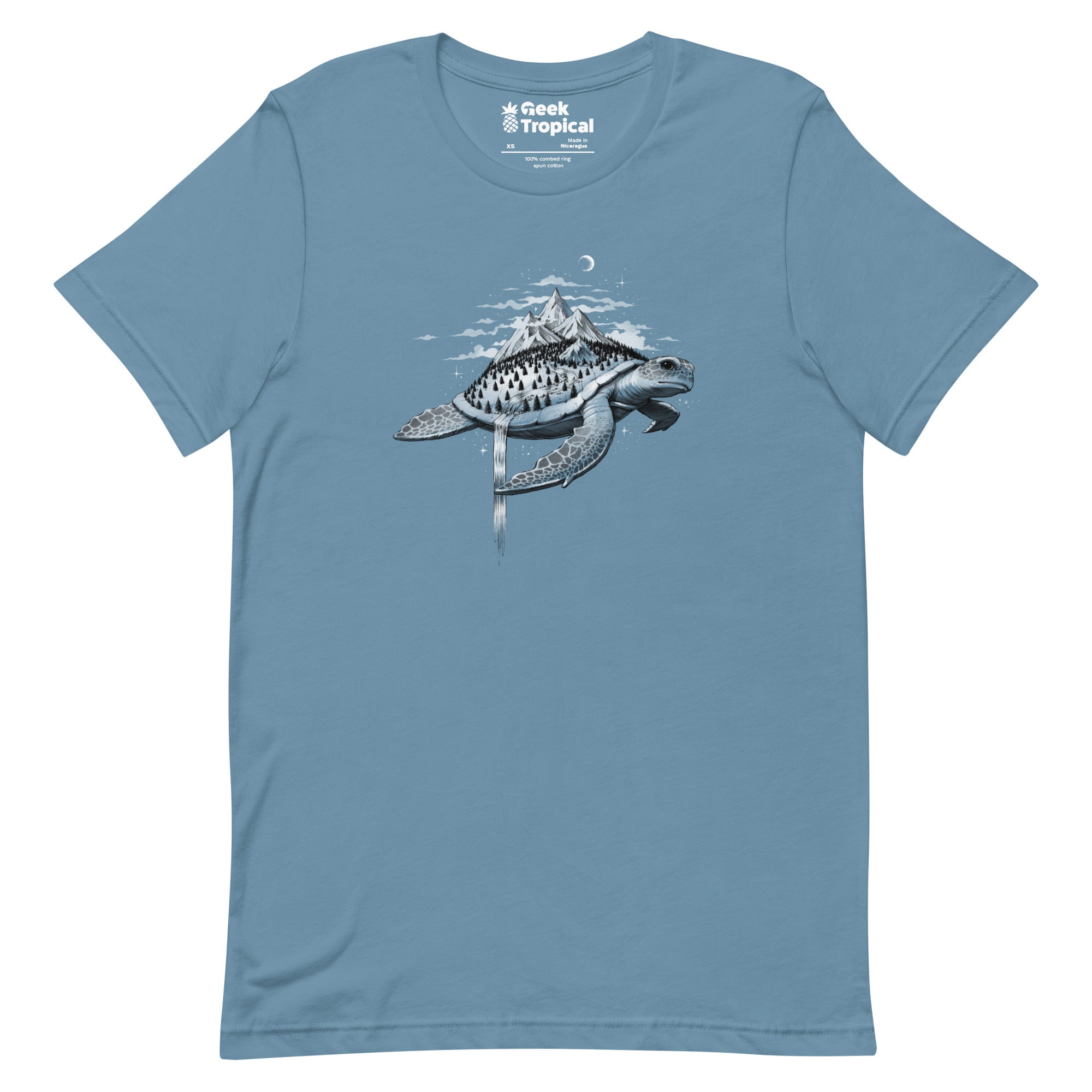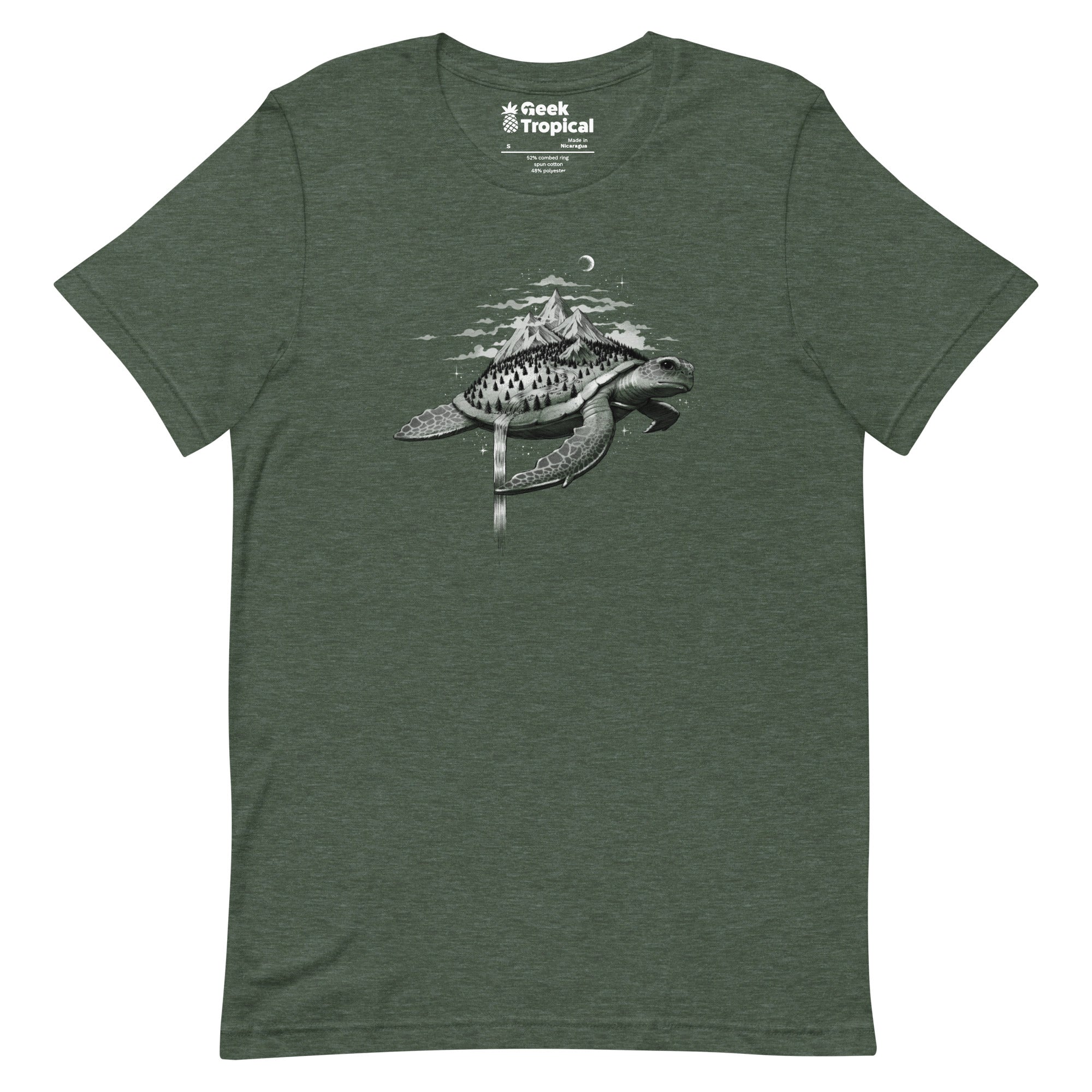 Adventure Turtle T-Shirt carries a world of exploration on its shell: a bold sea turtle rendered in double-exposure style, with layered scenery and topographic textures forming a dreamy micro-landscape inside the silhouette. Intricate linework rewards a second look, blending marine curiosity with wanderlust for ocean-loving geeks. Designed by Tobe Fonseca, this artist-licensed tee supports independent art with every wear.