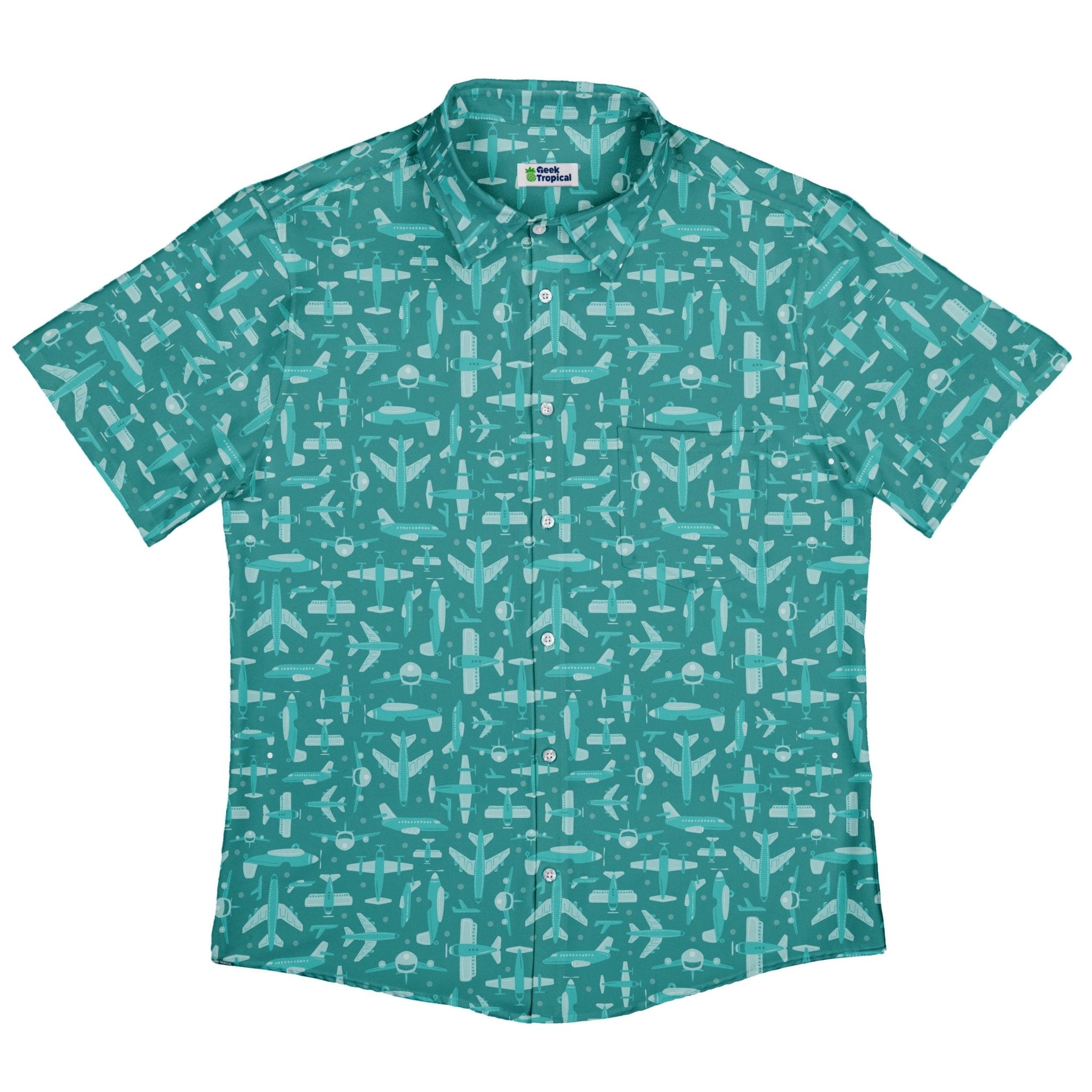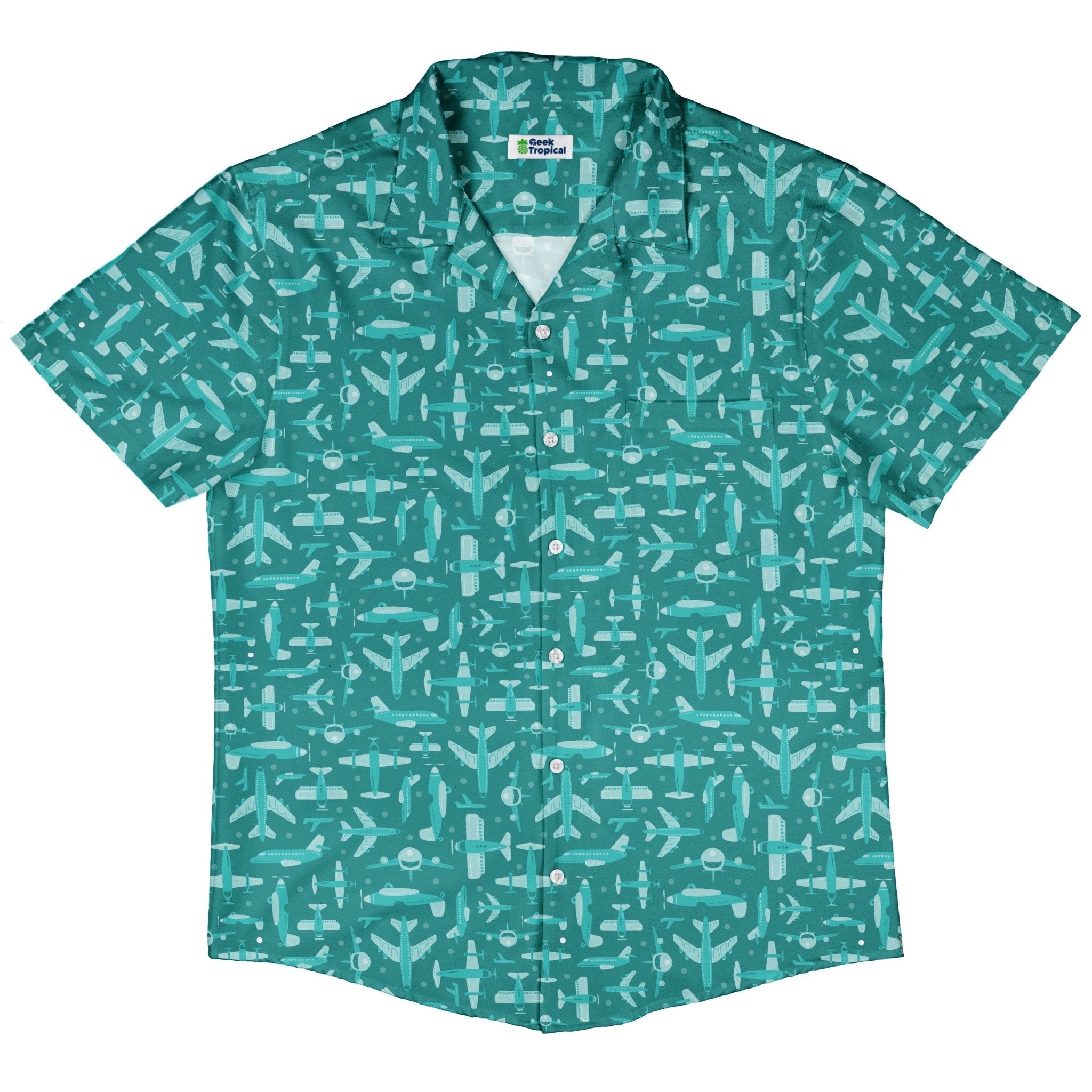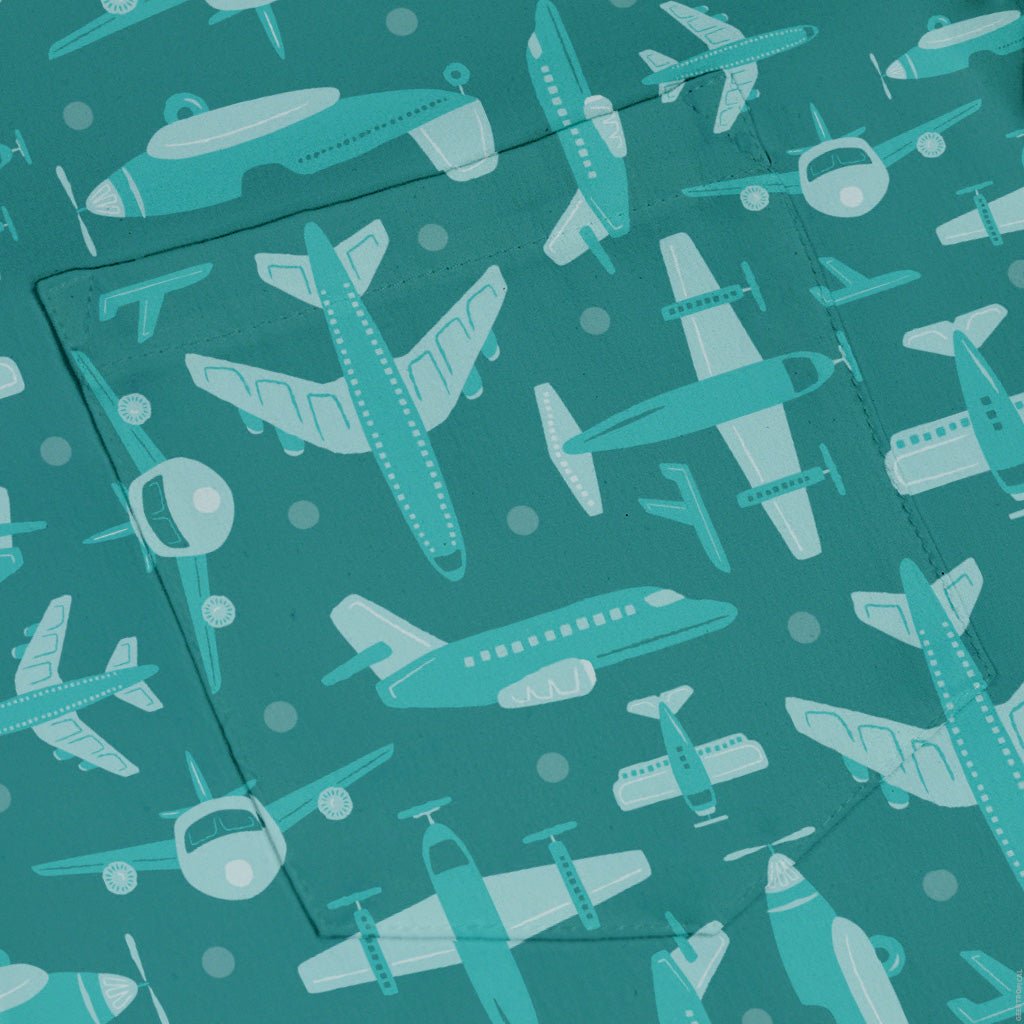 Airplane Angles Button Up Shirt taxis from runway to weekend with a nerdy-cool aviation print rendered in crisp technical linework—aircraft shown from varied perspectives with sharp angles and flight lines. Cut for a casual, polished drape with soft, lightweight comfort, and finished with custom buttons. Pattern alignment across the placket and optional pocket keeps the art seamless. Designed by Zirkus Design and printed with eco-minded inks that support the artist.
