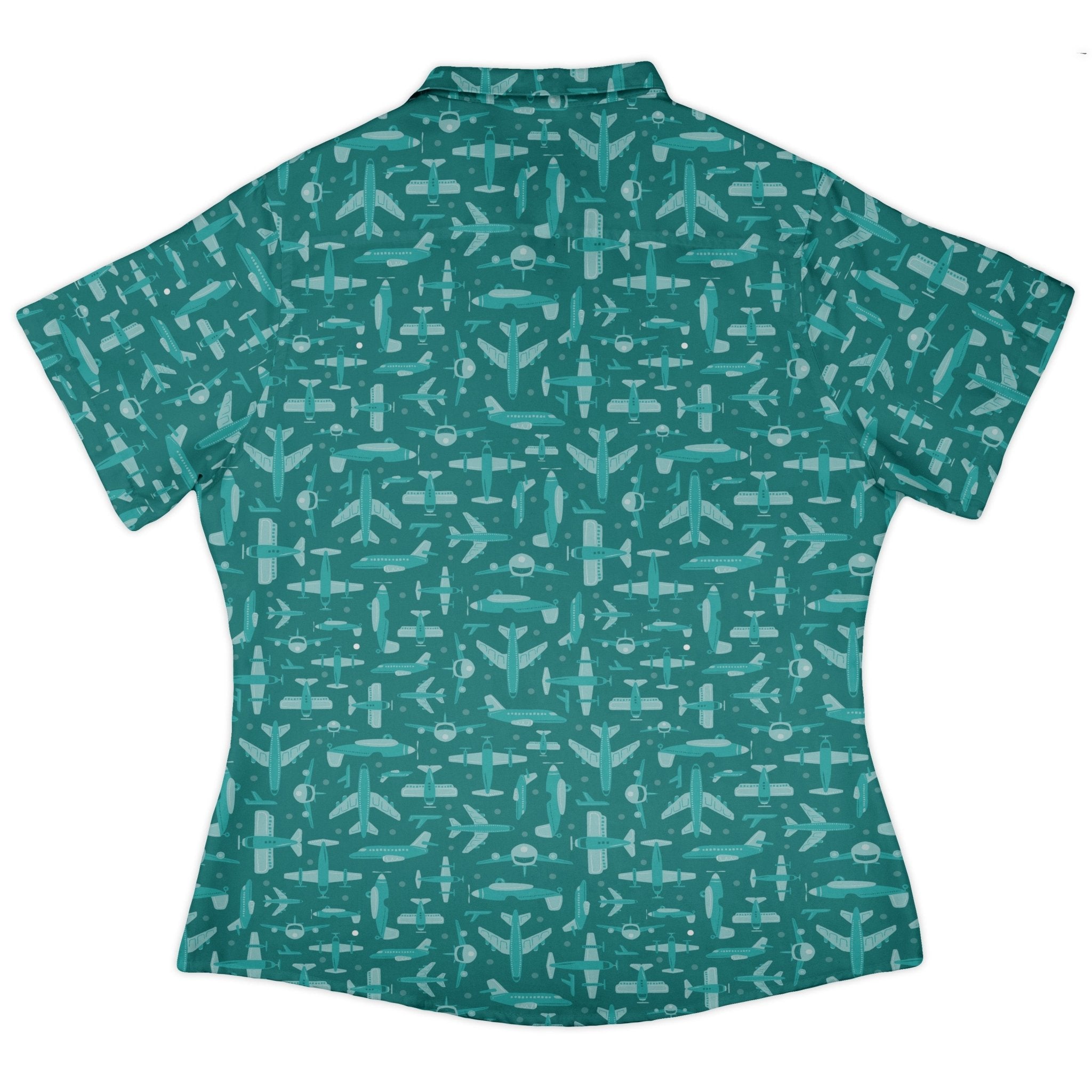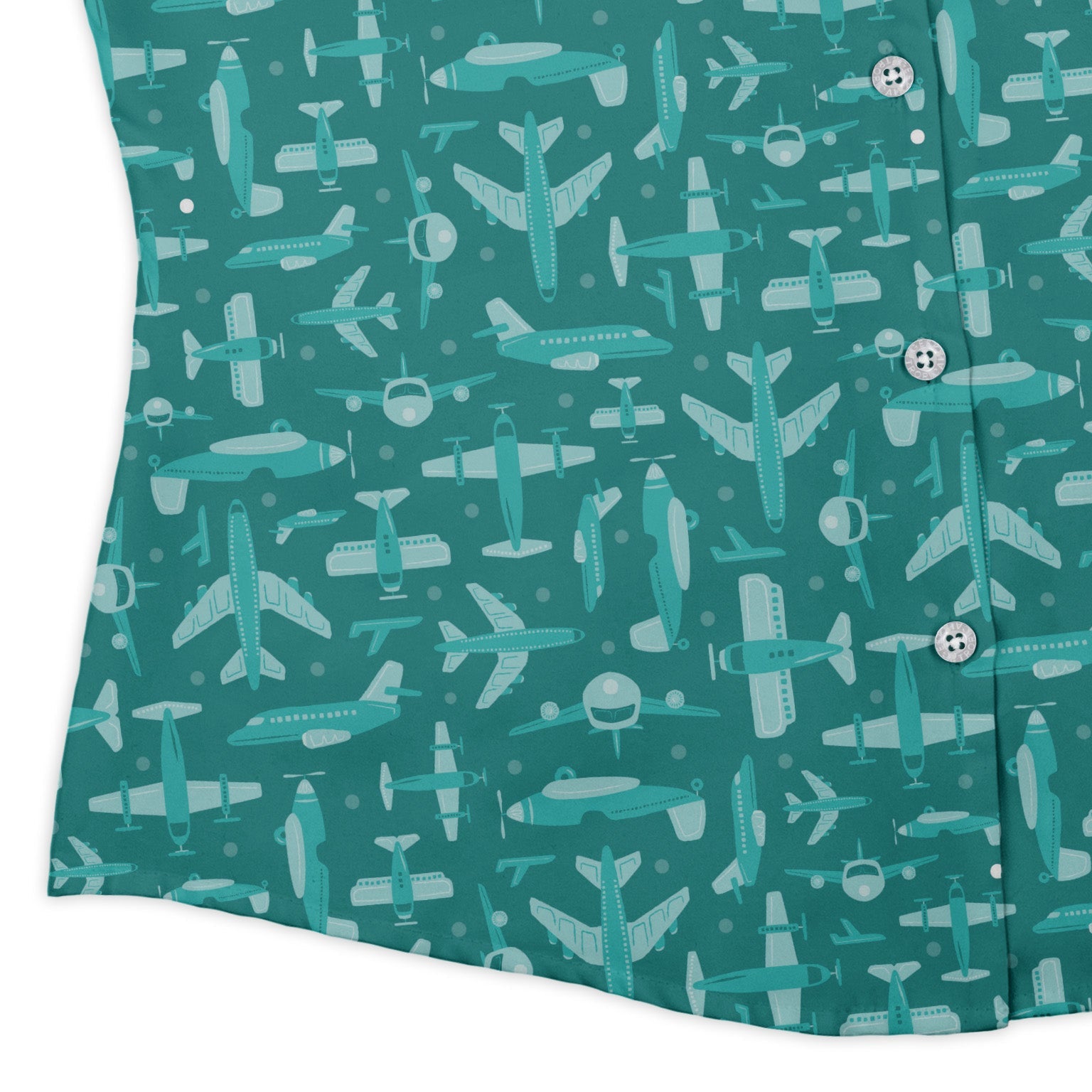 Meet the Airplane Angles Curvy Button Up Shirt, a smart, aviation-forward piece that flatters curves. Designed by Zirkus Design, its allover print scatters sleek airplane silhouettes at dynamic angles, serving clean, nerdy blueprint vibes without feeling fussy. A shape-following fit stays polished whether you wear it tucked or untucked, and the soft hand makes it an easy daily go-to. Artist-backed and built for everyday wear.