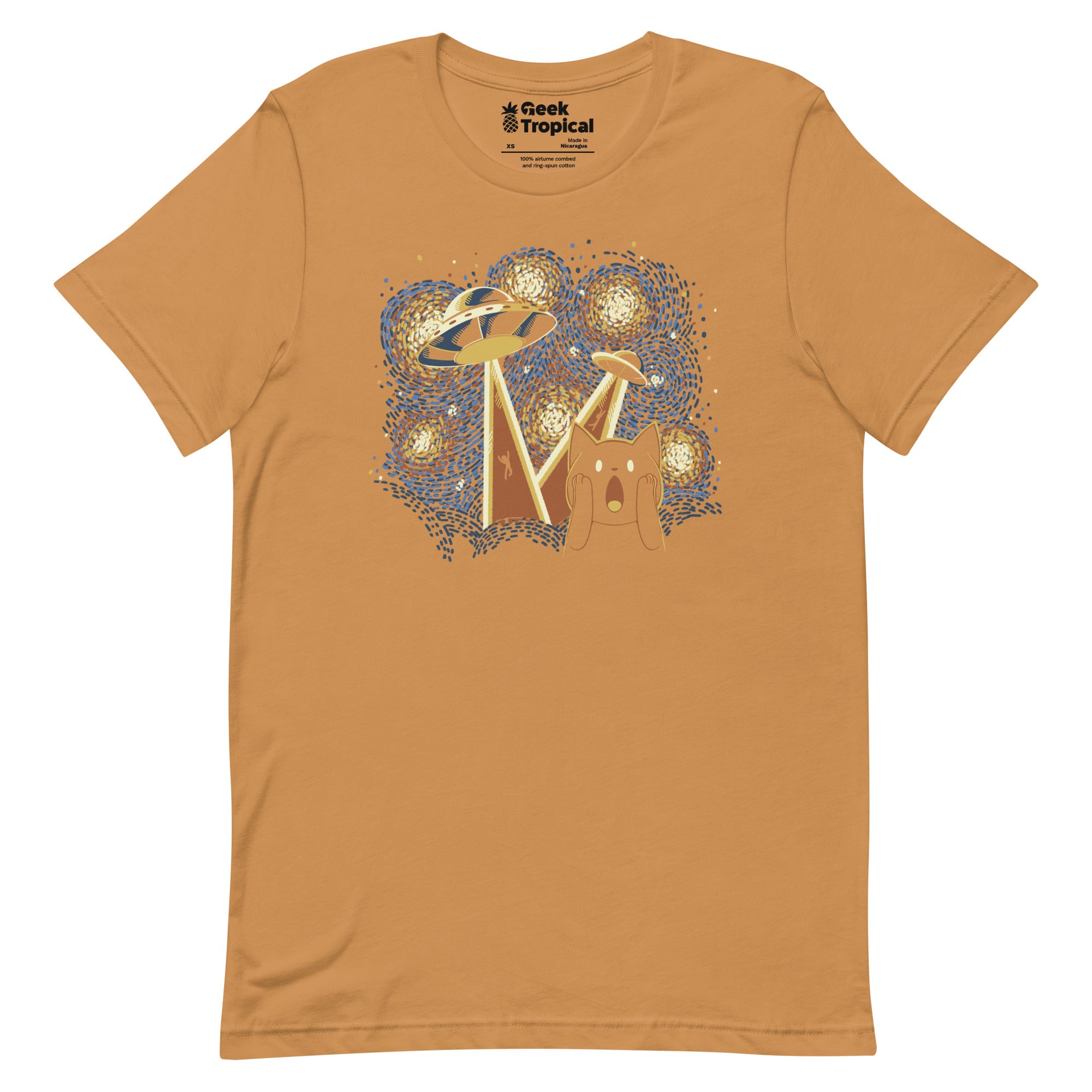 Alien Invasion Cat Scream T-Shirt brings delightful panic to your rotation: a startled cat frozen mid-yowl as otherworldly visitors crowd a cosmic backdrop. Clean lines and bold contrast make the feline freak-out the star, perfect for sci‑fi lovers and cat people alike. Designed by Tobe Fonseca and artist-backed, this piece prints vividly and supports the creator behind the chaos.