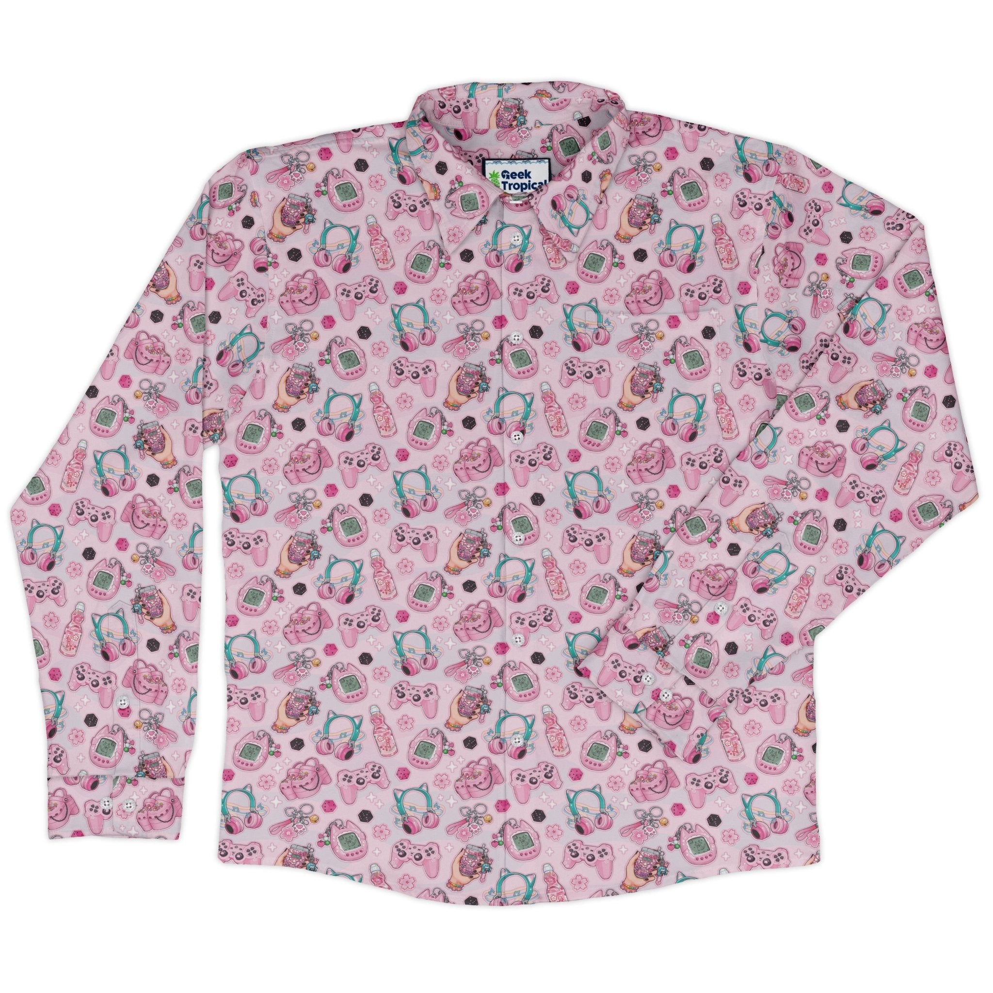 Level up your wardrobe with the Anime Gamer Items Pink Long Sleeve Button Up Shirt, a candy-pink standout covered in anime-inspired gamer icons. The all-over print flows smoothly across the placket and pocket for a crisp, polished look, making it easy to dress up or down. Designed by Ivy Dolamore and backed by Geek Tropical’s artist-first ethos, this shirt broadcasts your fandom with effortless style.