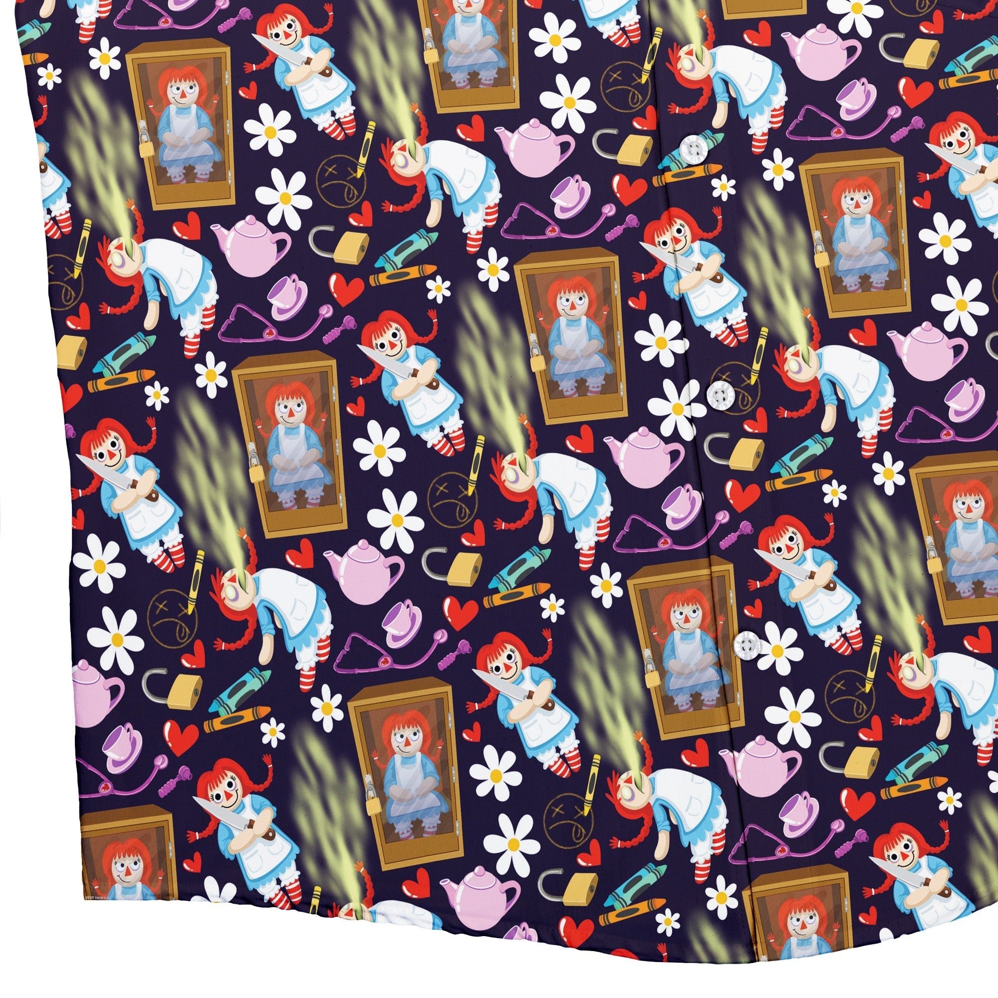 Annabelle Doll Button Up Shirt channels haunted-doll energy into a sharp, everyday flex. An all-over pattern of Annabelle’s unblinking gaze creeps across the shirt in true maximalist style, balanced by a clean collar and neat placket. Designed by Julie Kitzes, this artist-backed piece turns horror into wearable art, with vivid, eco-conscious inks for a look that stays chilling and confidently cool.