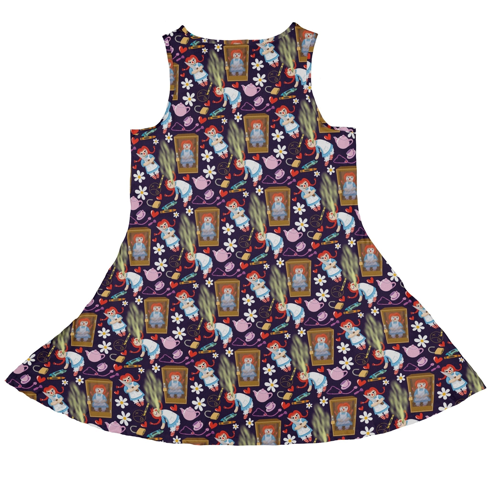 Annabelle Doll Dress makes spooky sweet. A vintage-cream print sets the stage for a bold red waist sash, subtle ruffle shading, and clean doll-like lines—capturing haunted charm without looking like a costume. Easy skater fit with real pockets, comfy drape, and opaque coverage for everyday mischief. Designed by Julie Kitzes and artist-backed.