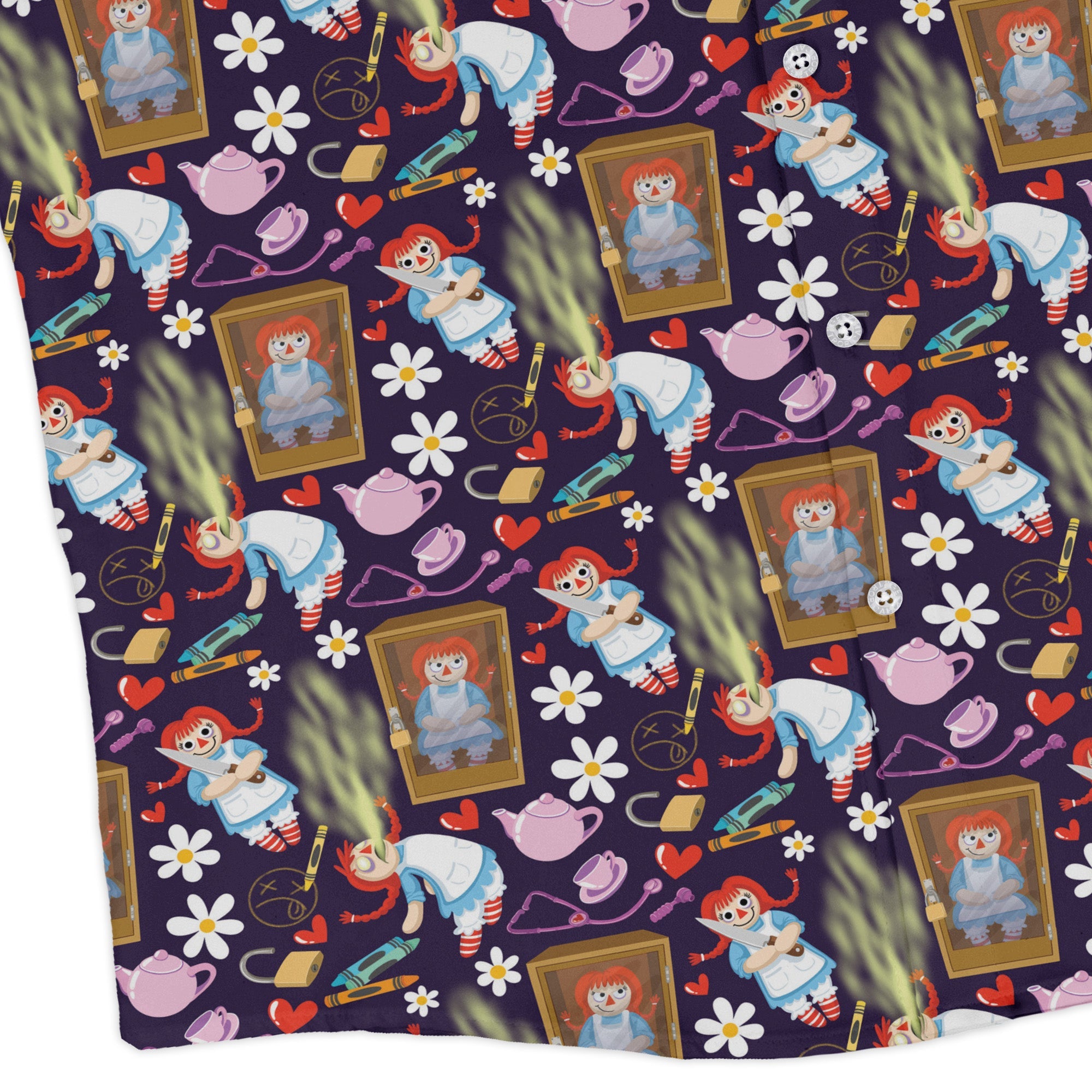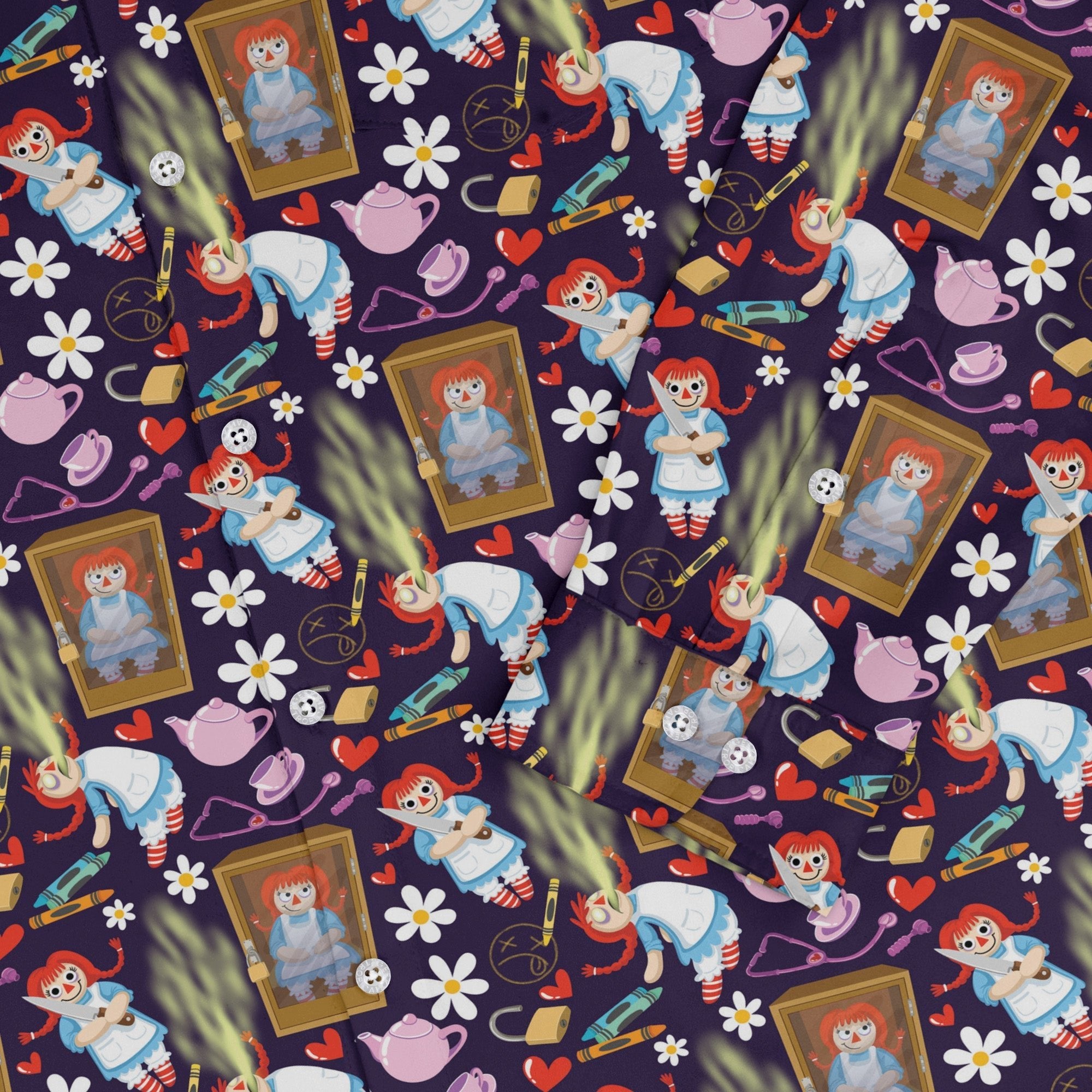 Annabelle Doll Long Sleeve Button Up Shirt brings a lovingly wicked twist to your rotation with an all-over array of haunted doll portraits—wide eyes, porcelain sheen, and that unnerving half-smile—in deep, moody tones. A maximalist repeat that reads bold from across the room. Smart long sleeves and crisp buttons keep it polished. Designed by Julie Kitzes, it’s art-forward horror you can layer from matinee to midnight.