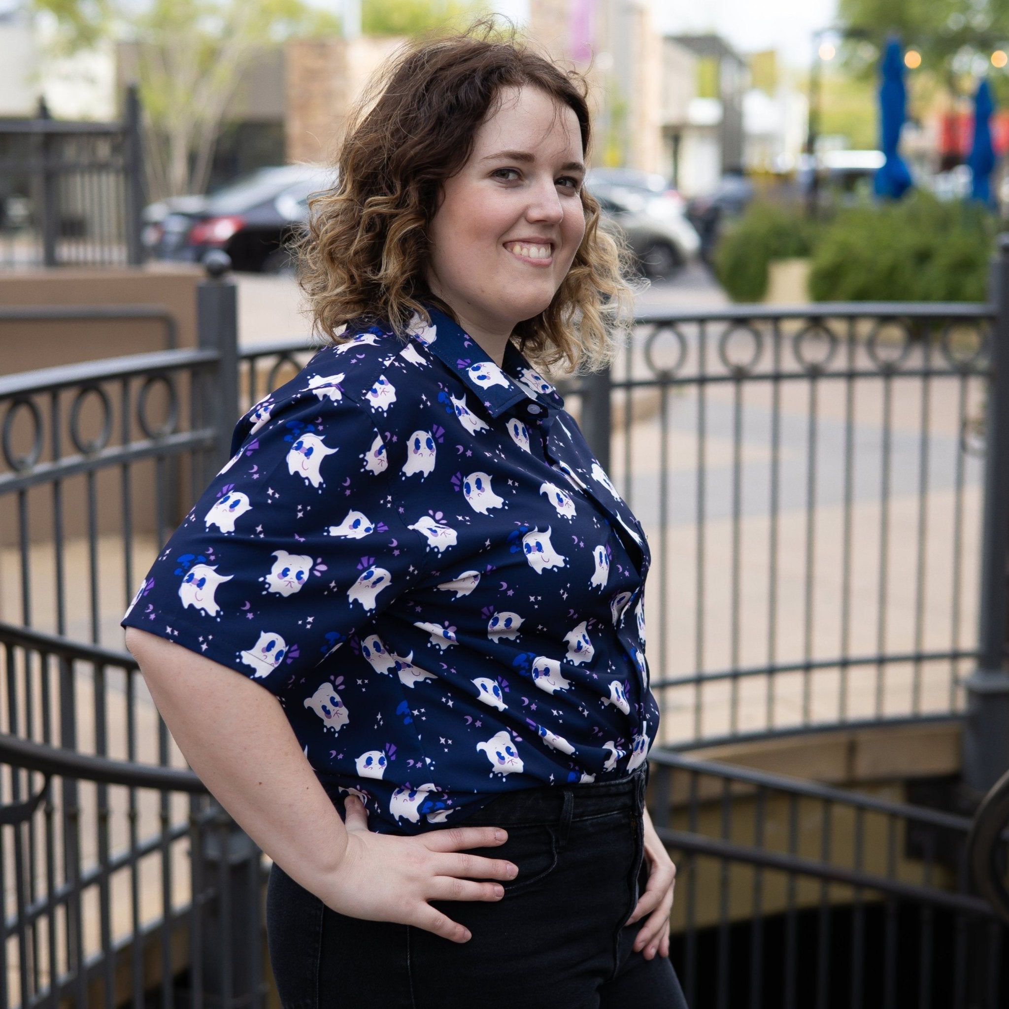 Anxious Ghosts Purple Button Up Shirt turns spooky season into a mood you can wear. On a rich, dark purple canvas, a crowd of uneasy little specters drifts across the fabric in an all-over repeat, aligned cleanly across the placket and pocket for a seamless look. Designed by Ardi Tong, it blends playful, anime-lite energy with sharp, everyday polish. Artist-backed and printed with eco-conscious inks.