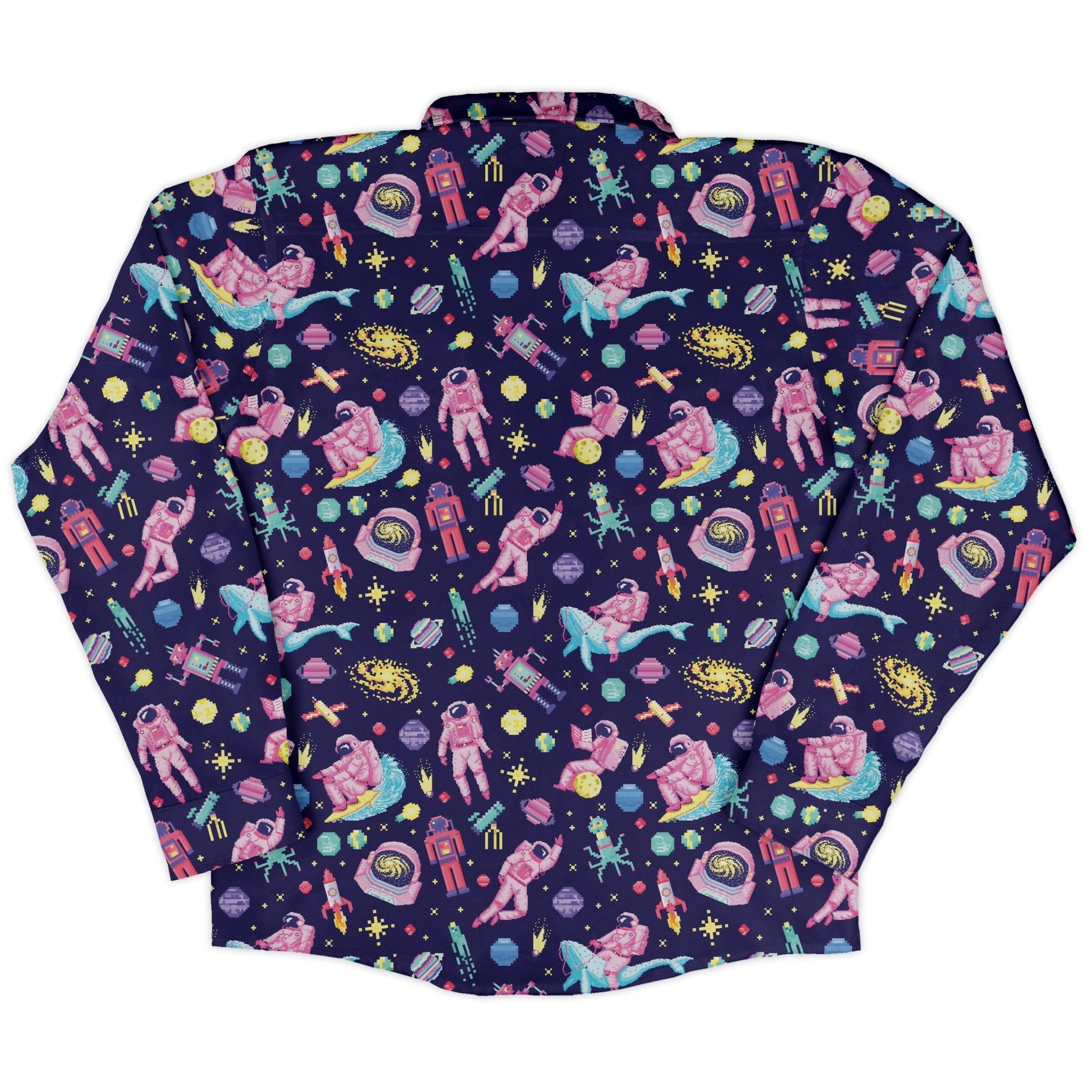 Astronaut Pixels Outer Space Purple Blue Long Sleeve Button Up Shirt