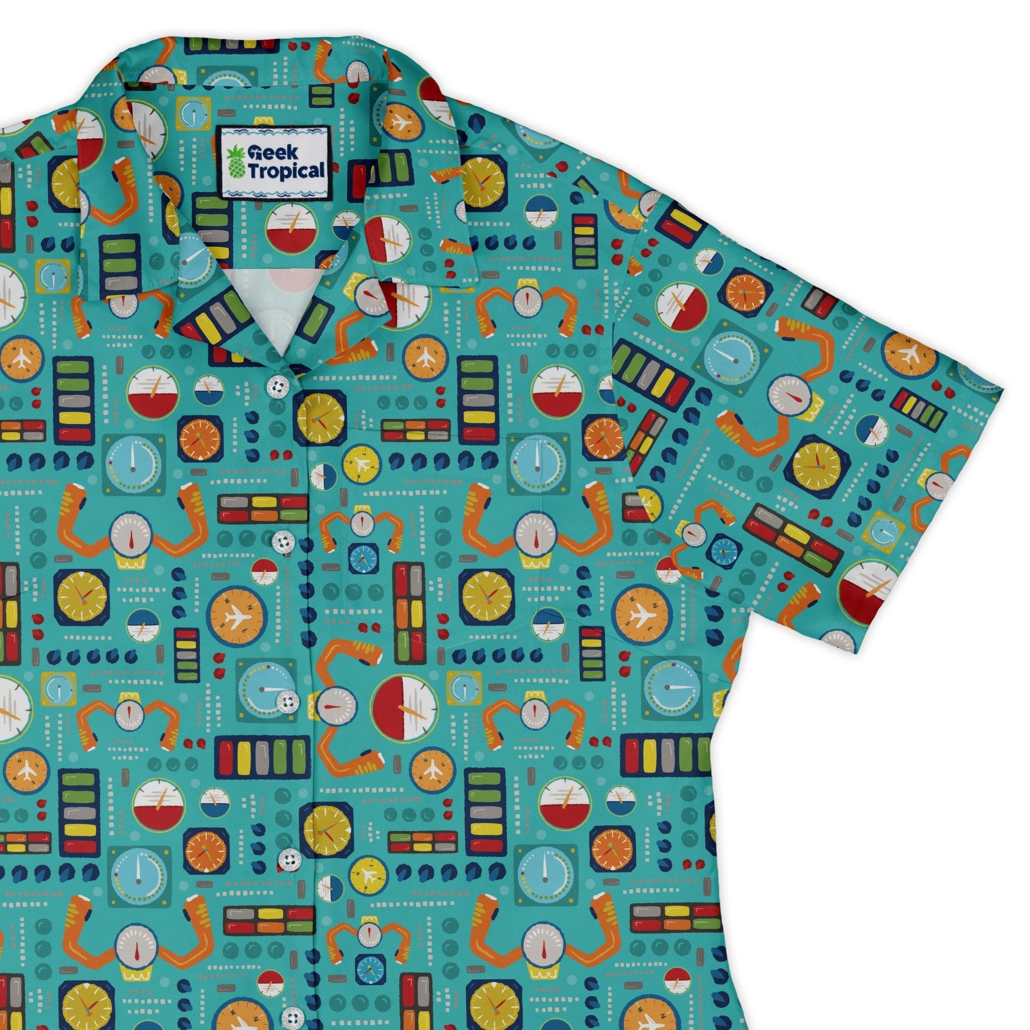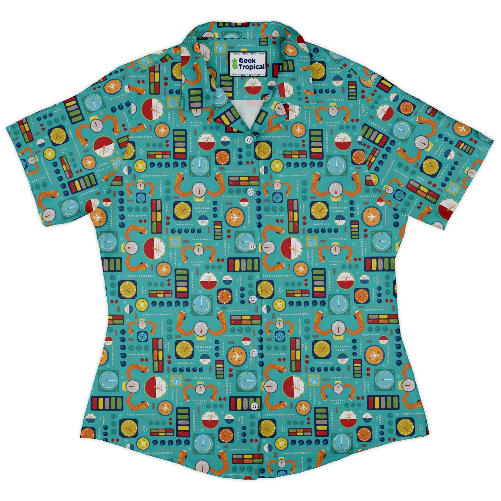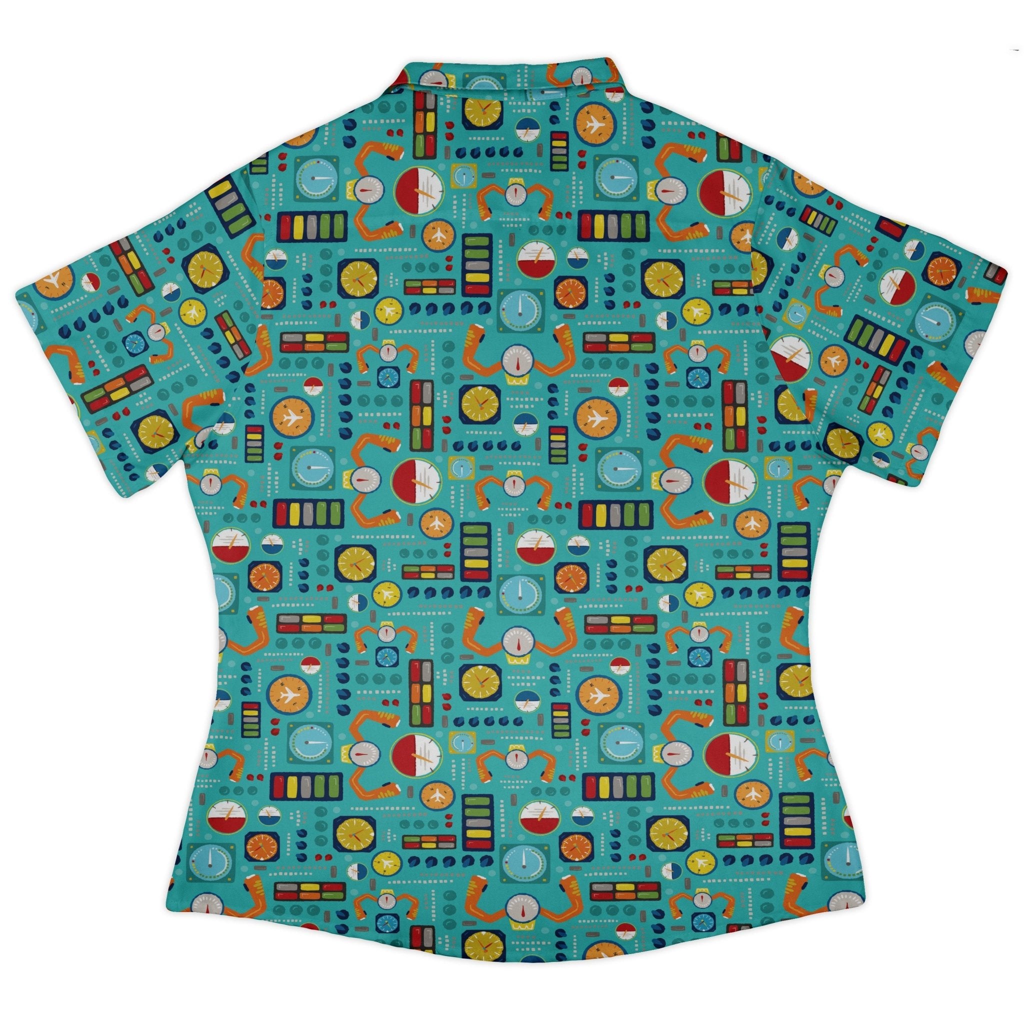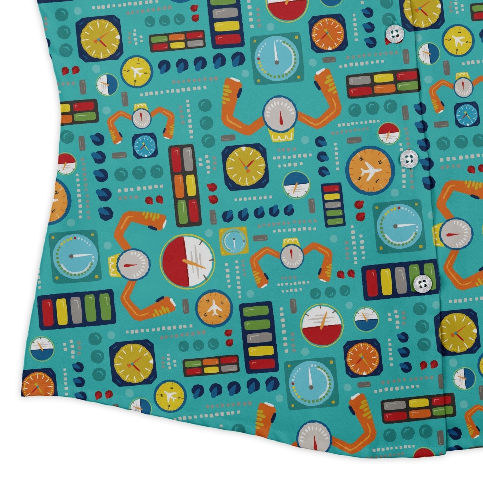 The Aviation Adventure instrument Curvy Button Up Shirt takes your love of flight from hangar to happy hour. A detailed aviation print of cockpit gauges and compass markings flows cleanly across the front and pocket for a seamless, nerdy-chic look, designed by Zirkus Design. A curve-following fit, tidy untucked hem, and adjustable sleeves keep it polished yet easy. Finished with branded buttons and printed with eco-conscious inks—artist backed and built for avgeeks.