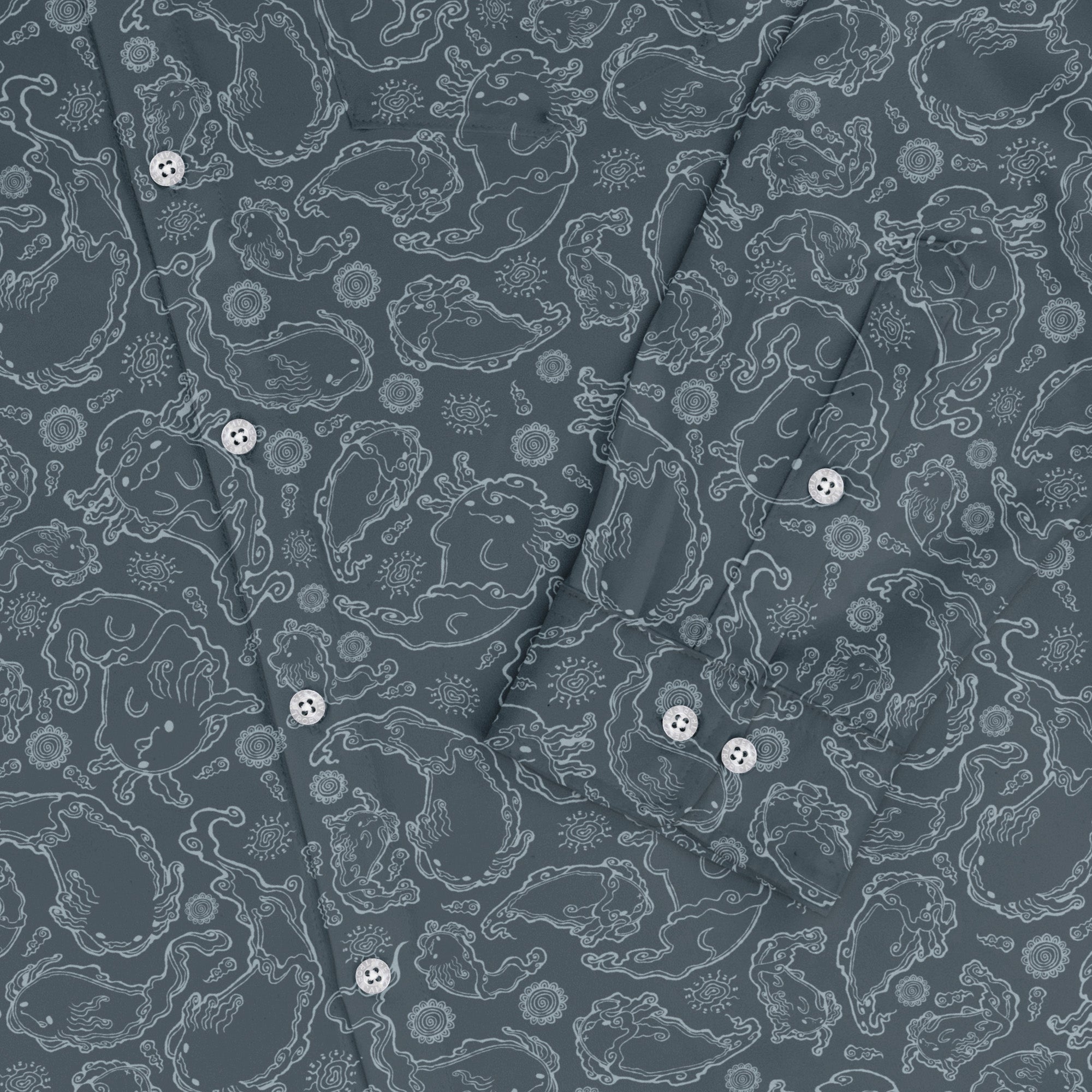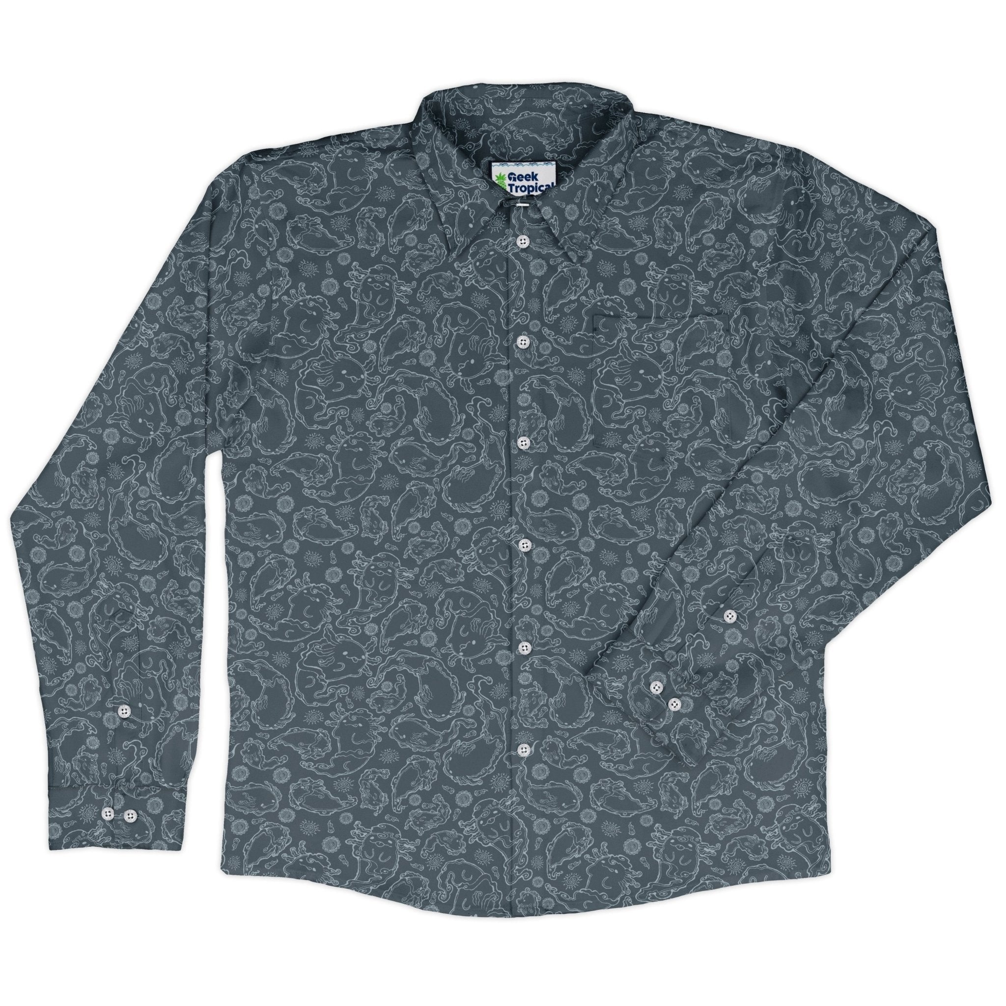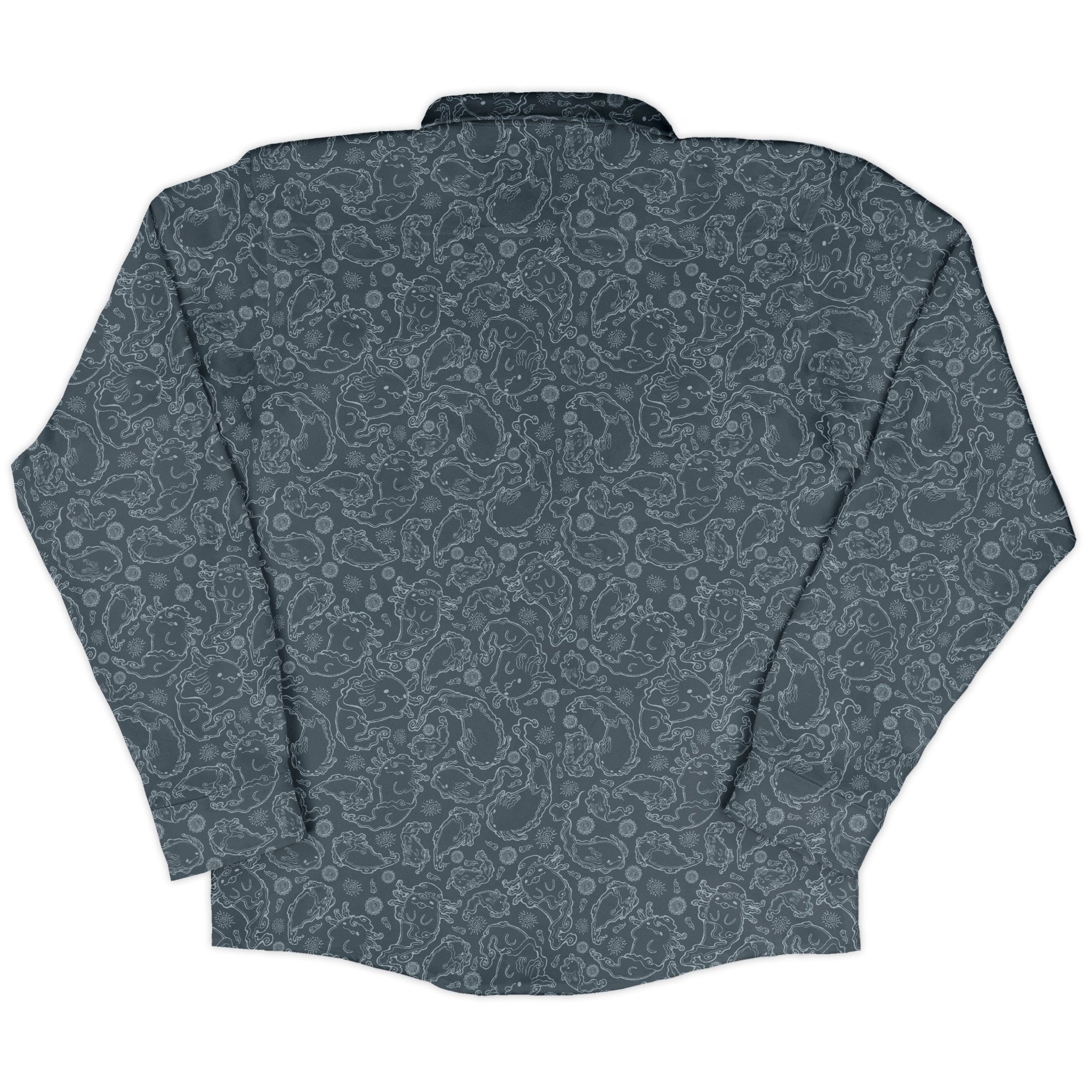 Meet the Axolotl Airbending Salamanders Long Sleeve Button Up Shirt, a breezy flex for elemental geeks. Playful axolotls ride curling wind swirls across an allover print that flows cleanly over the placket and pocket for a seamless look. Easy, relaxed vibe with crisp cuffs you can dial in. Designed by Ardi Tong and finished with eco-minded inks, this artist-backed button-up keeps you cool from con floor to casual Friday.