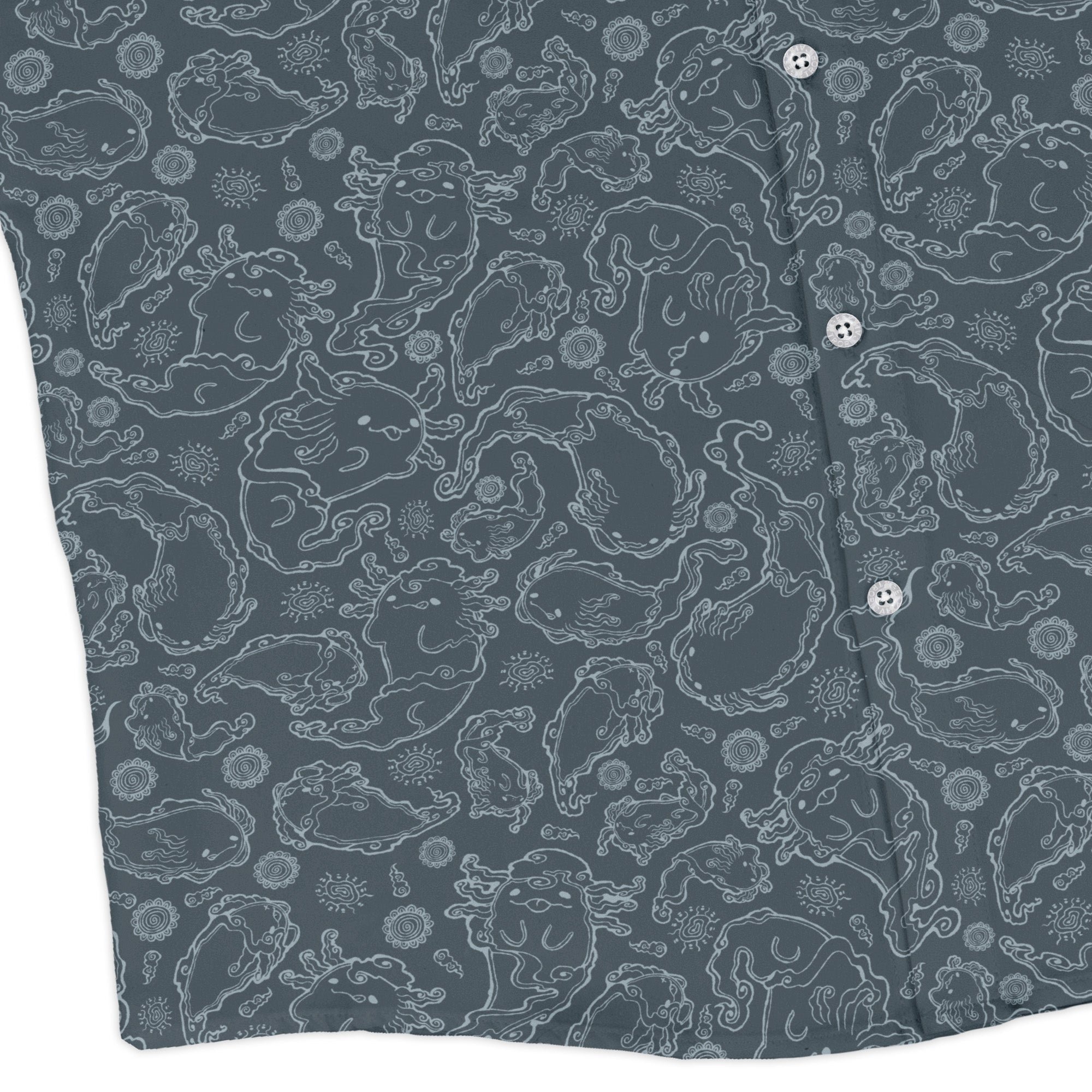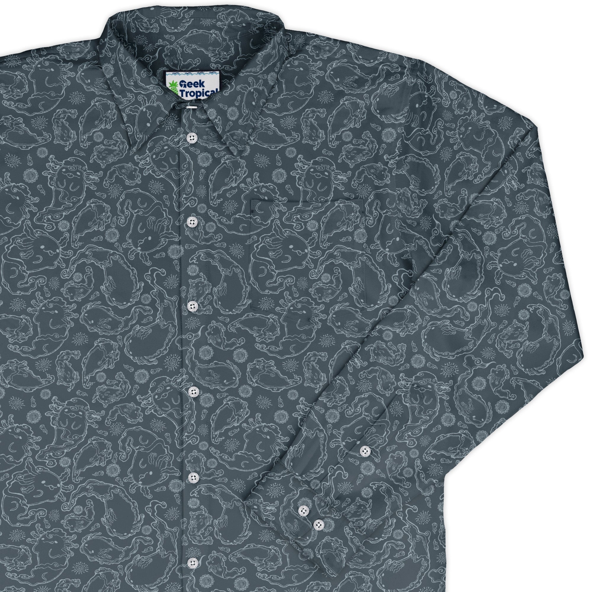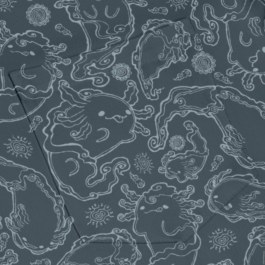 Meet the Axolotl Airbending Salamanders Long Sleeve Button Up Shirt, a breezy flex for elemental geeks. Playful axolotls ride curling wind swirls across an allover print that flows cleanly over the placket and pocket for a seamless look. Easy, relaxed vibe with crisp cuffs you can dial in. Designed by Ardi Tong and finished with eco-minded inks, this artist-backed button-up keeps you cool from con floor to casual Friday.
