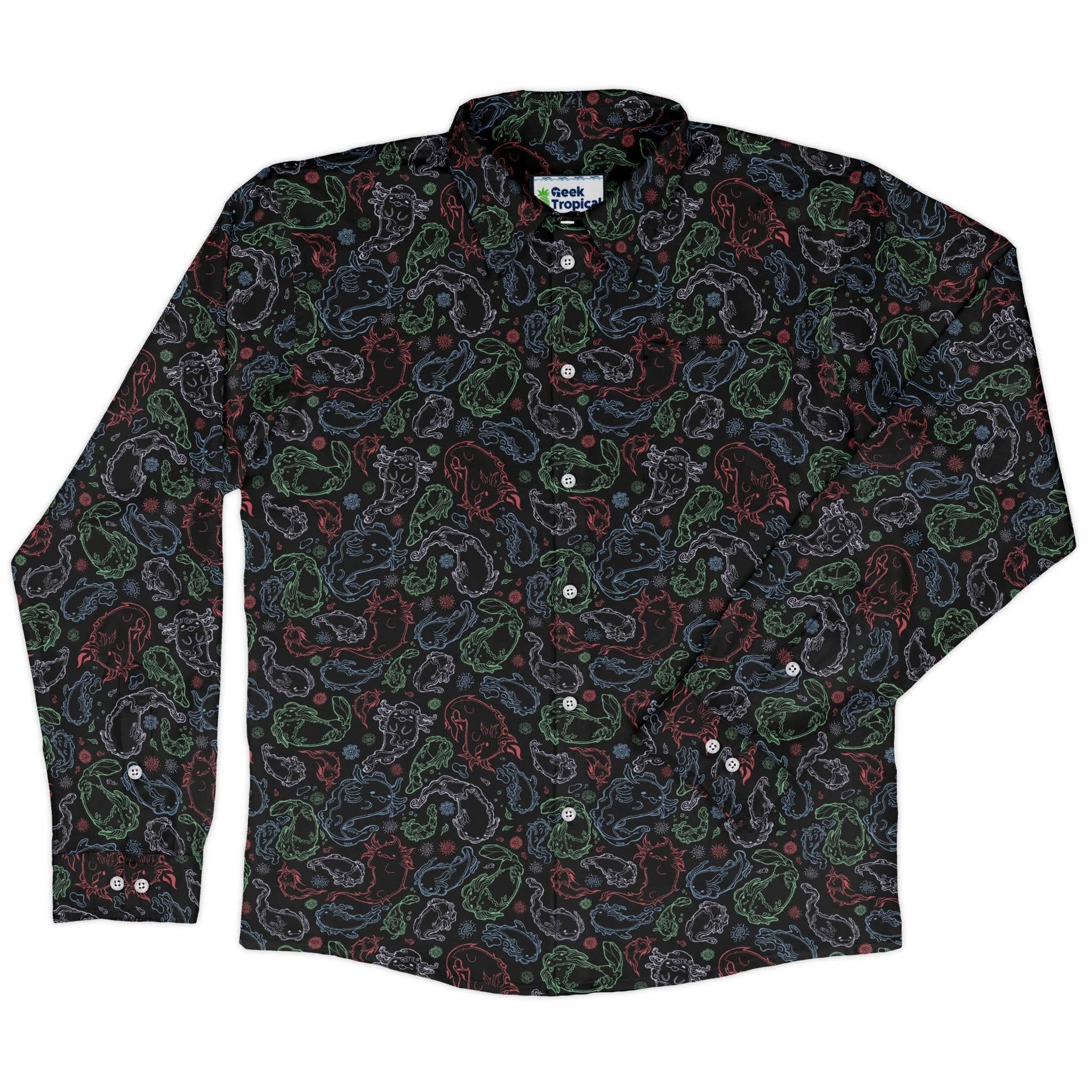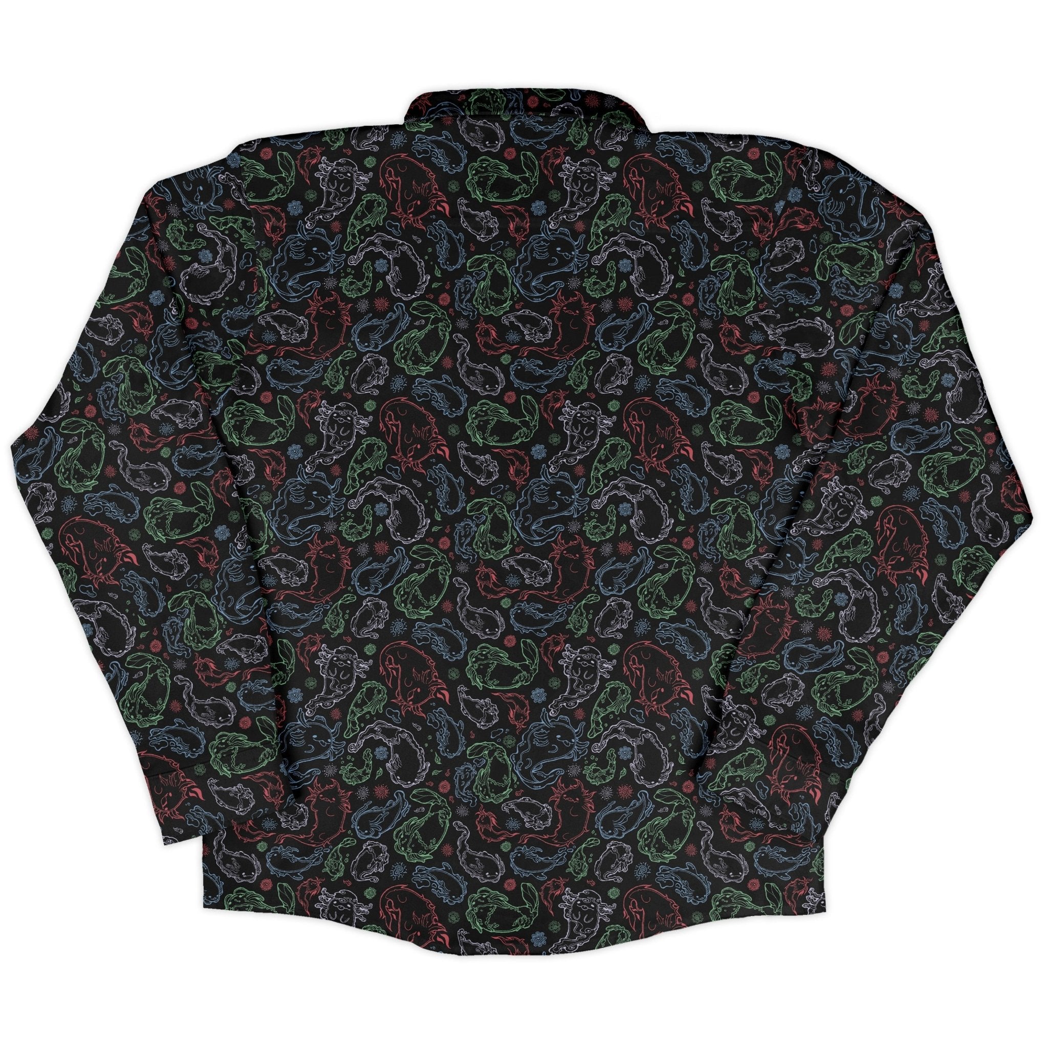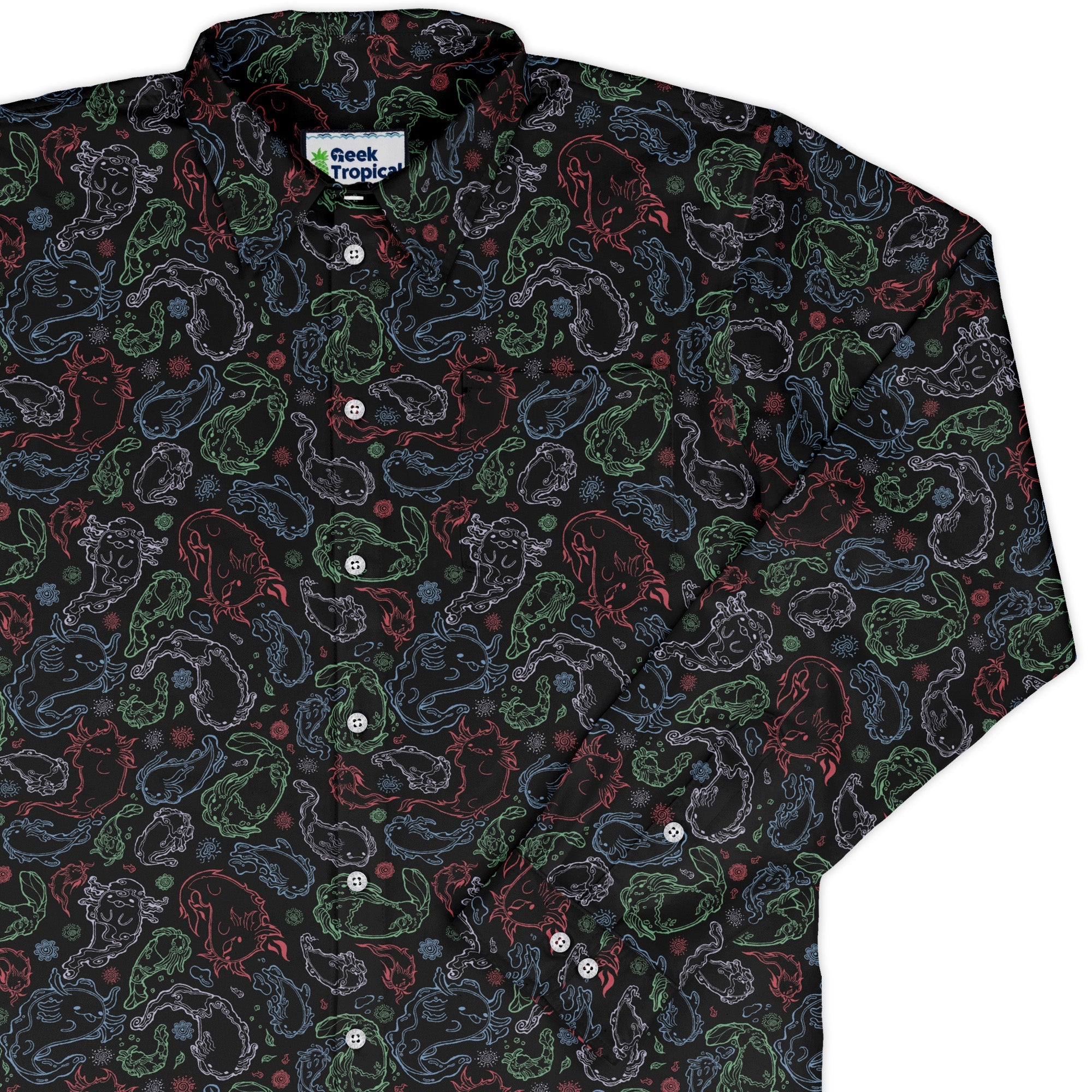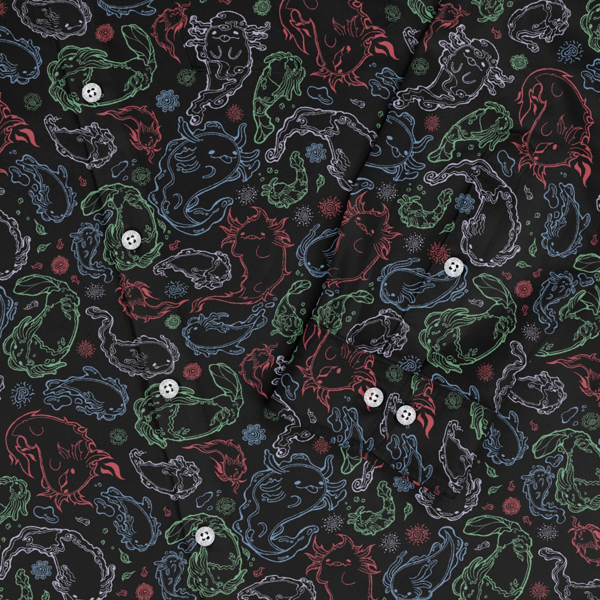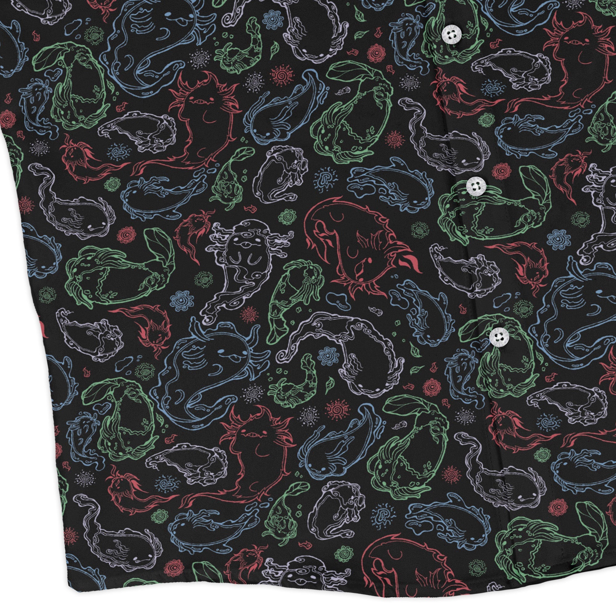 The Axolotl avatar state Long Sleeve Button Up Shirt channels serene power with an all-over field of transcendent axolotls drifting through ripples of energy on a dark, inky canvas. Subtle halos and wave rings sweep across panels and carry right over the chest pocket for a clean, uninterrupted read. Designed by Ardi Tong, it blends anime flair with crisp shirt vibes. Soft and breathable, printed with eco-conscious inks—equally ready for con floors, creative offices, and late-night ramen runs.
