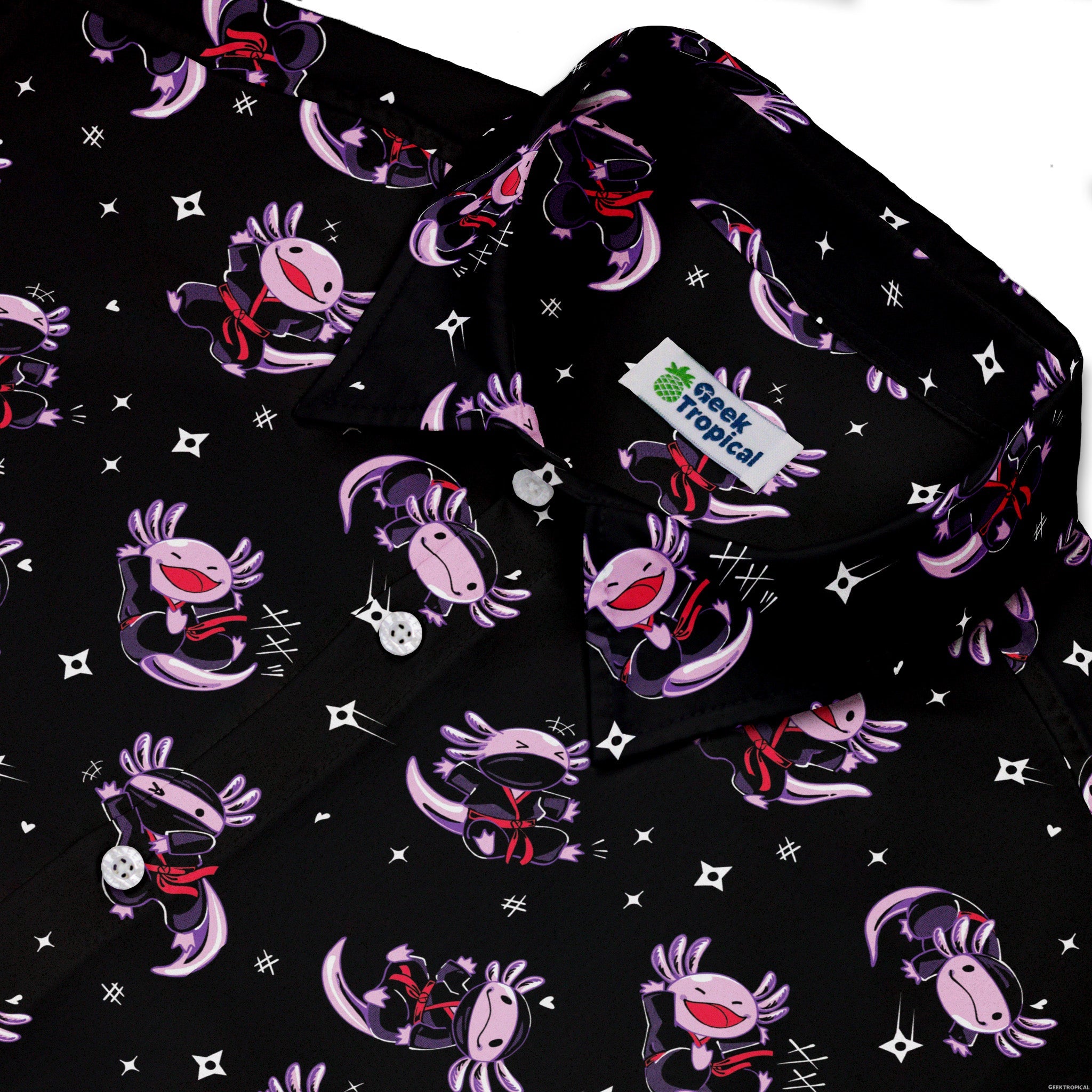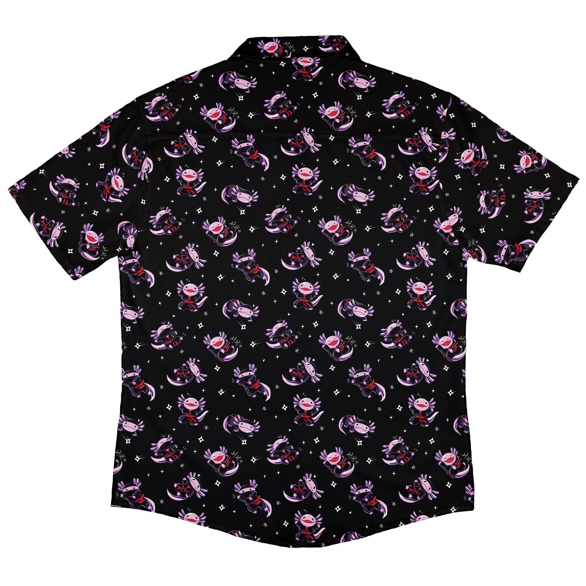 The Axolotl Ninjas Button Up Shirt slips into stealth mode with a cheeky all-over repeat of frilly-gilled axolotls practicing their sneaky moves, illustrated by Tobe Fonseca. Crisp button-up styling and unisex vibes pair with art that lines up cleanly across the front (and pocket, if you add it), keeping the pattern seamless. Artist-backed and eco-conscious, it’s your go-to for cons, casual Fridays, and covert snack runs.