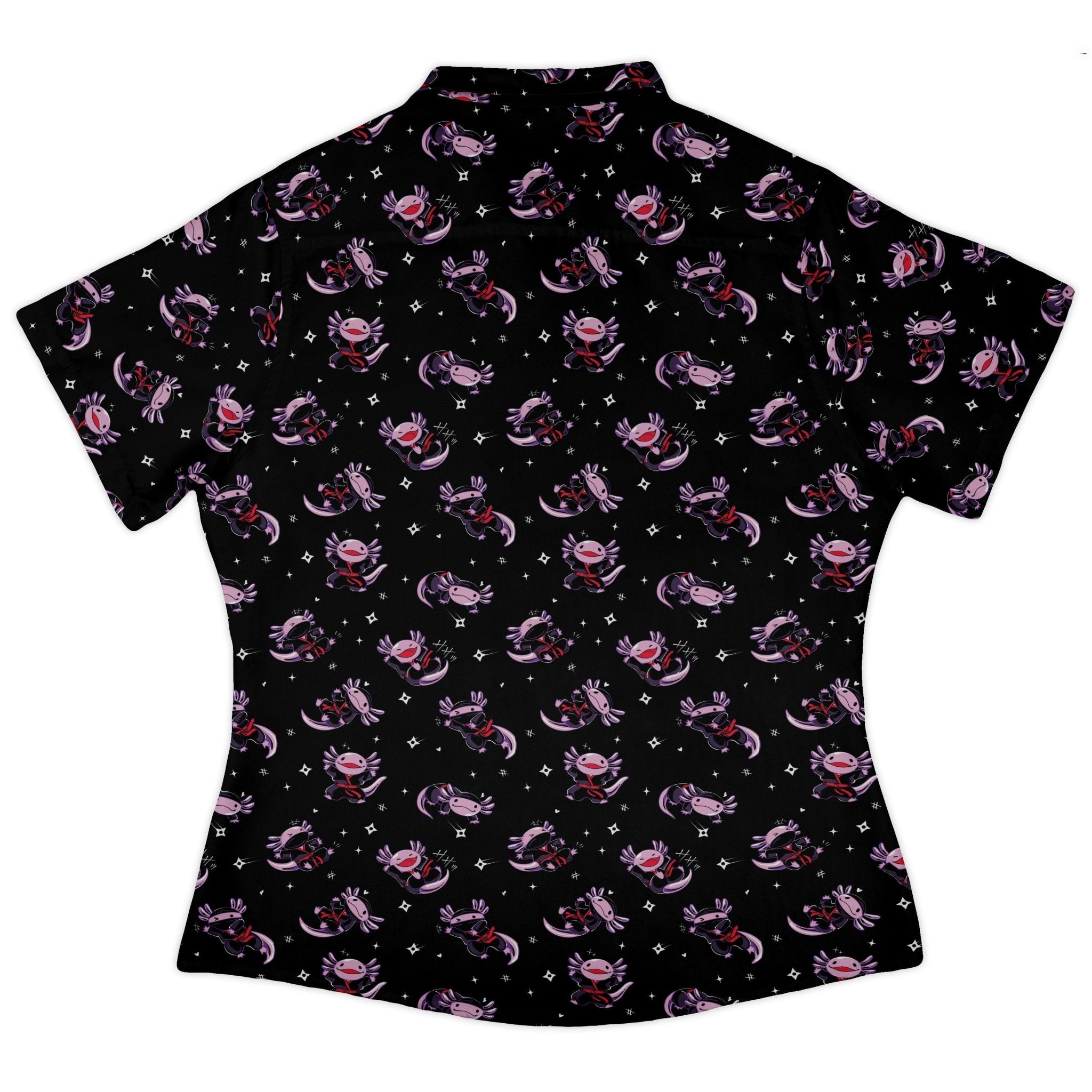 The Axolotl Ninjas Curvy Button Up Shirt brings covert charm to your closet with an all-over repeat of stealthy axolotls—masked, mischievous, and mid-maneuver—designed by Tobe Fonseca and bursting with maximalist energy. Tailored to celebrate curves, it bridges work and play with ease. The artwork lines up cleanly across the front and pocket, and it’s printed with eco-conscious inks for style that’s as smart as it looks.