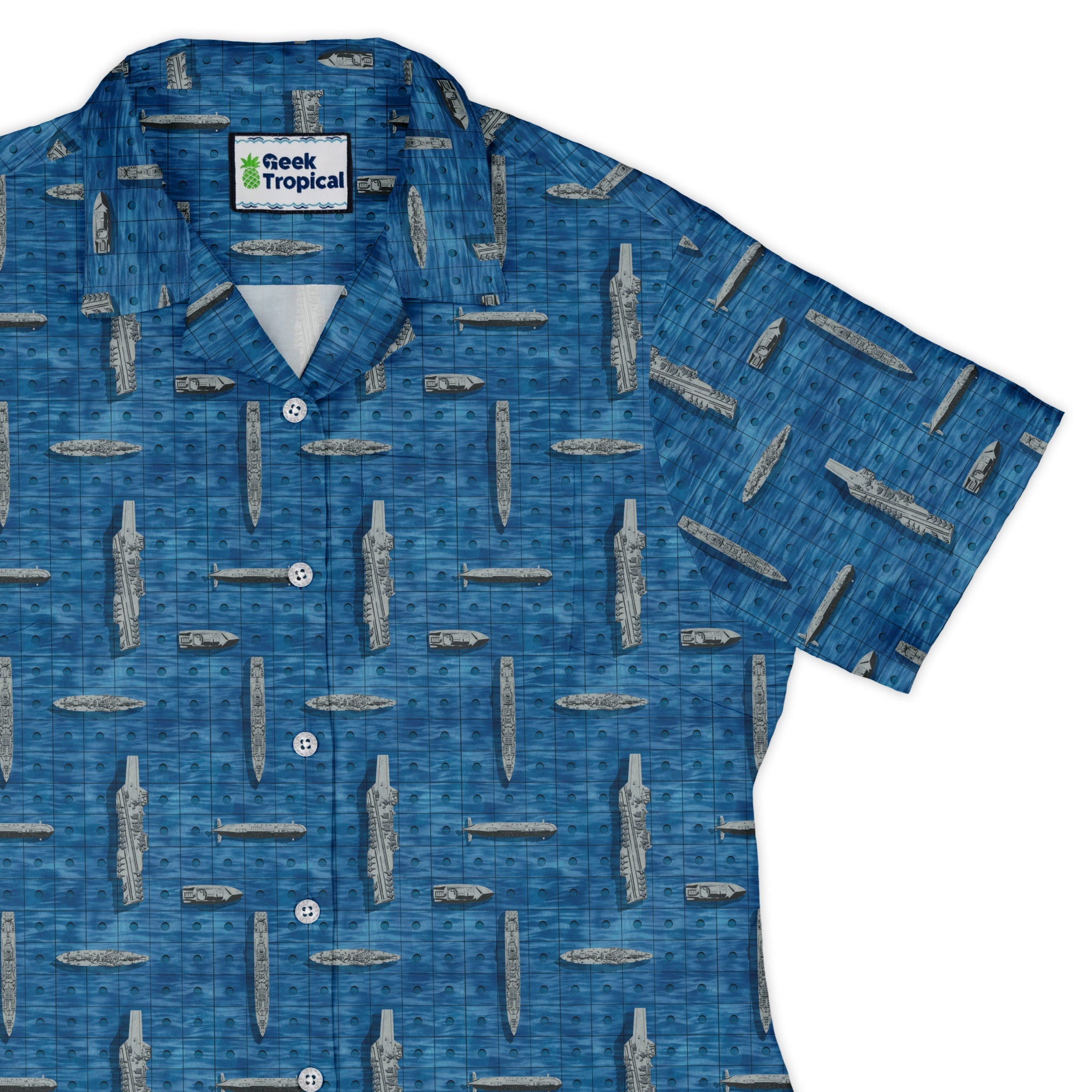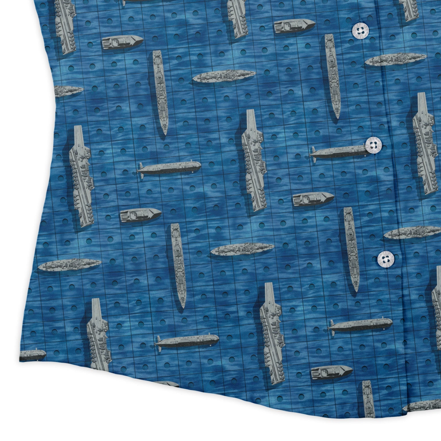 The Battleship Curvy Button Up Shirt turns classic tabletop strategy into wearable art, cut to flatter your curves. The print features a sea-blue coordinate grid with ship silhouettes and red/white hit and miss markers, flowing seamlessly across the pocket and placket for an uninterrupted look. Soft, lightweight, and easy to style—untucked stays polished. Finished with branded buttons and eco-conscious inks. Designed by Nathan, artist-backed.