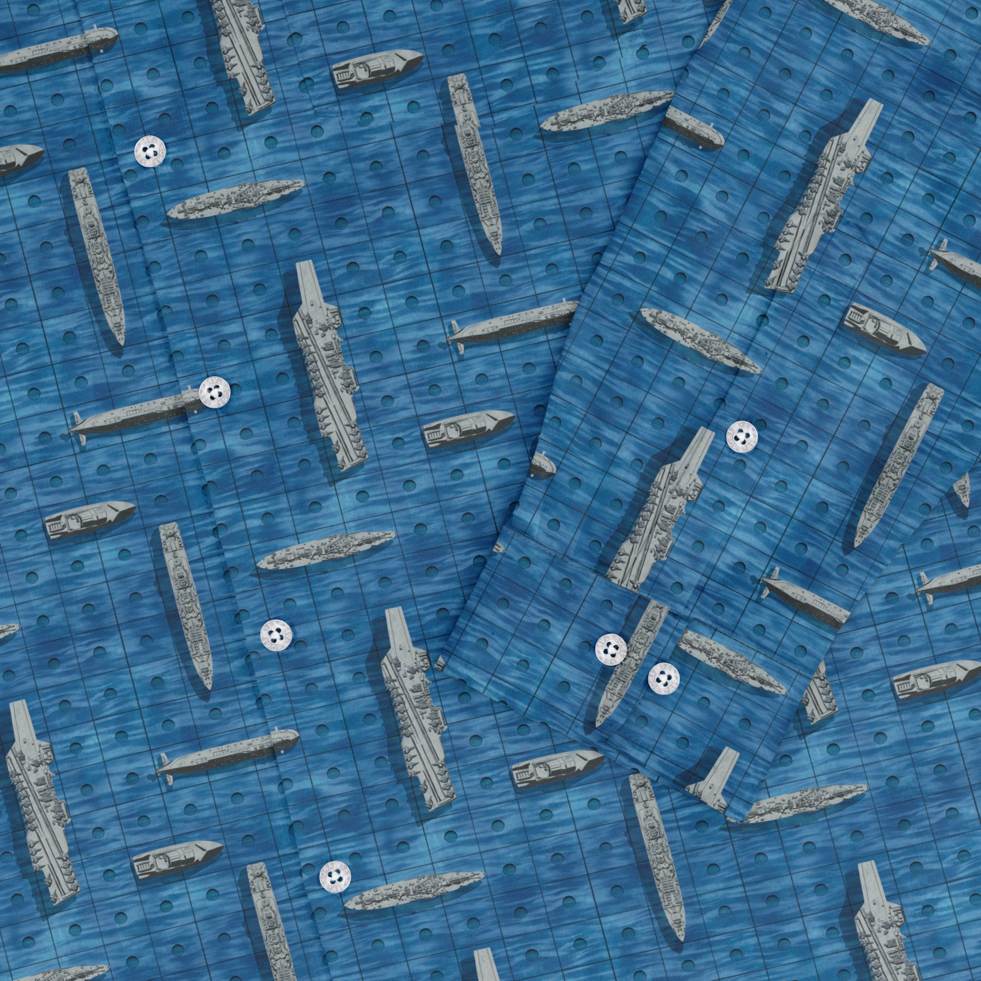 The Battleship Long Sleeve Button Up Shirt turns classic tabletop strategy into everyday style, with an all-over maritime grid and sleek ship silhouettes in oceanic tones. The print flows cleanly across the placket and pocket for a seamless look. Designed by Nathan, it pairs an easy, everyday fit with polished tailoring. Printed with eco-conscious inks, and your purchase supports licensed artists.