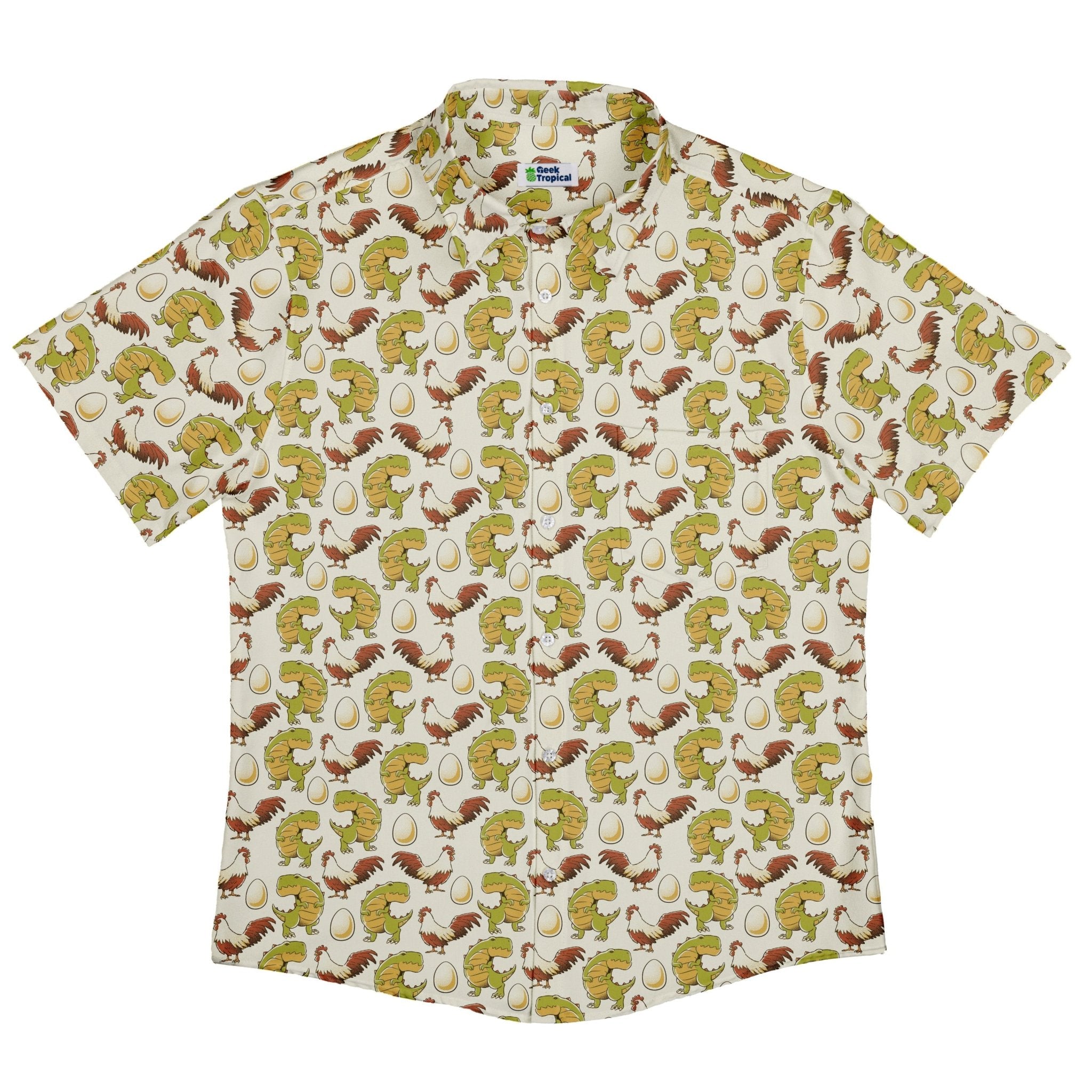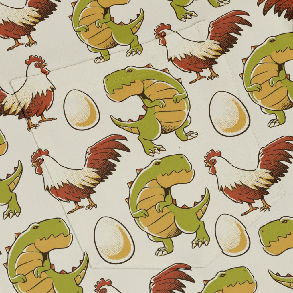 Before the Chicken Button Up Shirt evolves your look with a witty all-over dinosaur motif designed by Tobe Fonseca. Crisp, repeating prehistoric silhouettes march across a sleek, neutral ground—playful from afar, geek-smart up close. A unisex staple with weekend humor and polished vibes, this artist-backed piece brings curious minds a clean, conversation-starting print. Science-forward energy, grown-up polish.