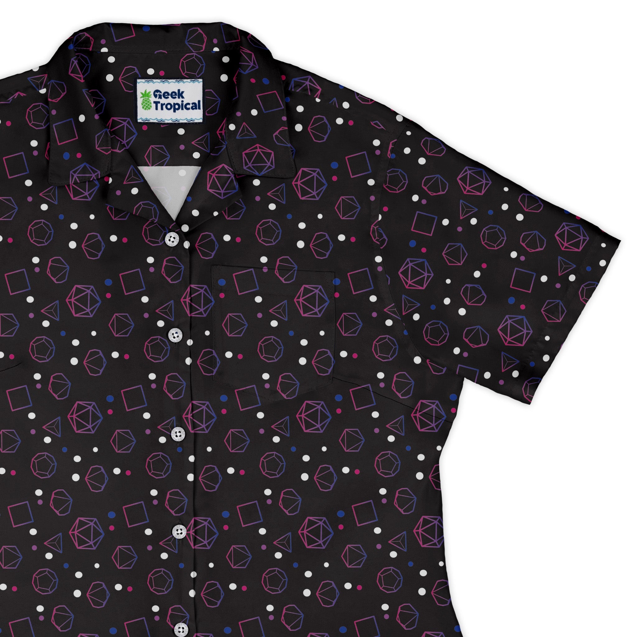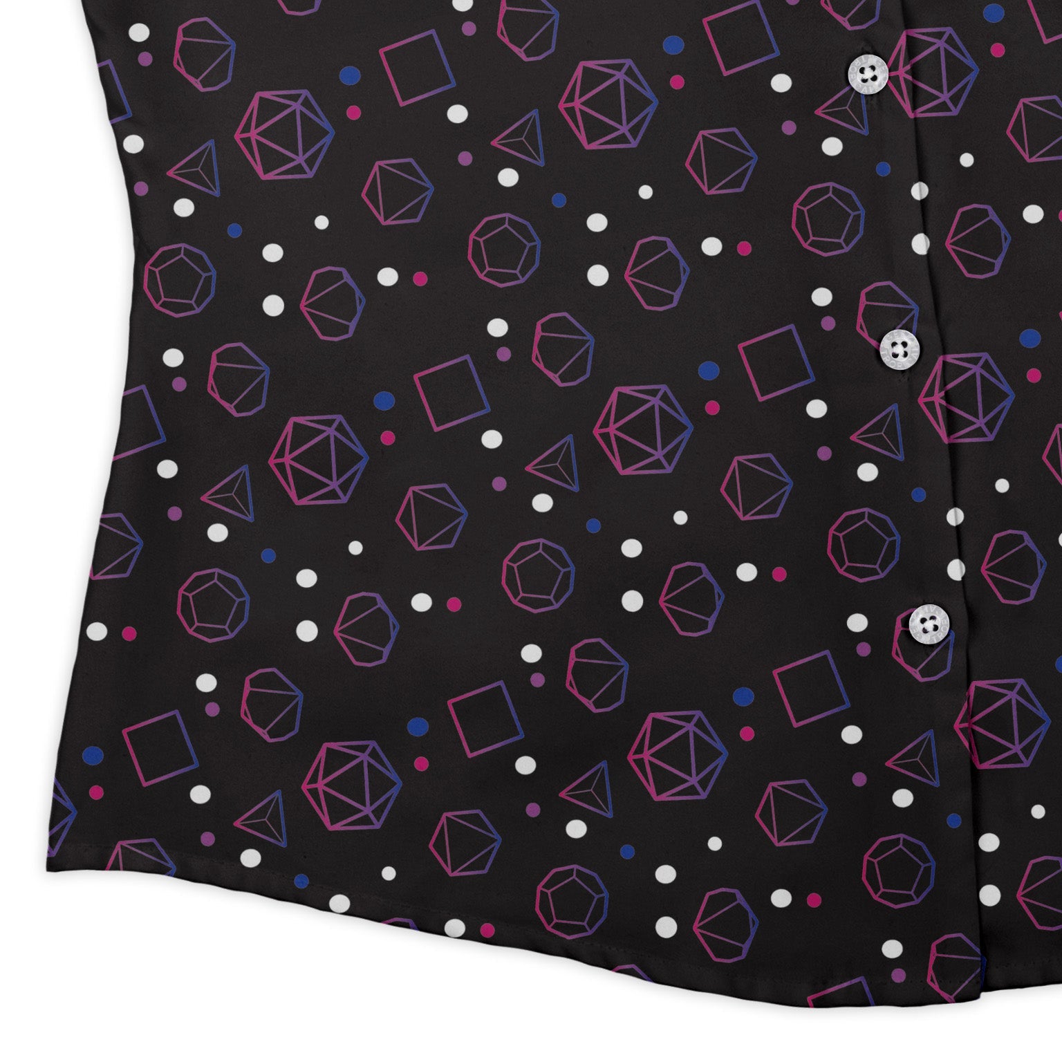 Roll high on style and visibility in the Bisexual Pride Flag Dnd Dice Curvy Button Up Shirt, where bi-flag pink, purple, and blue meet a field of Dnd dice. Cut to celebrate curves with a neat, rounded hem that looks great untucked, it moves from game night to brunch. The artwork aligns across the placket and pocket, with crisp branded buttons, adjustable sleeves, and sustainably printed color. Designed by Heather Davenport and artist-backed.