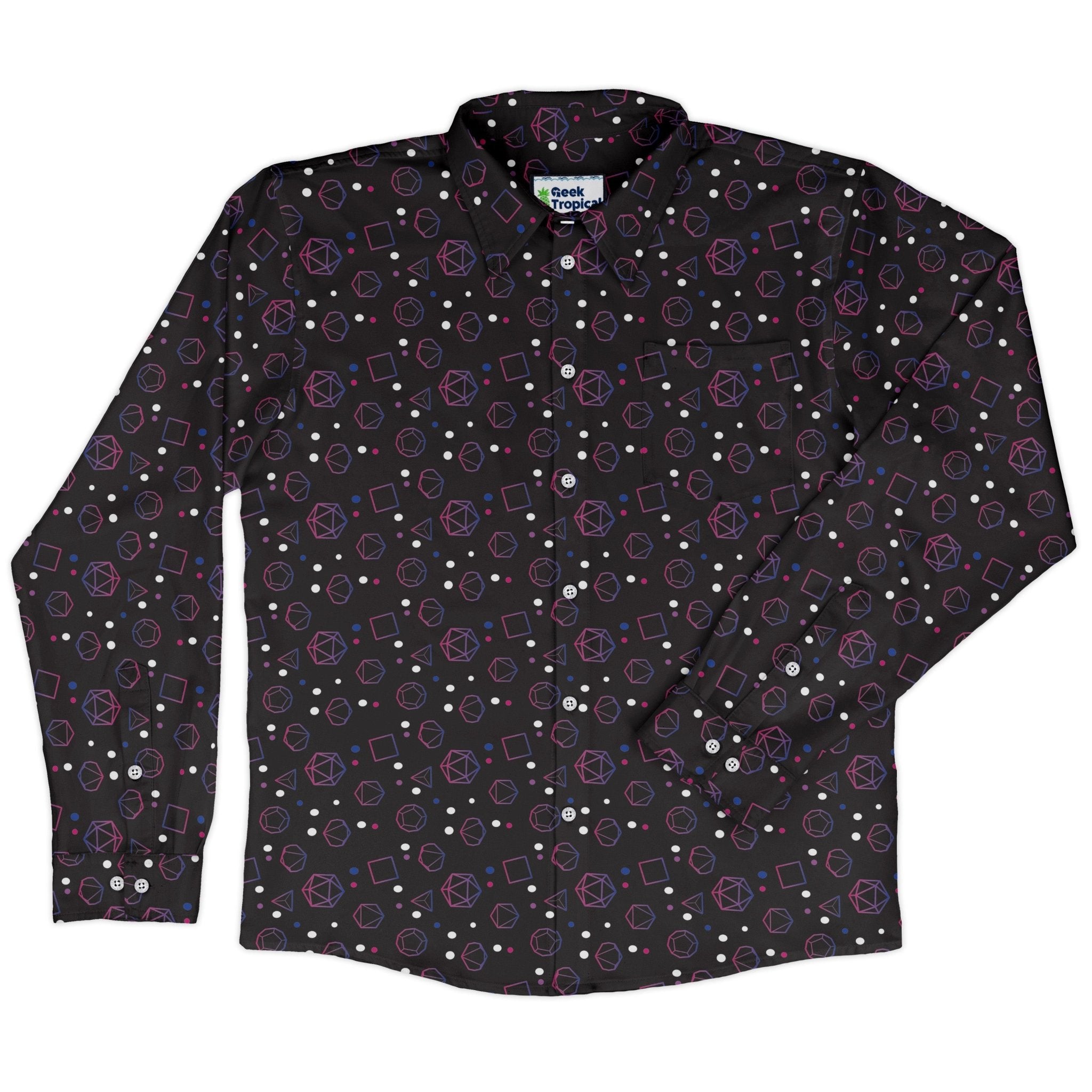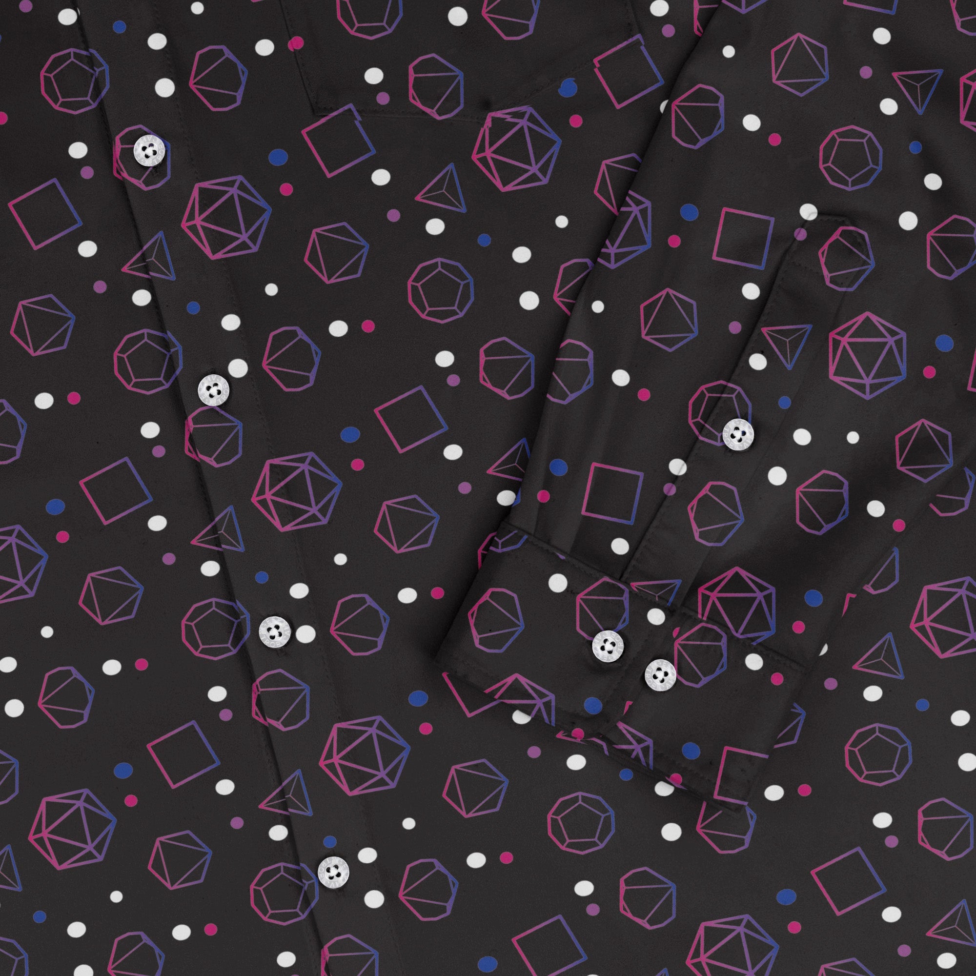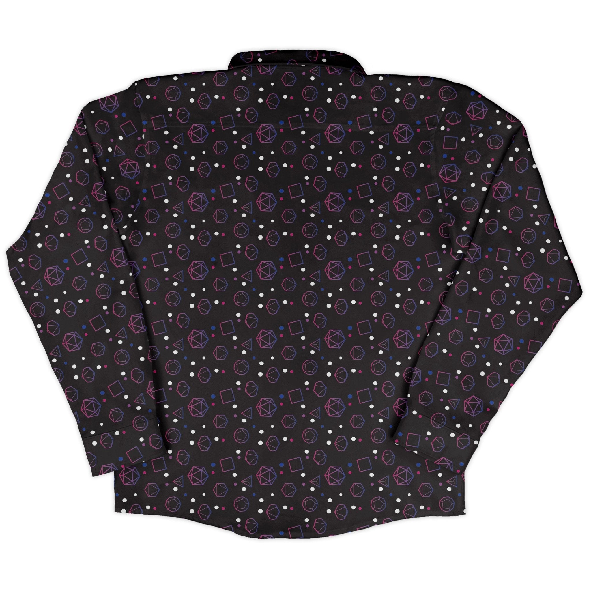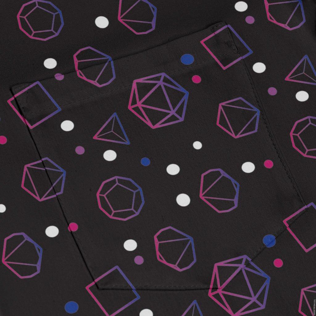 Bring charisma and color to the table with the Bisexual Pride Flag Dnd Dice Long Sleeve Button Up Shirt. Designed by Heather Davenport, this all-over print blends bold pink, purple, and blue bi-flag hues with a cascade of Dnd dice for a look that crits on style. Thoughtfully crafted for long sessions and everyday wear, it's artist-backed and eco-minded, so you can rep your pride and your party with zero compromise.