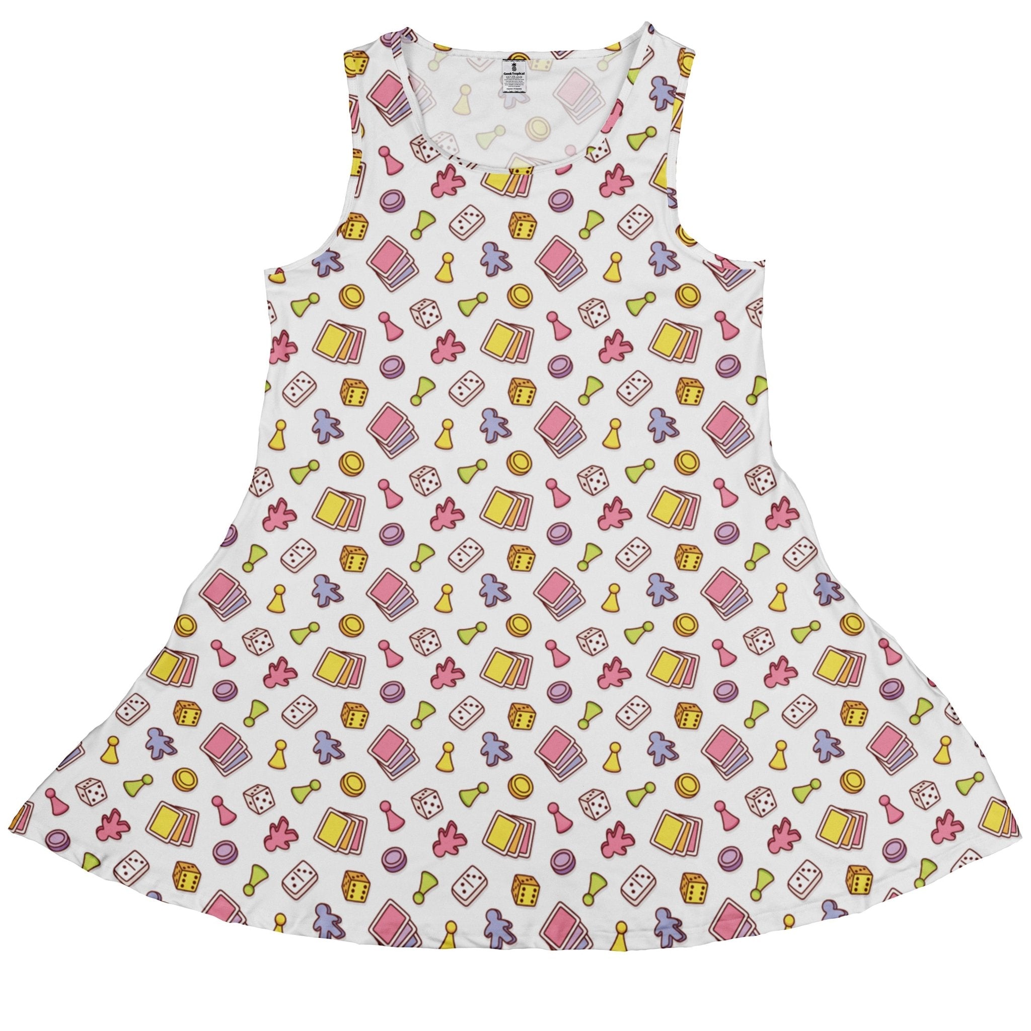 Board Game Objects Meeples White Dress puts your favorite token front and center. A crisp white canvas is sprinkled with playful meeple silhouettes in an allover repeat, keeping the look bright, tidy, and unmistakably tabletop. The silhouette feels laid-back yet polished, with real side pockets that carry more than just lip balm. Soft, breathable, and opaque, it’s an artist-backed staple for game night or everyday quests.