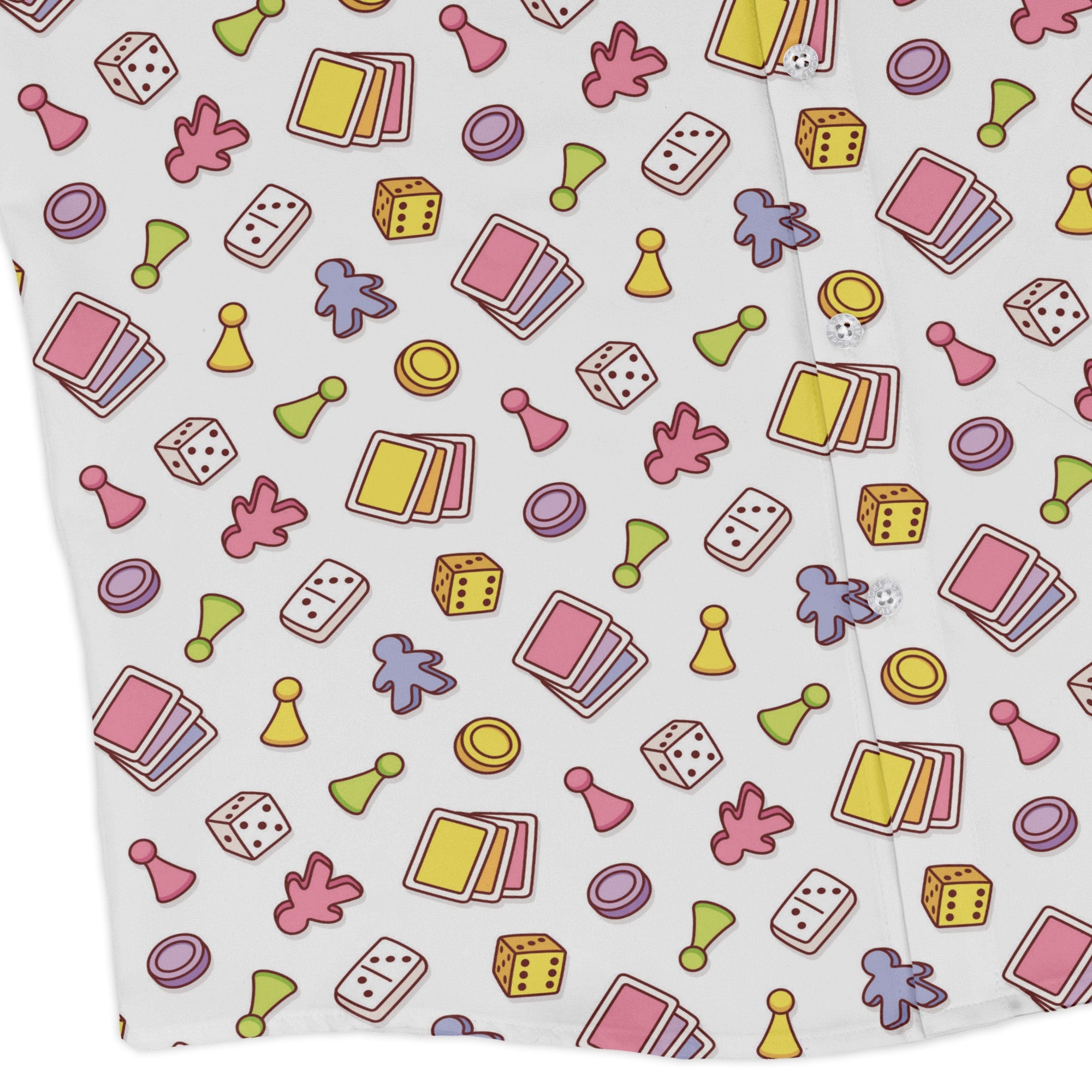 Level up your game-night style with the Board Game Objects Meeples White Long Sleeve Button Up Shirt from Geek Tropical. A crisp white canvas is dotted with colorful meeples, arrayed in a tidy all-over pattern that even lines up across the chest pocket. Soft, breathable comfort with a regular-meets-relaxed silhouette and cuffs you can dial in. Finished with signature buttons and eco-conscious inks, this artist-backed print broadcasts pure board-game love.