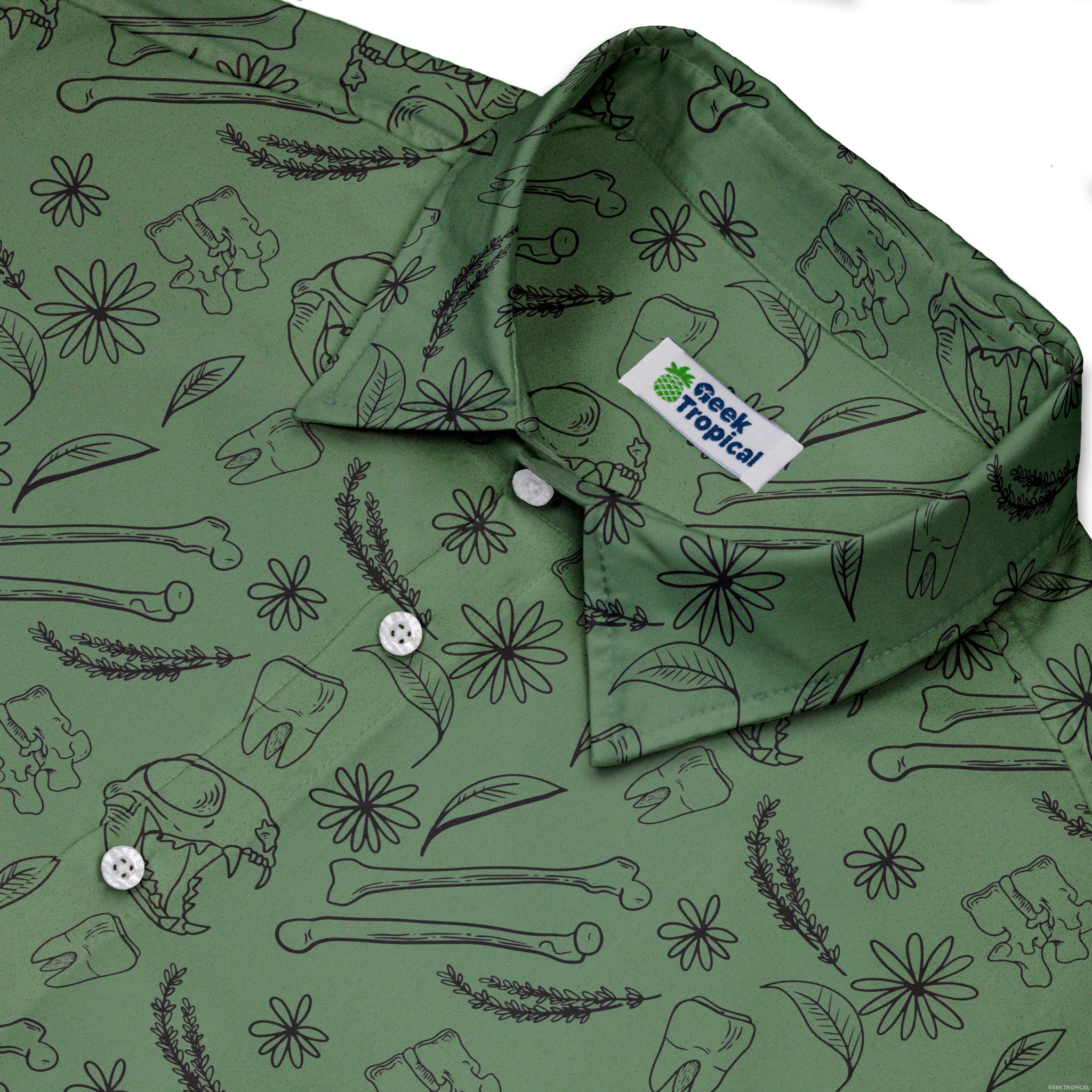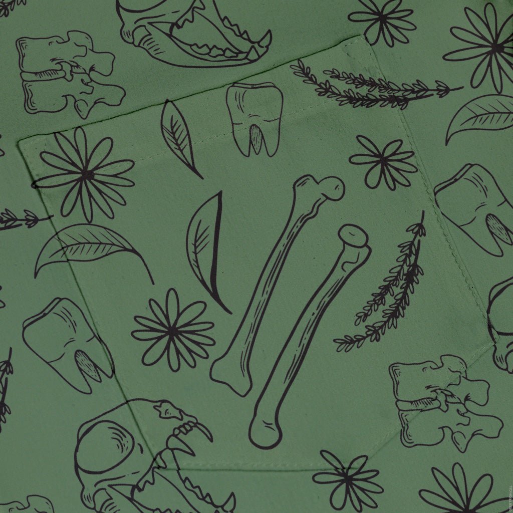 Meet the Bones and Flowers Green Button Up Shirt, where botany class flirts with anatomy lab. On a rich green field, ivory bones weave between blooming stems and delicate leaves, rendered with specimen-level linework and subtle shading. It’s smart, a little macabre, and totally wearable for work or weekend. Designed by Heather Davenport and proudly artist-backed—science style you can wear anywhere.
