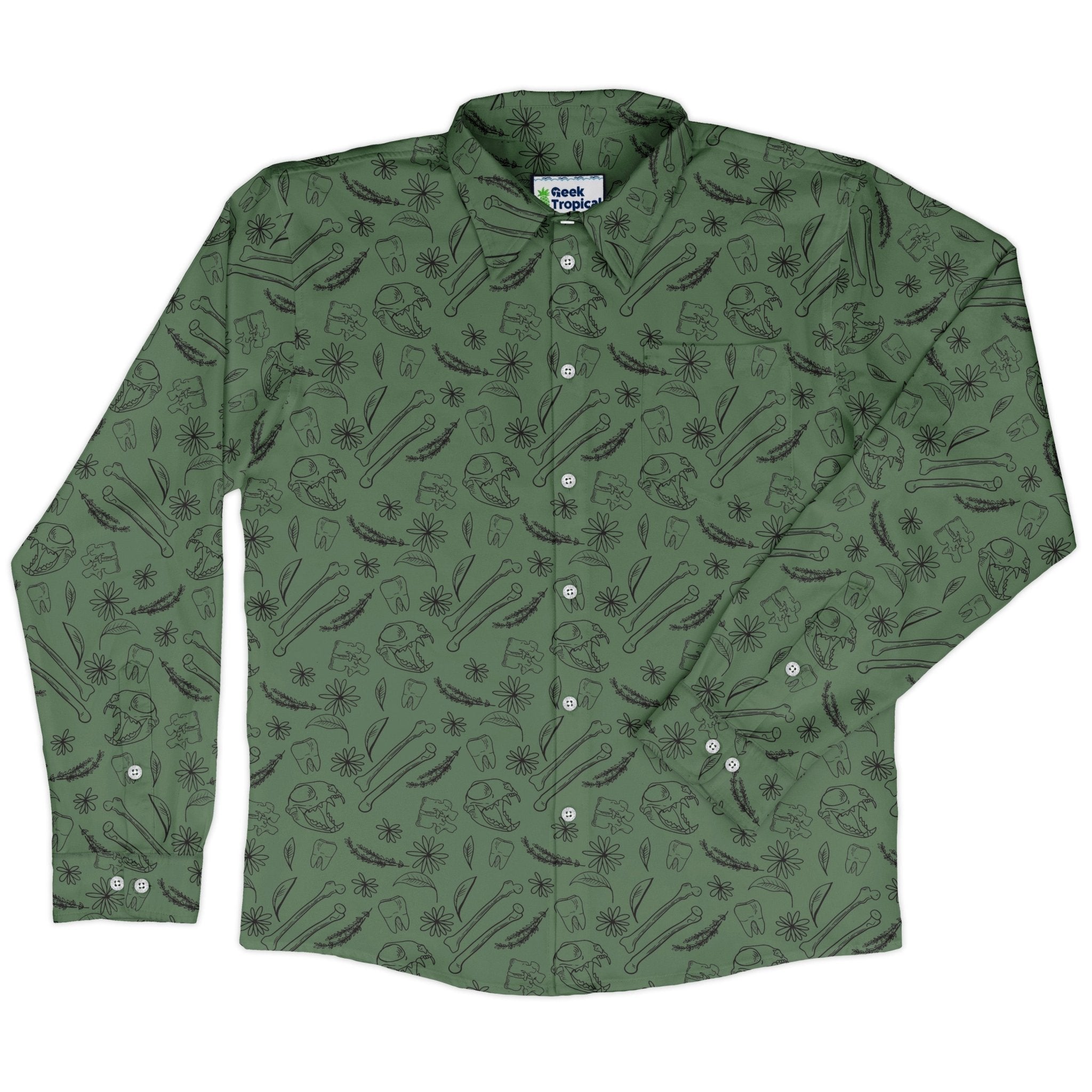 Bones and Flowers Green Long Sleeve Button Up Shirt