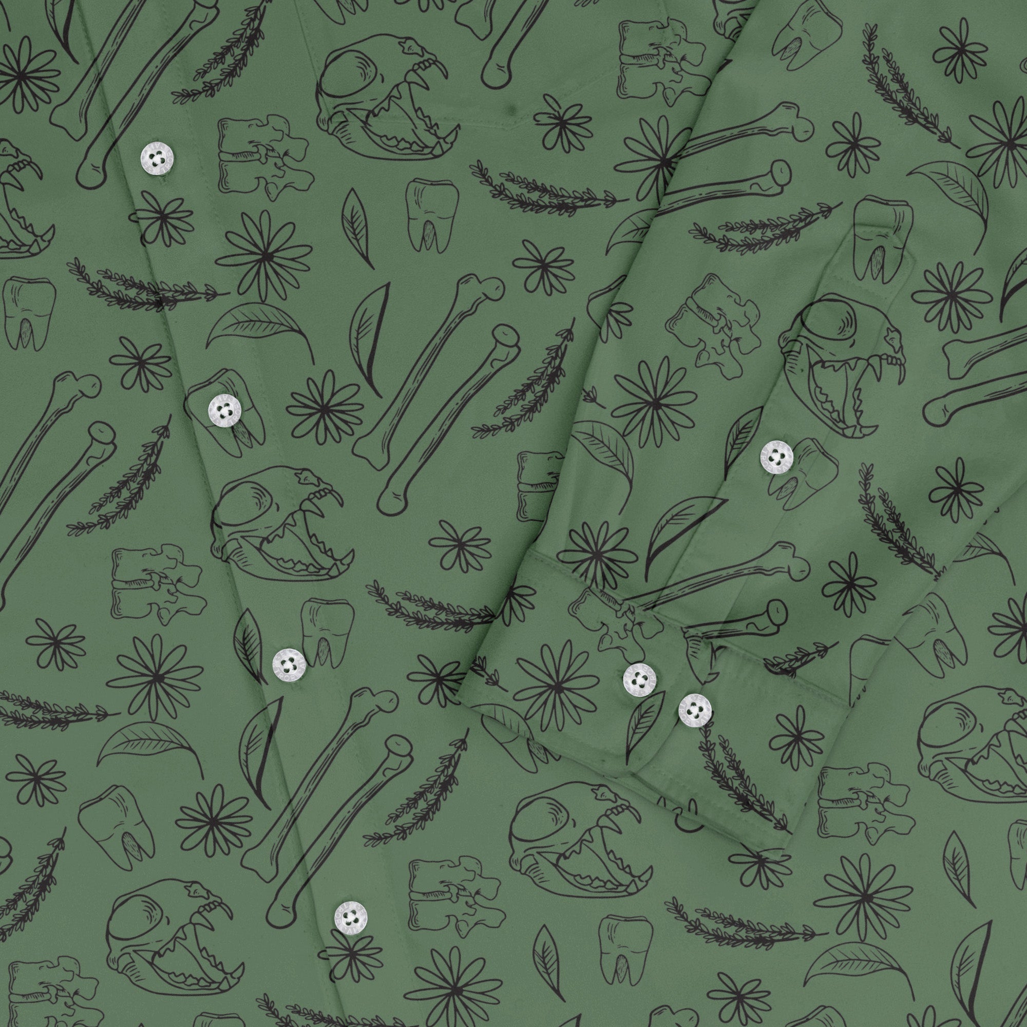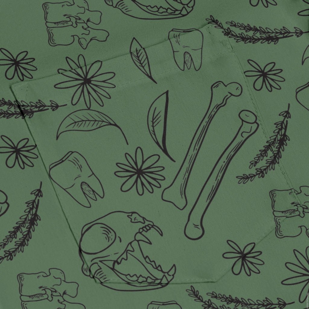 The Bones and Flowers Green Long Sleeve Button Up Shirt blends botanical romance with a dash of anatomy. On deep green, finely drawn bones weave through lush florals and leafy sprigs, striking a crisp contrast that feels smart and a little mischievous. Designed by Heather Davenport, this artist-backed staple moves from lab to lounge to date night with geeky confidence.