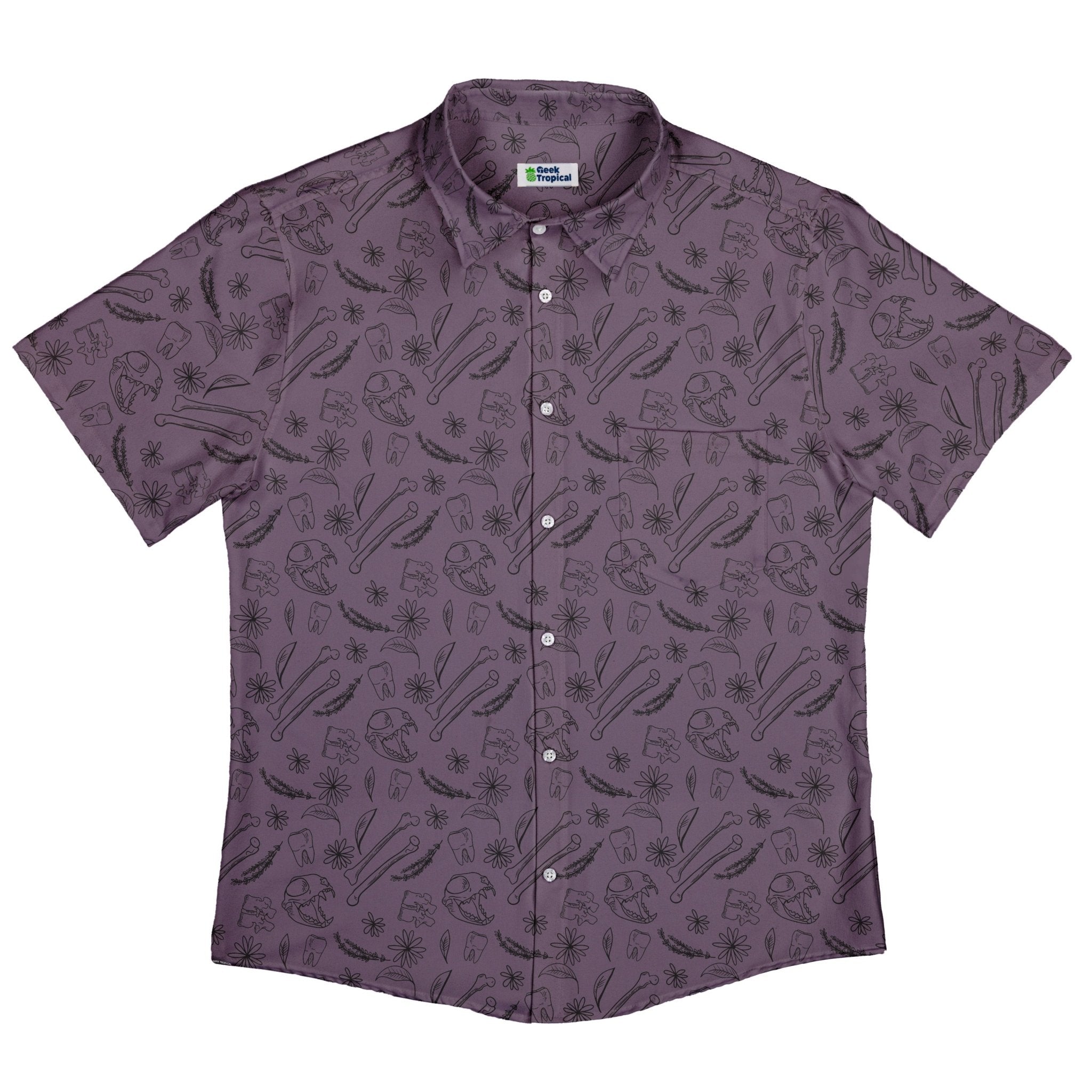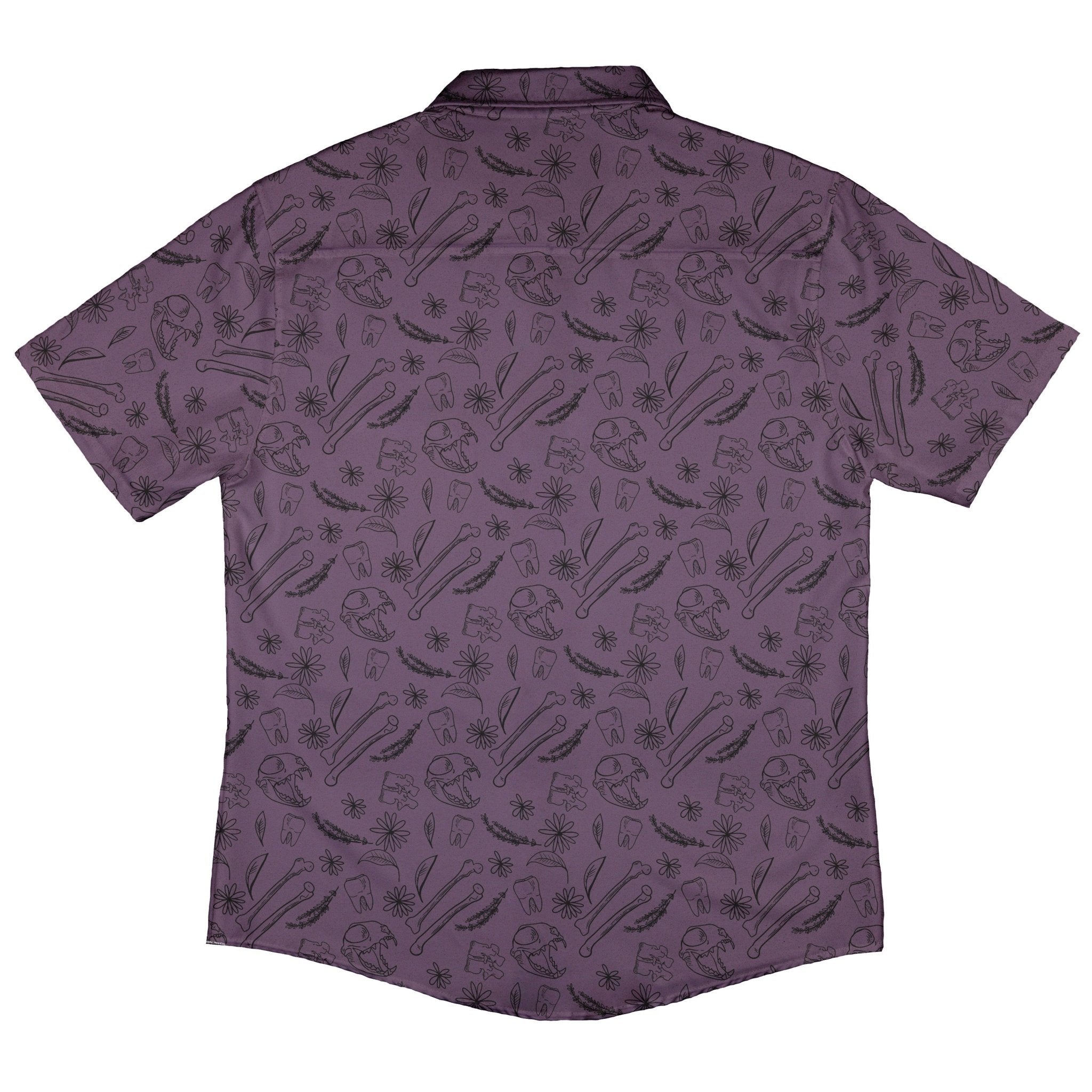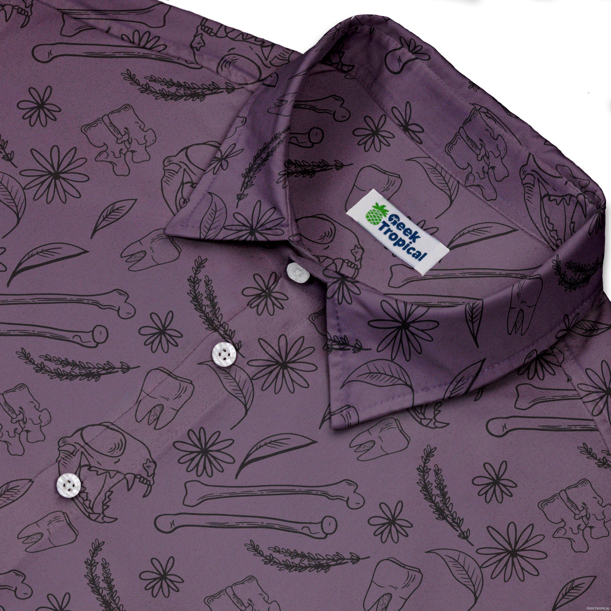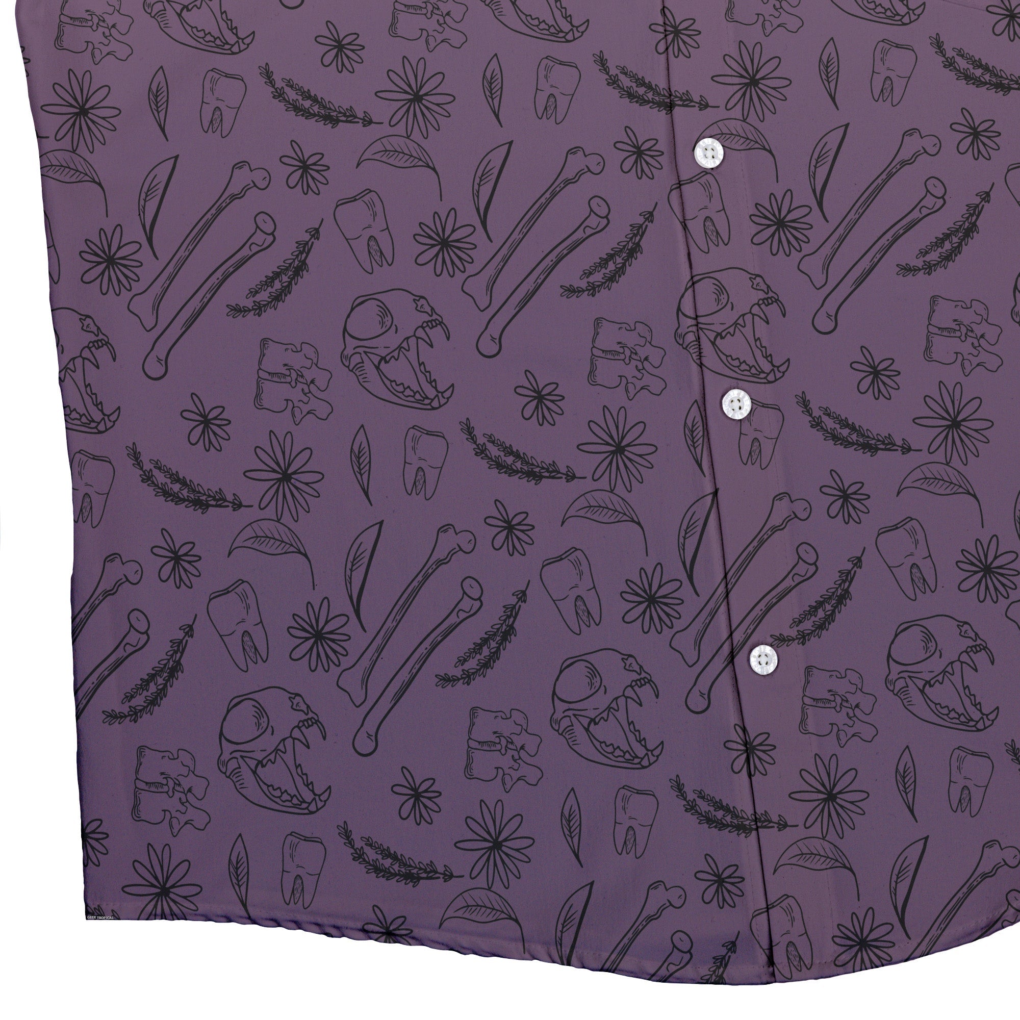 Bones and Flowers Purple Button Up Shirt brings botany and anatomy into vivid harmony on a deep purple field. Crisp skeletal linework intertwines with lush florals, giving study-session energy with date-night polish. Designed by Heather Davenport, the artwork flows cleanly across the front for a seamless look. Soft, breathable comfort, eco-minded printing, and an easy unisex vibe make this your go-to science print.