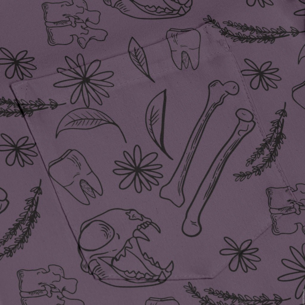 Meet the Bones and Flowers Purple Long Sleeve Button Up Shirt, a lush botany-meets-anatomy study for your wardrobe. On deep violet, ivory bones intertwine with detailed blossoms for a high-contrast, maximalist pattern that flows cleanly across the front and pocket. Smart long sleeves with tweakable cuffs keep it polished. Artist design by Heather Davenport, printed with eco-conscious inks for style with brains.