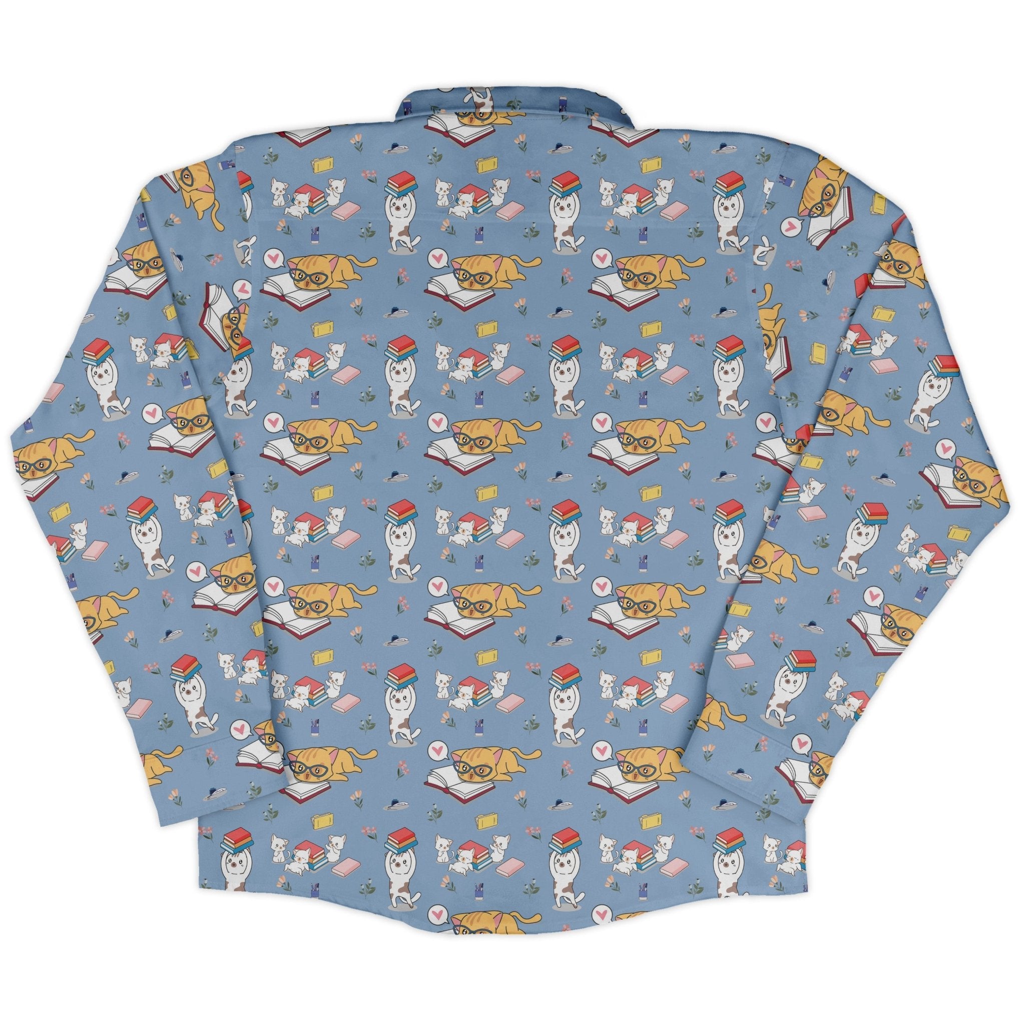 Meet the Book Nerd Cats Long Sleeve Button Up Shirt, your new uniform for story time and study breaks. An allover pattern of curious cats and book stacks turns your shelf love into streetwear. Soft and breathable for page-turning days, with a clean, tailored vibe that dresses up or down. Printed with eco-conscious inks and created in partnership with licensed artists—so every wear supports the creatives behind the whiskers.