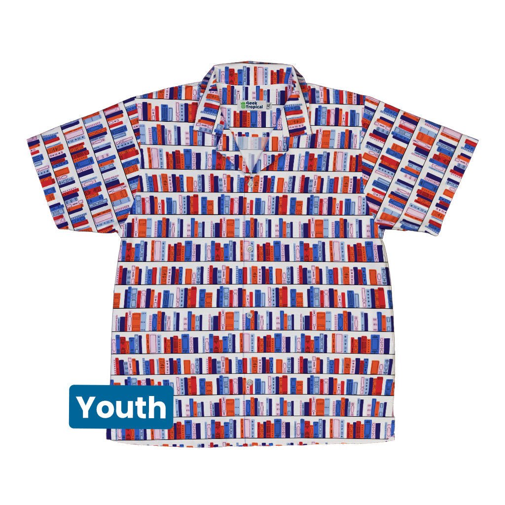 The Book Shelf Youth Hawaiian Shirt is a page‑turner of a print, with neat rows of colorful book spines wrapping the shirt like a vibrant bookshelf, set on a breezy camp‑collar silhouette. Designed by Zirkus Design, the all-over pattern lines up across the front for a clean, seamless shelf look. Soft and light with a cool, airy drape, it keeps young readers comfy from recess to reading club. Printed with eco-conscious inks and artist-supported, it lets your kid wear library pride everywhere.