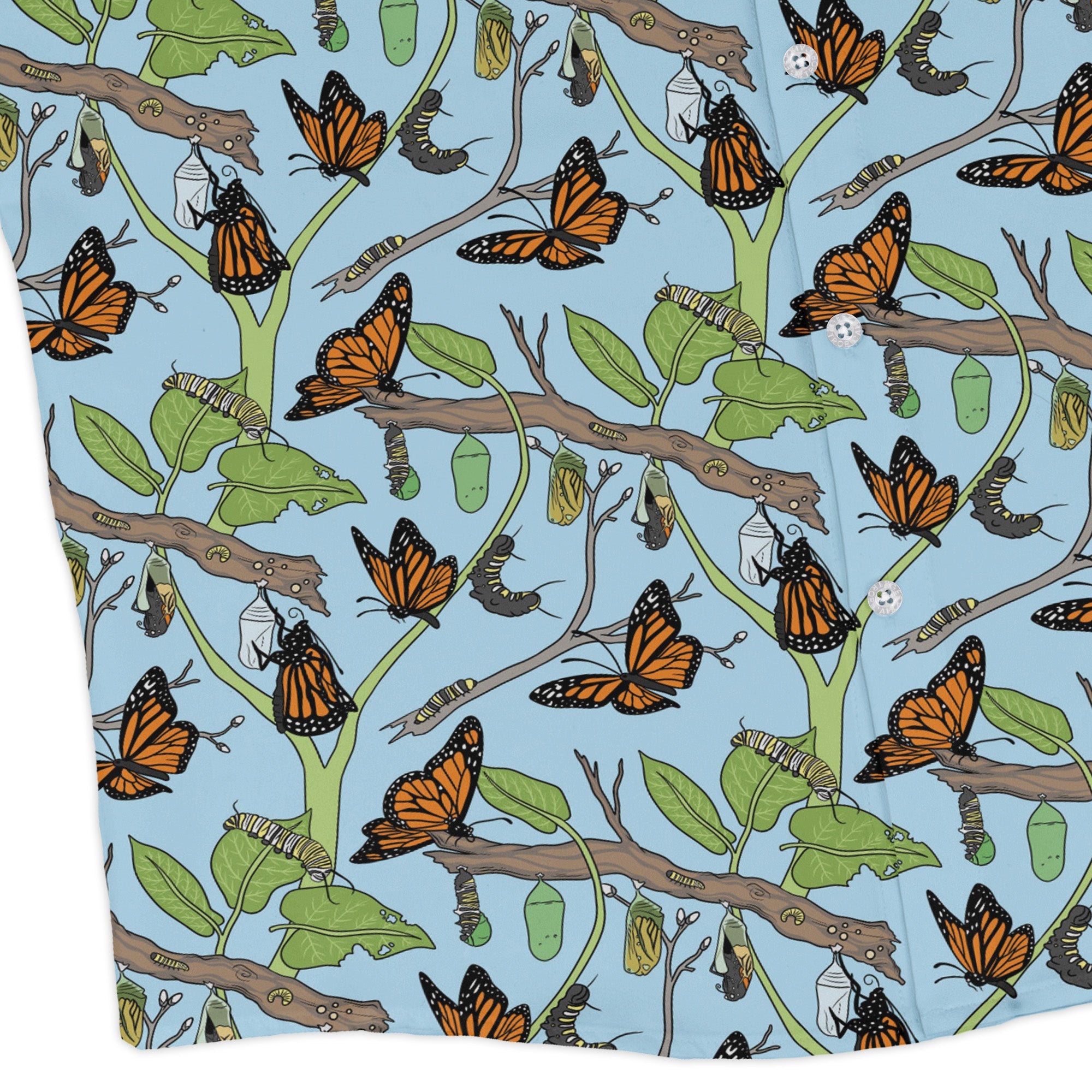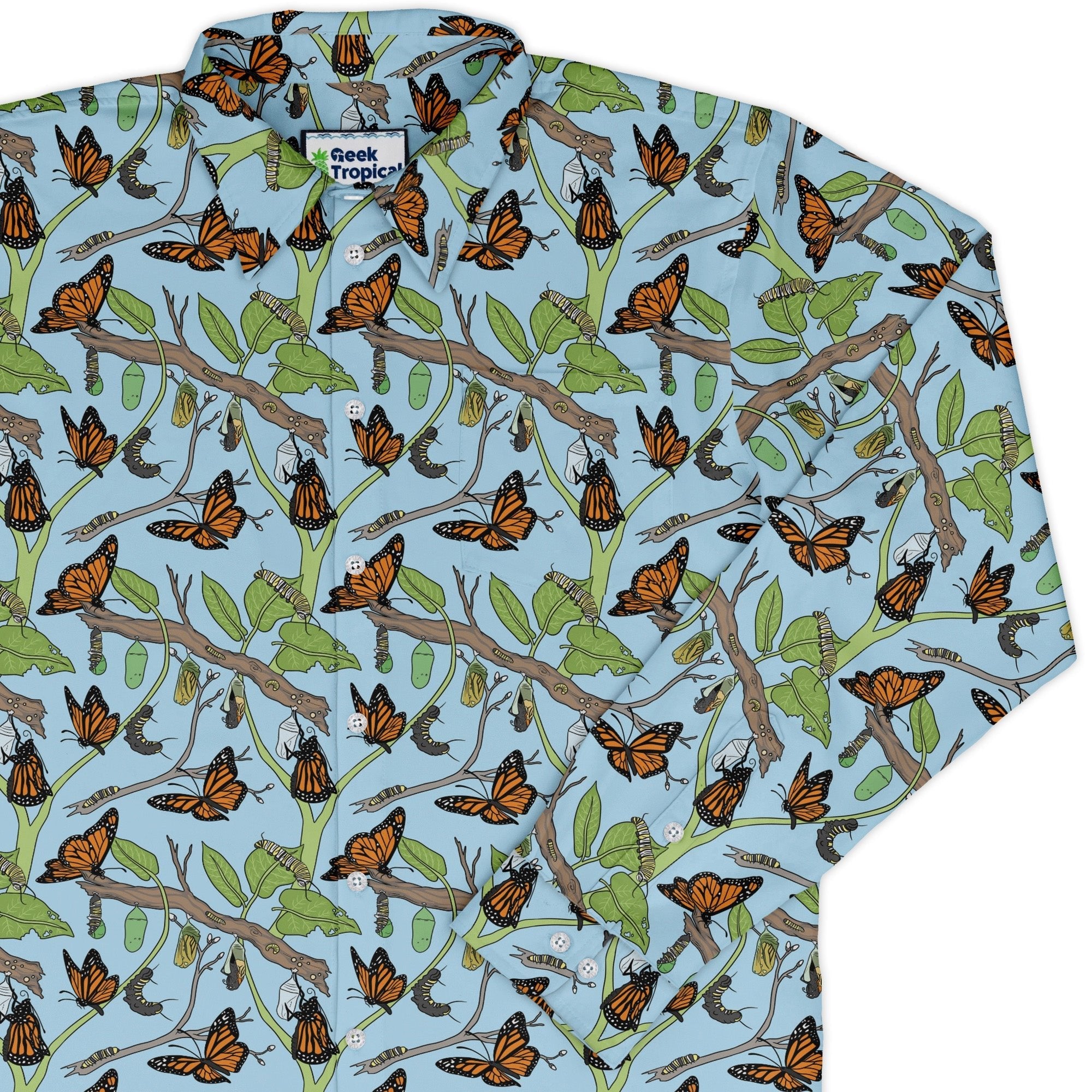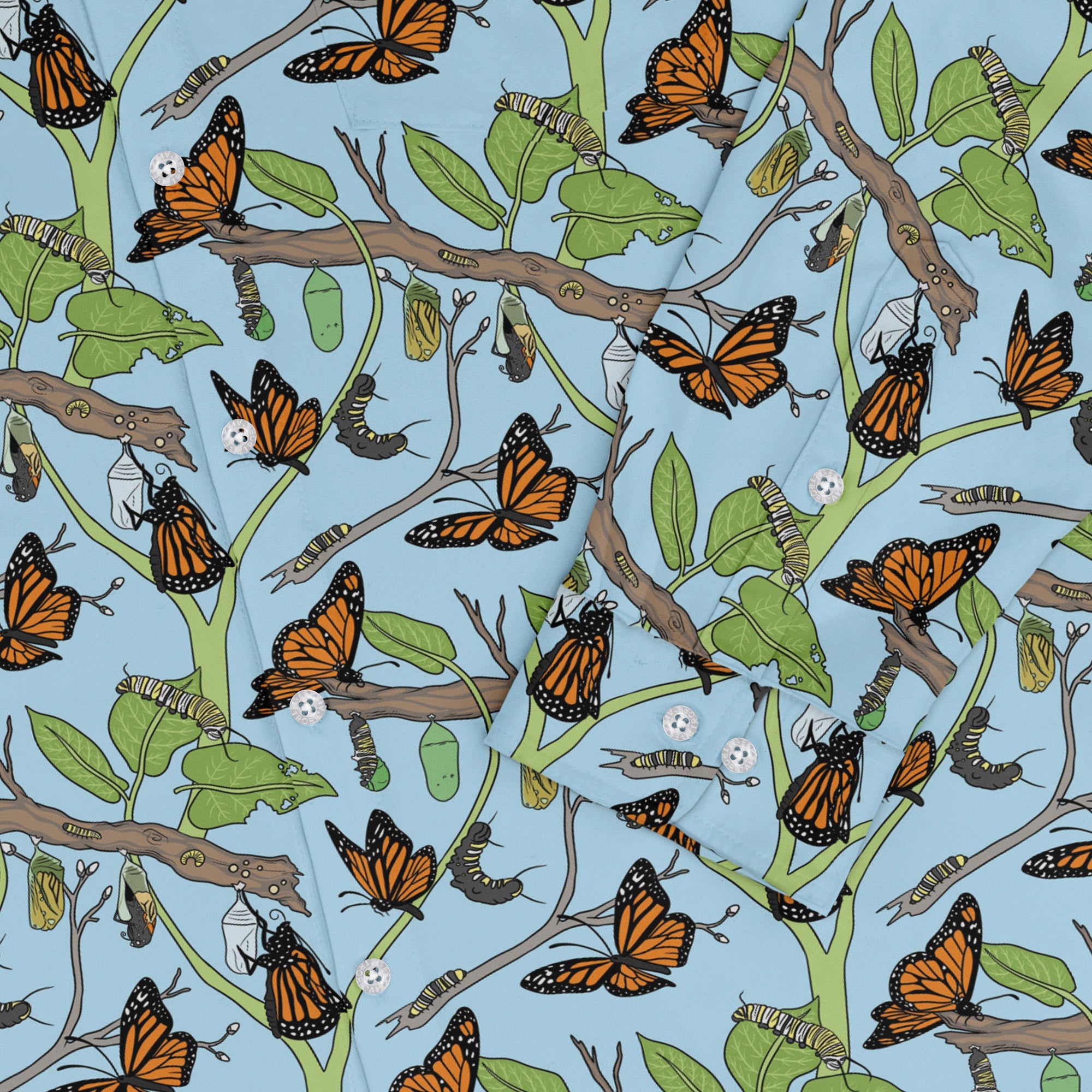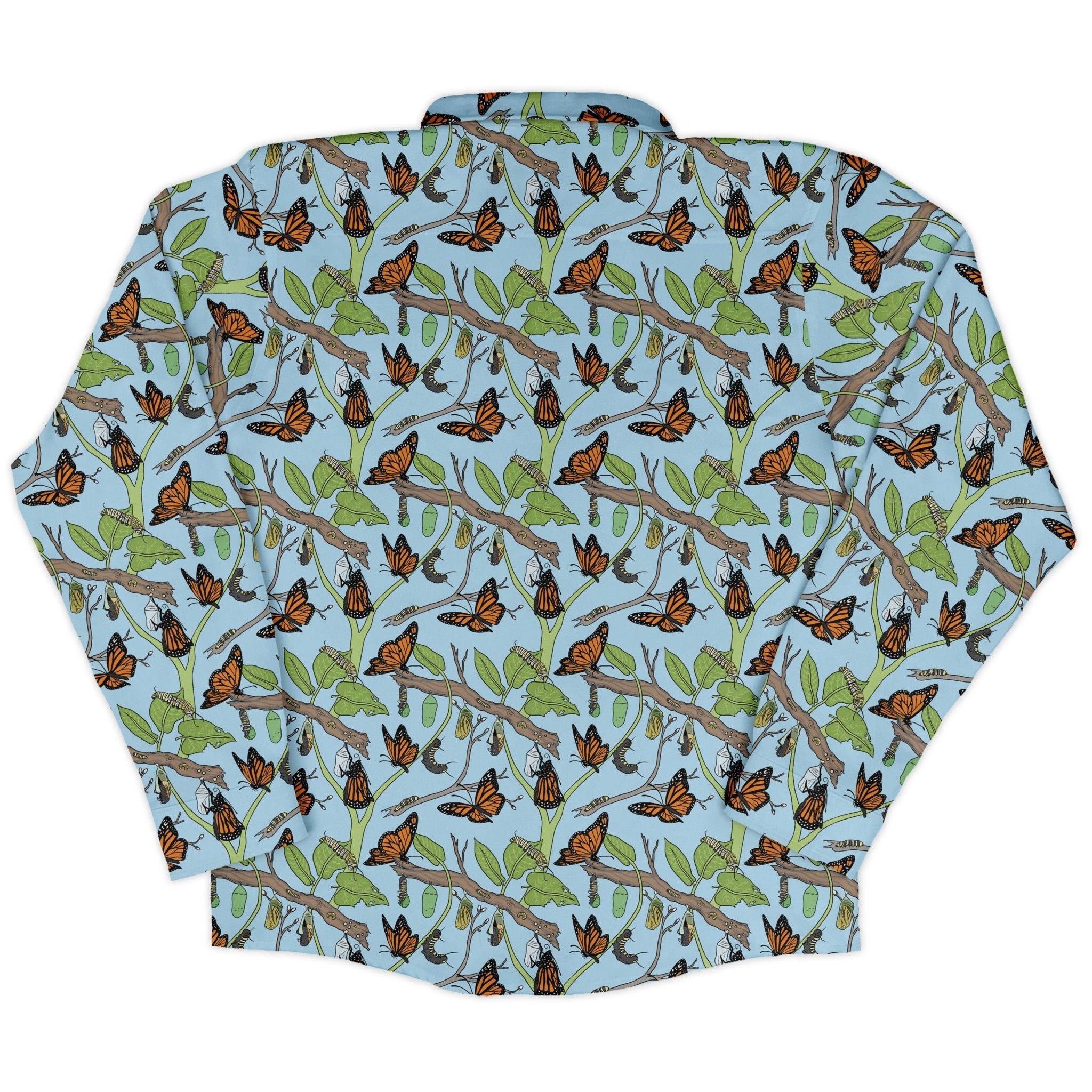The Butterfly Cycle Long Sleeve Button Up Shirt turns entomology into everyday style, featuring a field-guide collage of butterflies, caterpillars, and chrysalises nestled among delicate botanical botanicals. Designed by Julie Kitzes, the all-over artwork feels smart and polished, flowing cleanly across the placket and chest pocket. Artist-backed and printed with eco-conscious inks—equally at home in the office, the lab, or your next nature walk.