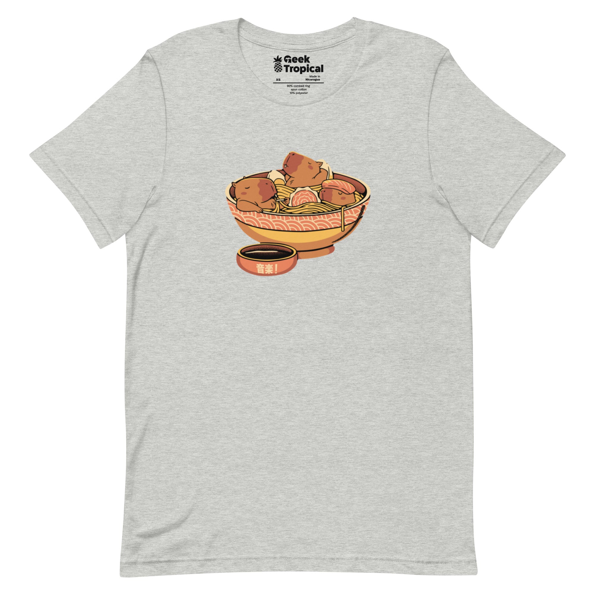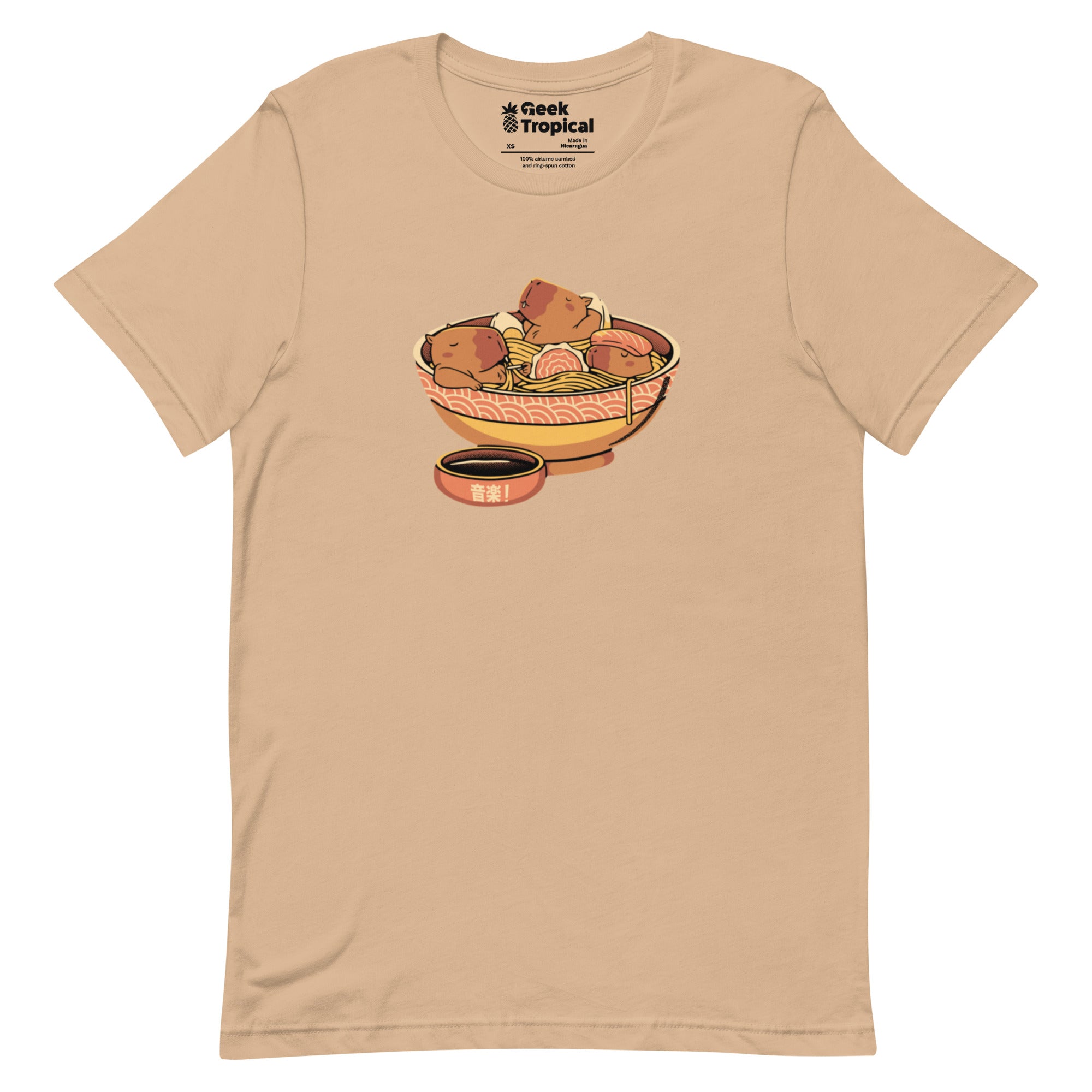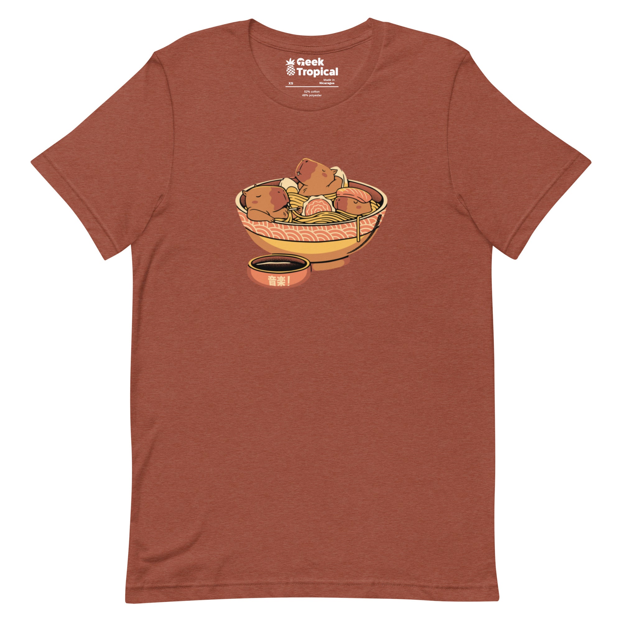 Capybara Cute Ramen T-Shirt serves slurpable serenity: a relaxed capybara cozies up to a steaming ramen bowl, illustrated in Tobe Fonseca’s playful linework and charming textures. A wink of foodie humor meets gentle kawaii vibes—perfect for noodle nights, con life, and low-key flexing your animal-nerd heart. Artist-backed, printed with eco inks for crisp, lasting color.