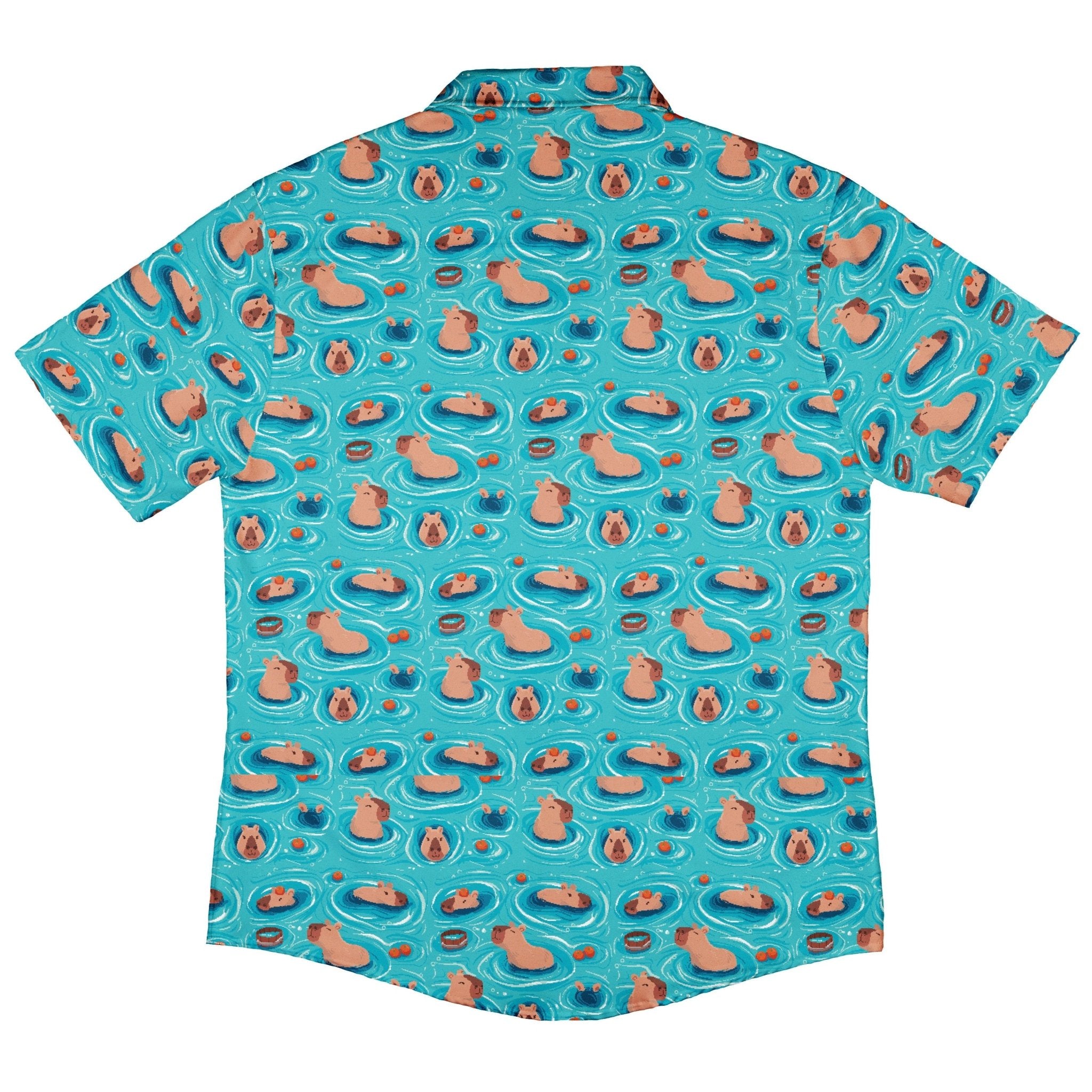 The Capybara Springs Button Up Shirt turns chill into a lifestyle: an all-over panorama of relaxed capybaras drifting through calm spring water, traced with gentle ripples and flowing lines. Seam-matched artwork carries cleanly across the front for a polished look. Unisex and easygoing for park hangs or con days, this piece was designed by Claire Murphy and printed with eco-minded inks that help support the artist.
