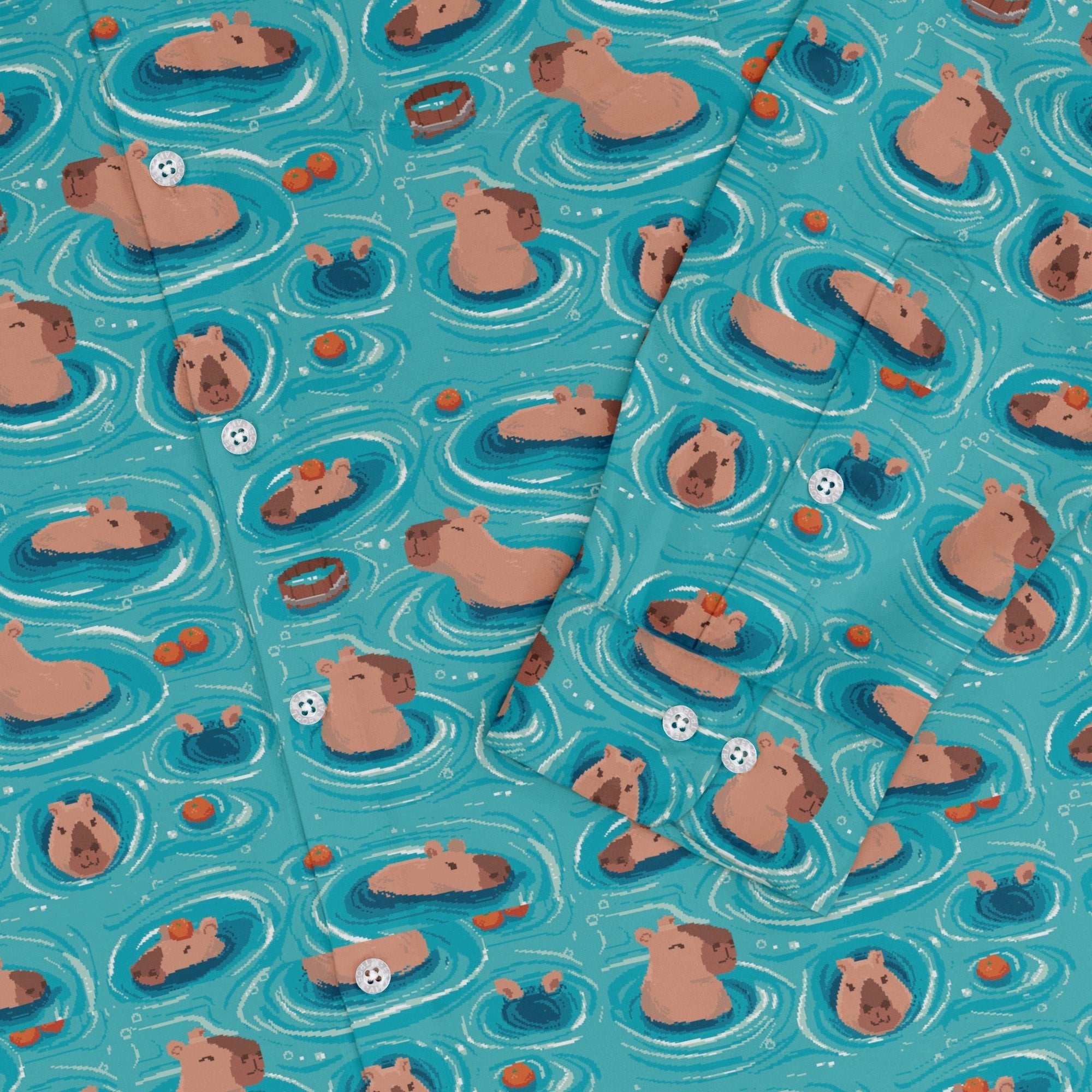 Capybara Springs Long Sleeve Button Up Shirt delivers instant calm with a wink. The print shows supremely chill capybaras lounging in warm spring pools, with gentle ripples, smooth stones, and drifting steam in an all-over pattern. Easy to dress up or down, this unisex long sleeve stays comfy from quest to coffee break. Designed by Claire Murphy, highlighting the artist behind the vibe.