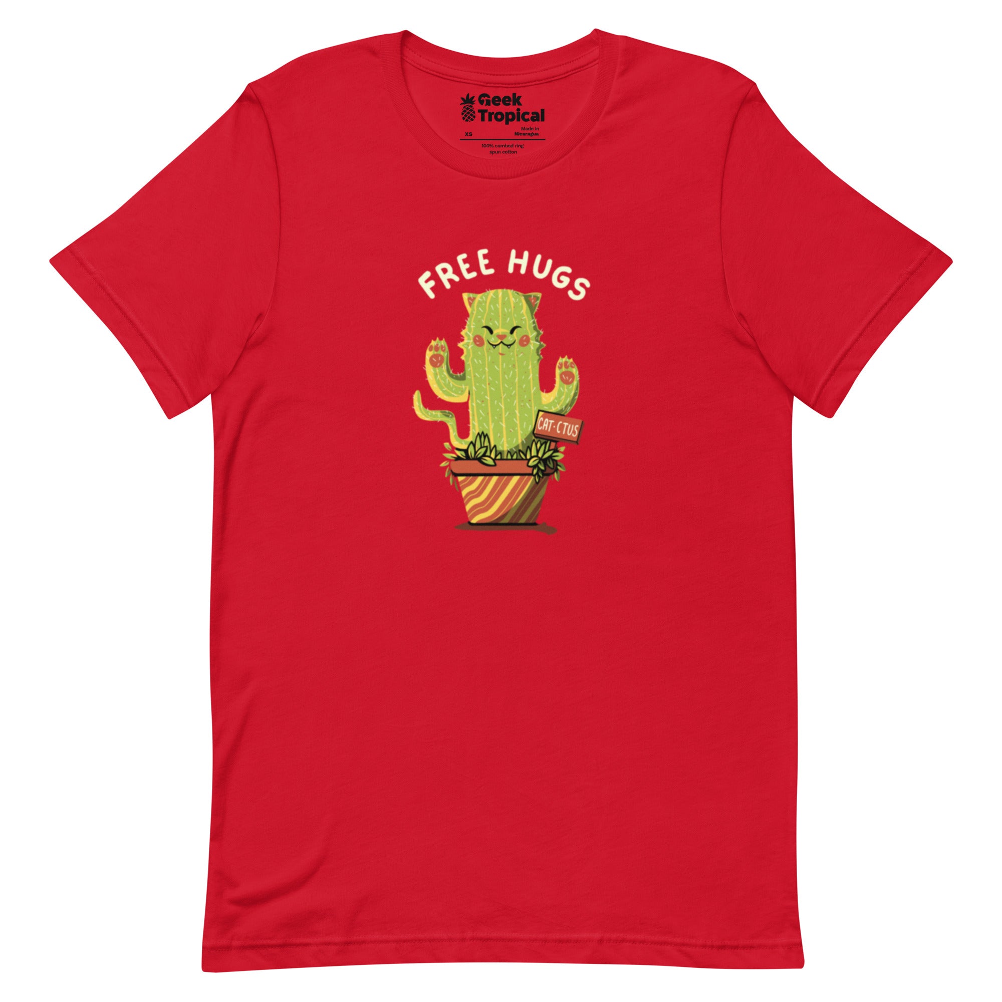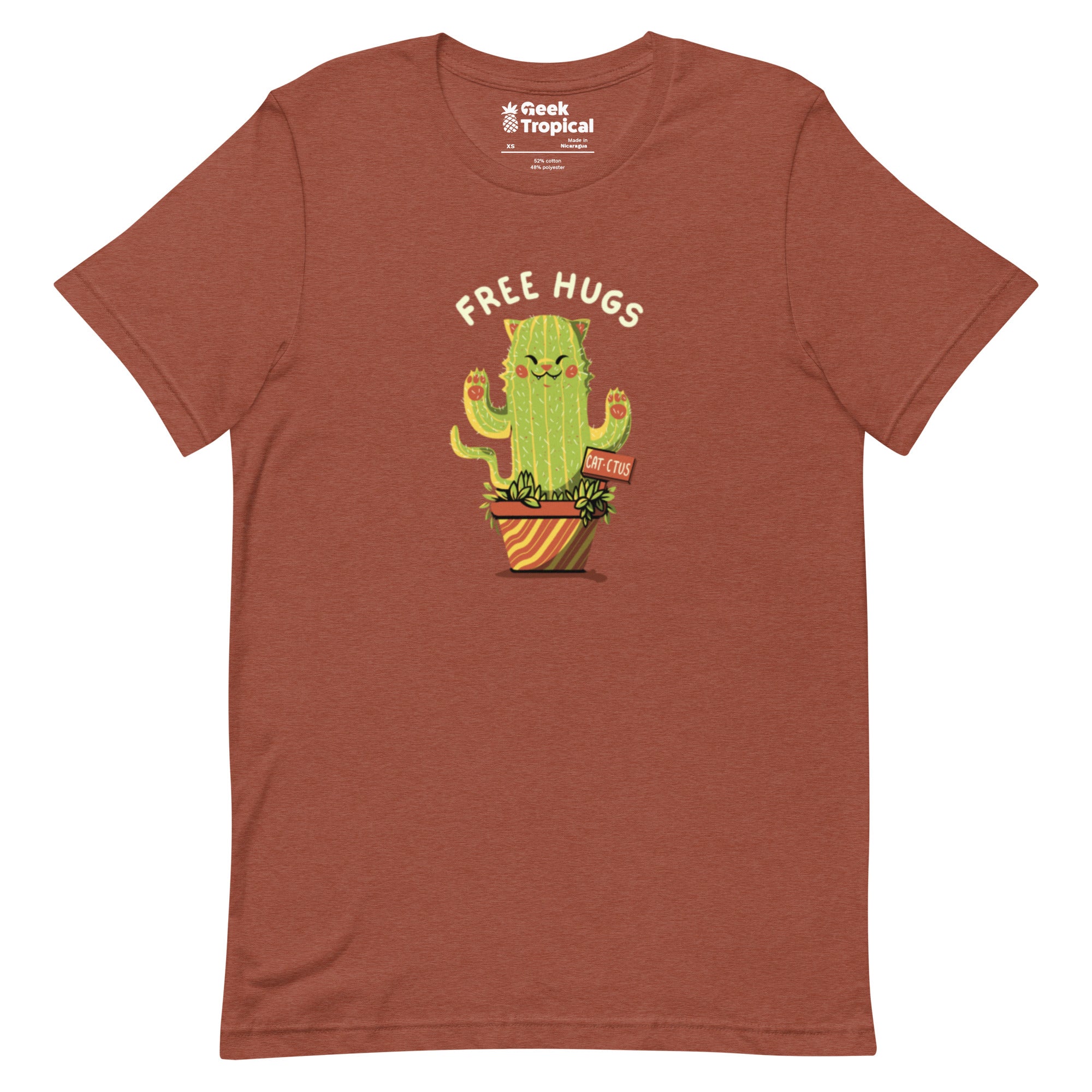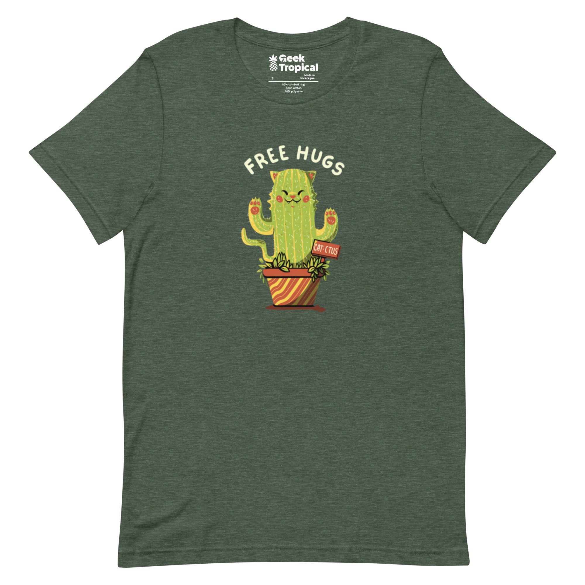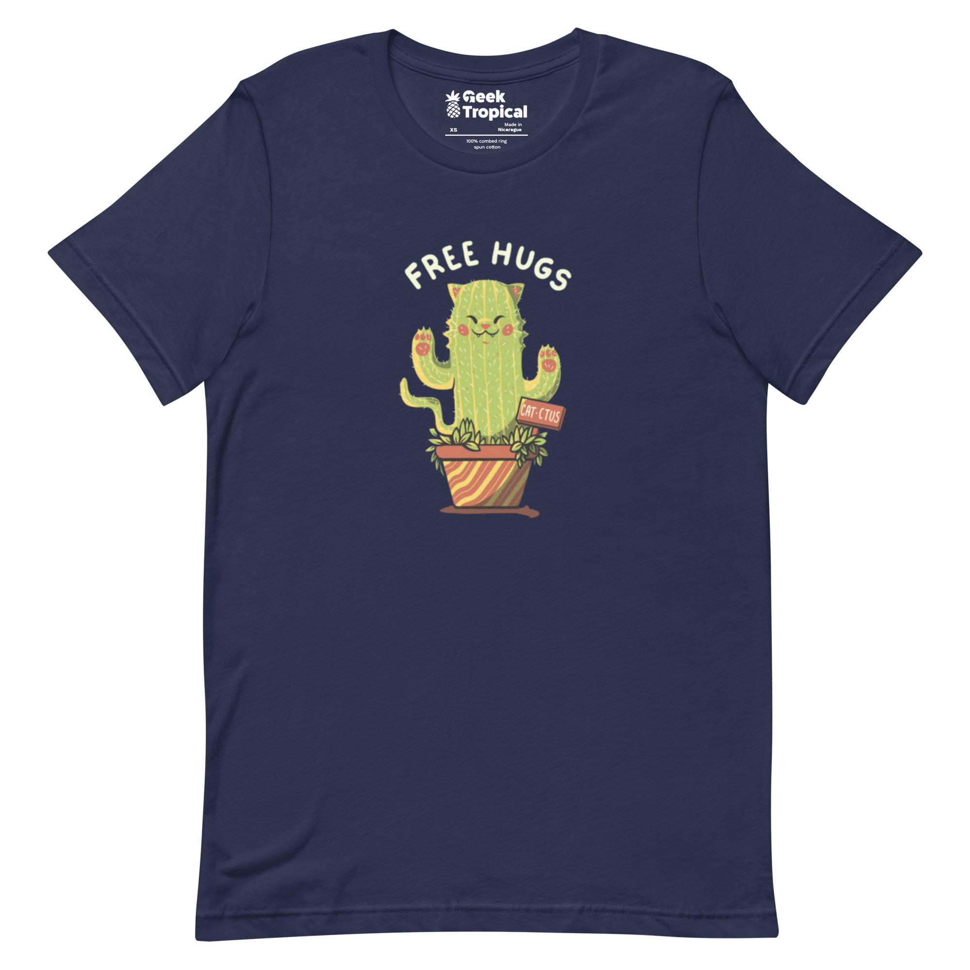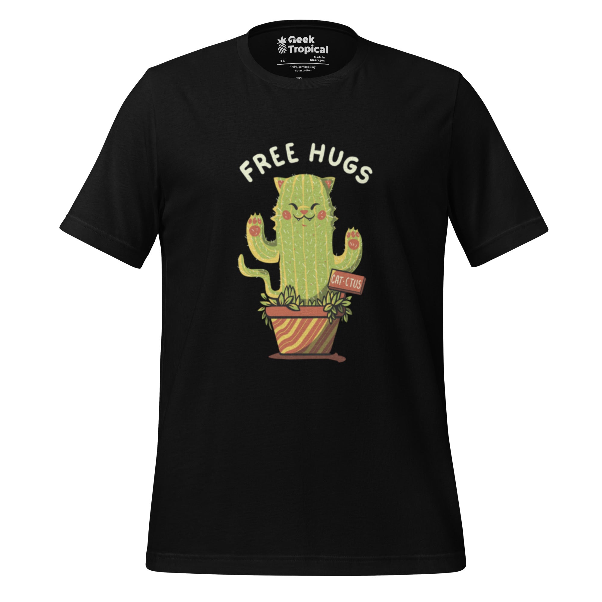 Cat-ctus Free Hugs T-Shirt plants a pun right on your chest and dares you to cuddle responsibly. The graphic shows a cat-shaped cactus—ears, whiskers, and all—covered in tiny spines and perched in a planter, paired with a hand-lettered Free Hugs message. Designed by Tobe Fonseca, it’s equal parts cute and sardonic, perfect for plant nerds, cat people, and humor lovers with sharp taste.