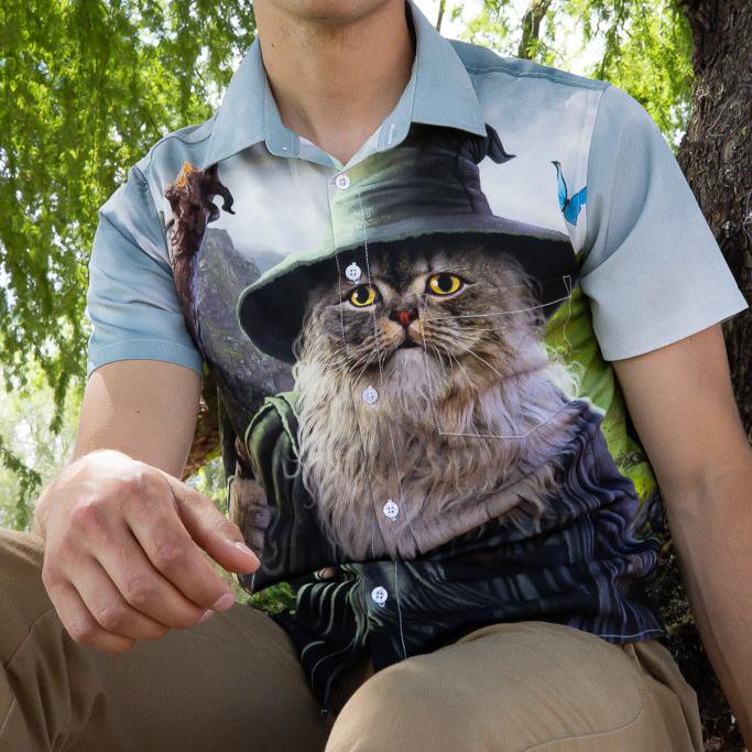 The Catdalf Button Up Shirt conjures a legendary vibe: a majestic wizard cat in a towering hat, staff in paw, repeating in an all-over print that flows cleanly across the front. A moody fantasy palette sets the scene, striking the sweet spot between playful and polished. Designed by Vincent Hie, this artist-backed piece delivers sly humor and quest-ready style—equally at home on game night or your daily rounds.