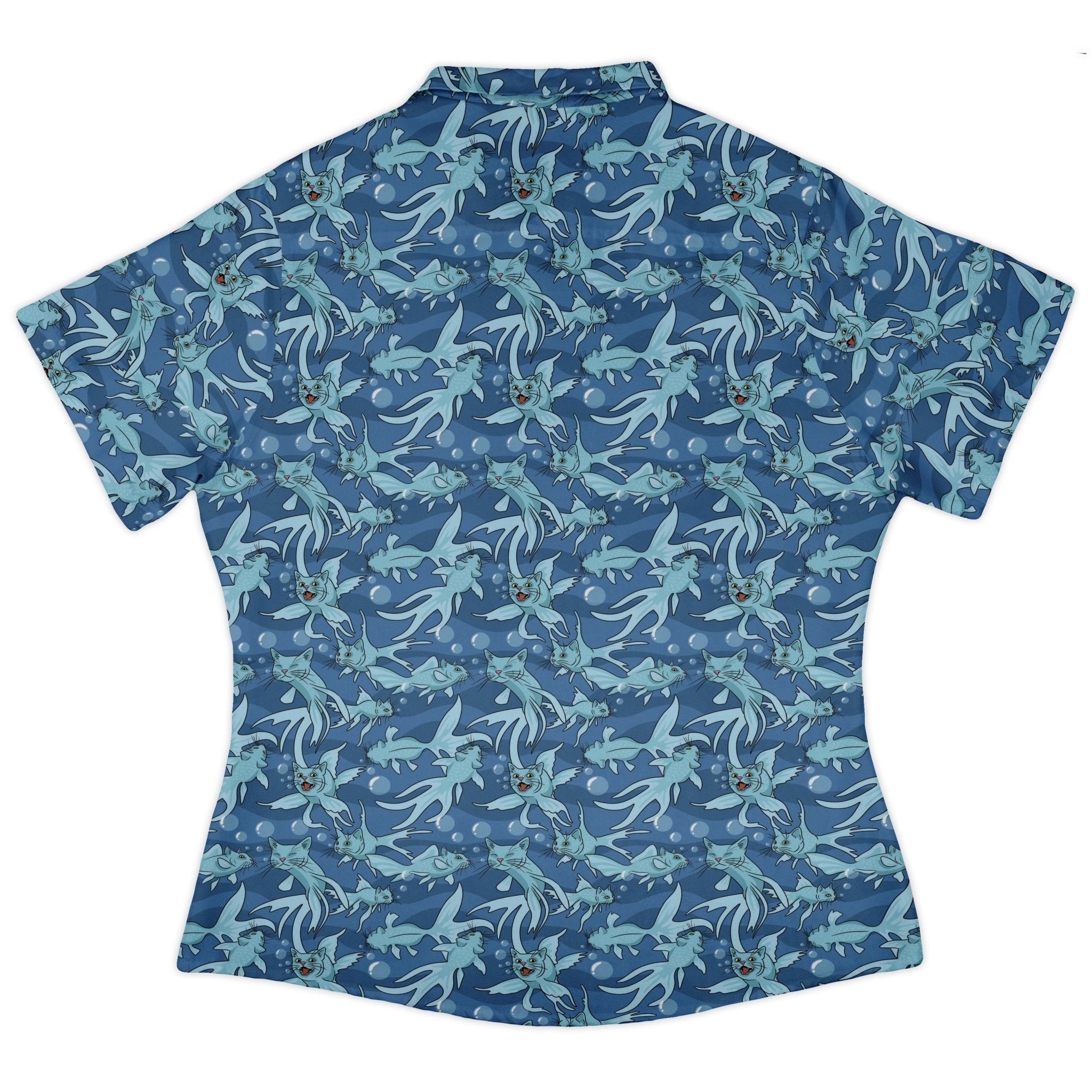 Meet the CatFish Curvy Button Up Shirt, tailored for smart style with nerdy flair. An allover school of whiskered catfish—designed by Julie Kitzes—glides across the front and pocket in a clean, continuous print. The curvy cut flatters and looks polished even untucked, with sleeves you can tweak for fitted or relaxed days. Lightweight, moisture-wicking comfort keeps pace, finished with distinctive branded buttons and eco-conscious inks.