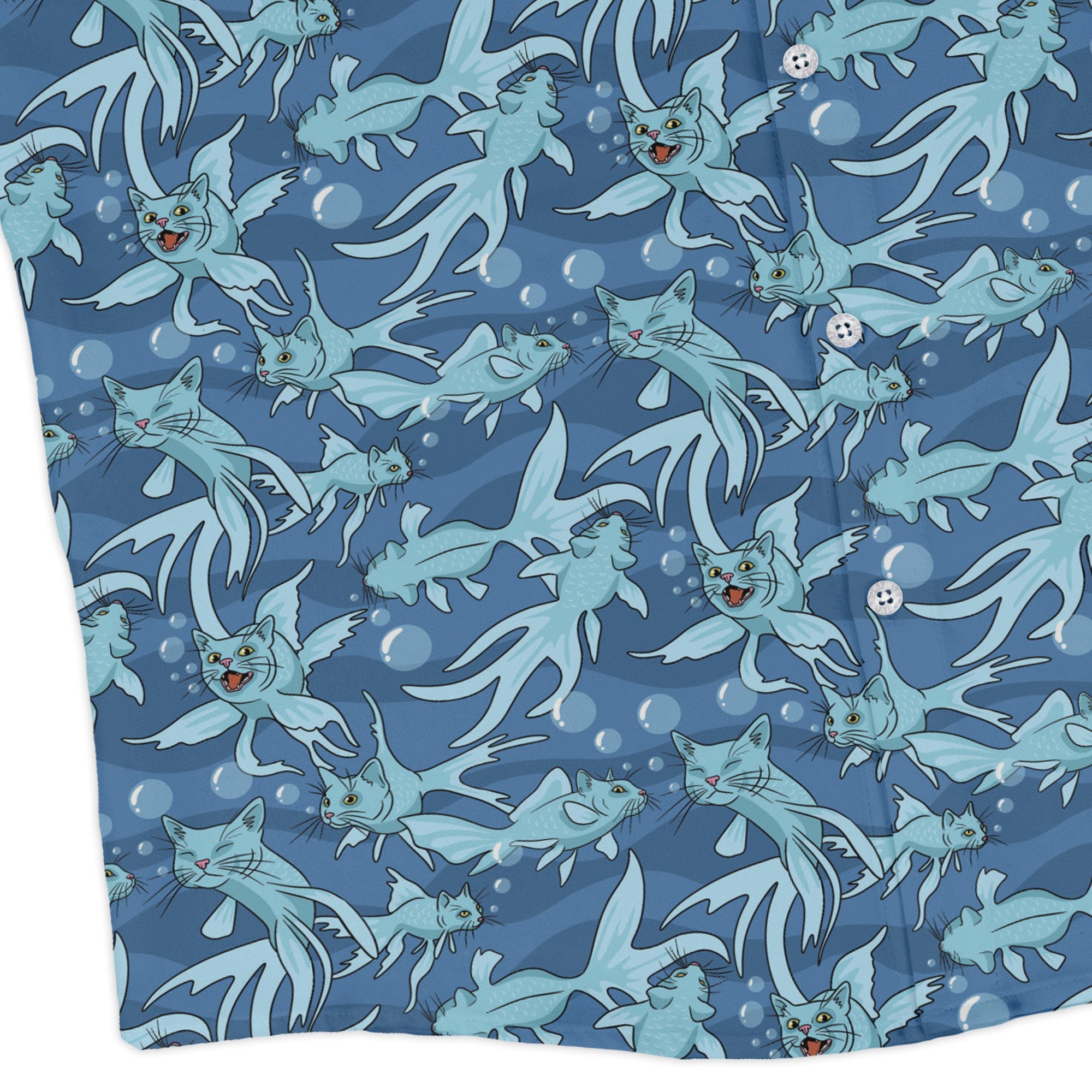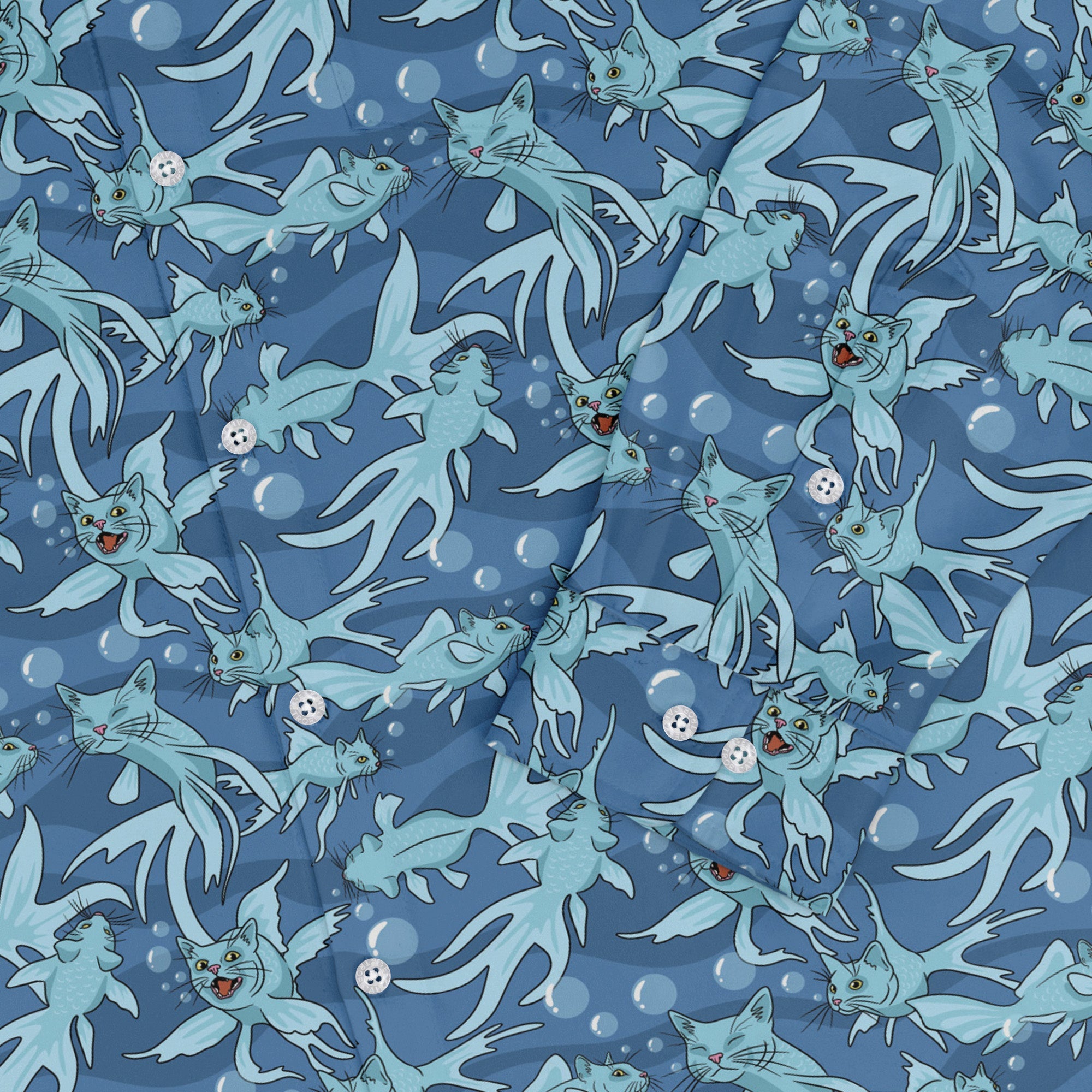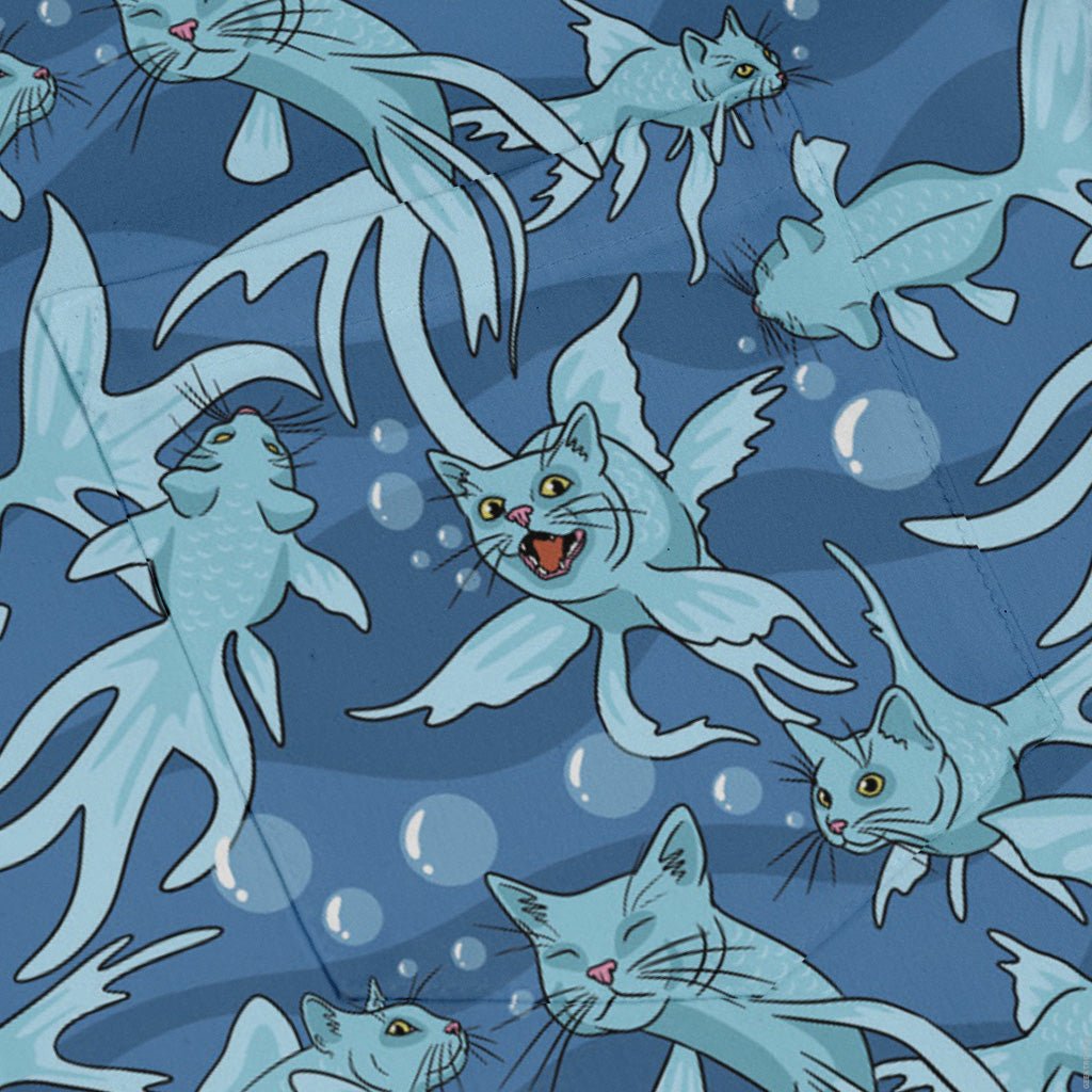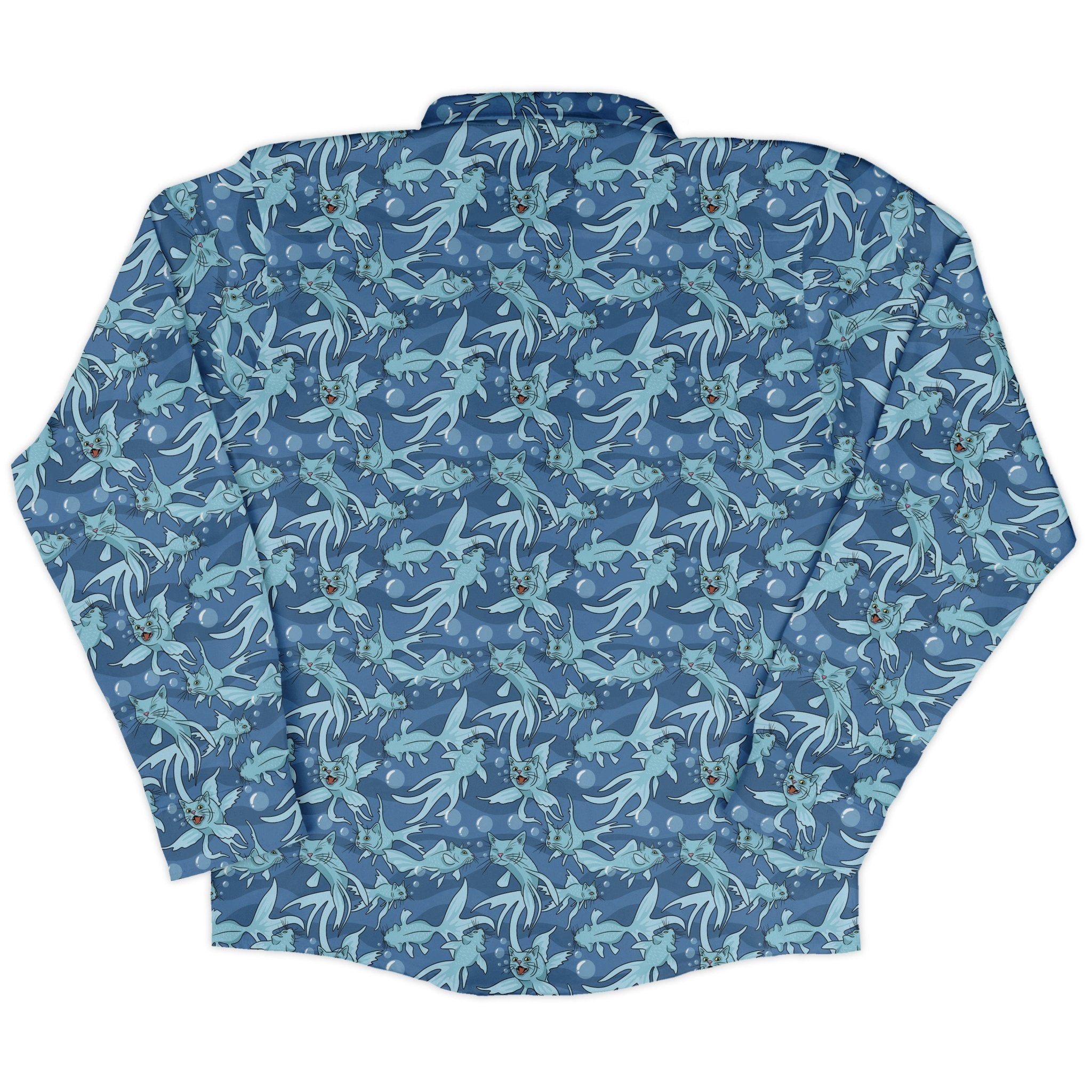 Meet the CatFish Long Sleeve Button Up Shirt—your witty crossover between pet memes and marine biology. Designed by Julie Kitzes, the all-over print parades playful cat–fish hybrids, whiskers and fins included, swimming in tidy repeats. A clean collar and long sleeves keep it polished, and the artwork flows seamlessly across the placket and pocket. Printed with eco-conscious inks and sized for adults who like their science with a purr.