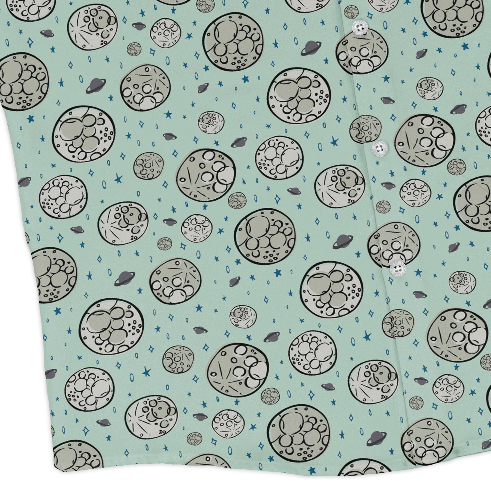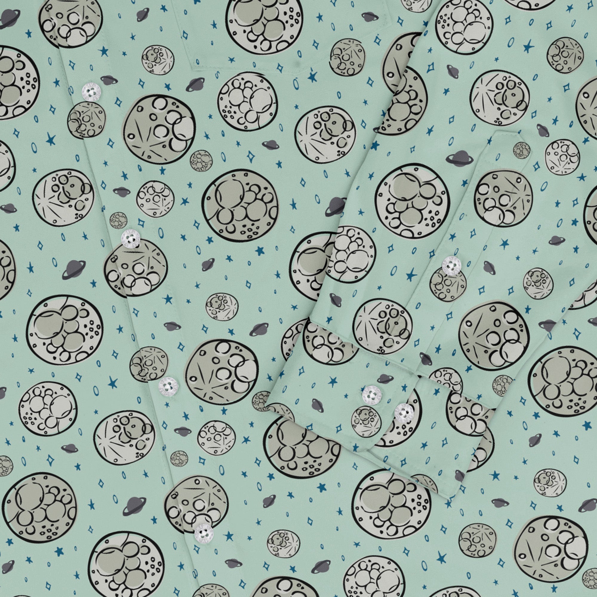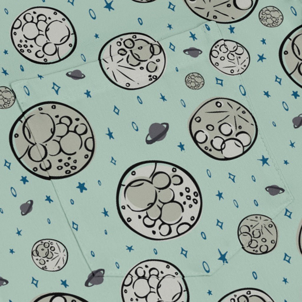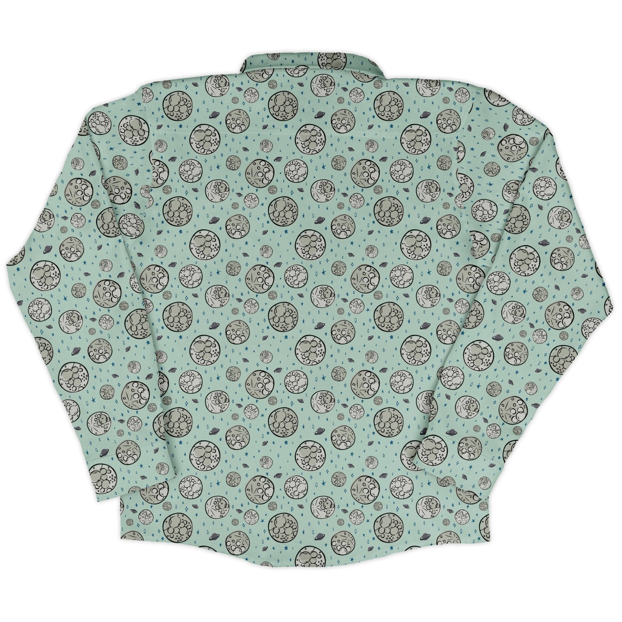 Meet the Cheesy Moon Long Sleeve Button Up Shirt, a cosmic wink for your wardrobe. Zirkus Design reimagines the moon as Swiss-cheese orbs, dotted with stars and tiny astronauts on spacewalks. The artwork lines up across the chest and pocket for a clean, continuous look. Soft, lightweight comfort keeps you cool from office to orbit, and eco-conscious inks keep it kind. Artist-backed, funny, and effortlessly sharp—pair with denim or dress it up.