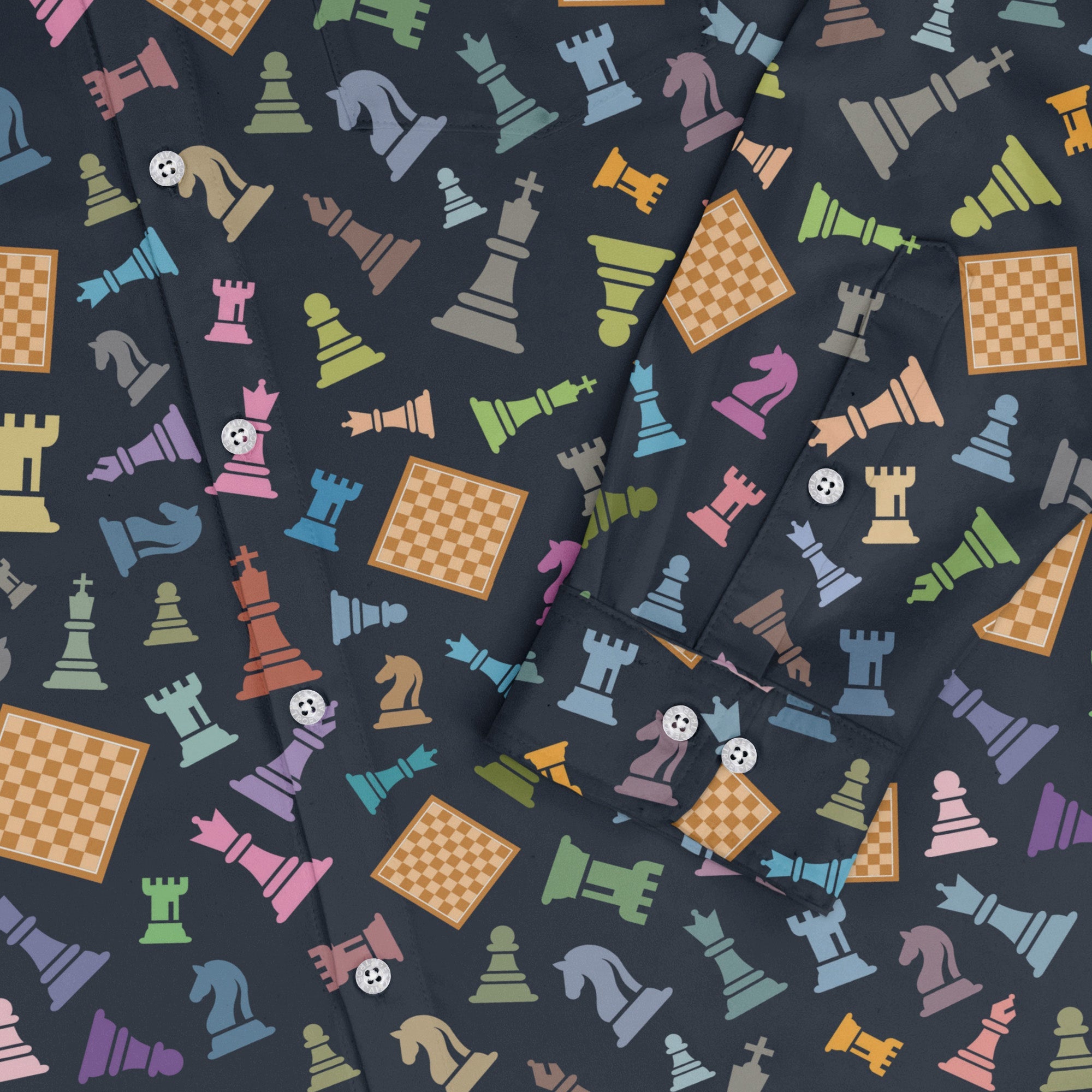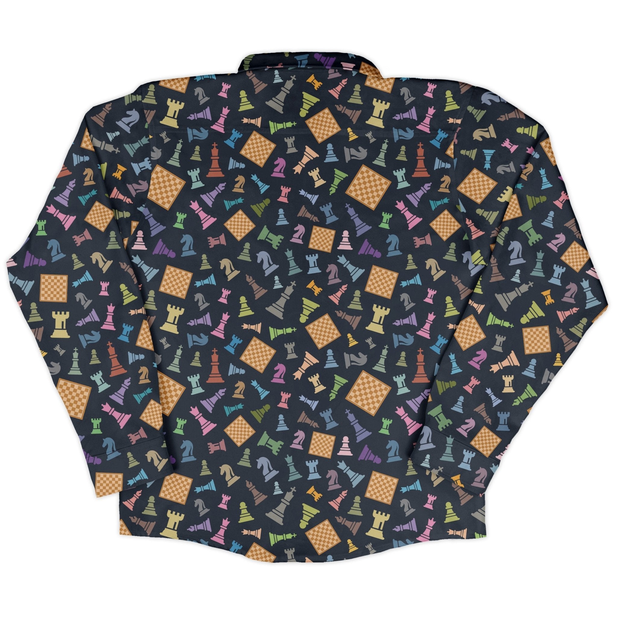 Make your next move in the Chess Colorful Pieces Board Blue Long Sleeve Button Up Shirt, a sharp ode to board-game strategy. A rich blue backdrop sets the stage for a tiled board and vibrant chess icons, rendered in bold, playful color. The artwork lines up cleanly across the front and pocket for a seamless look, balancing geek energy with smart tailoring. Artist-backed and printed with eco-conscious inks.