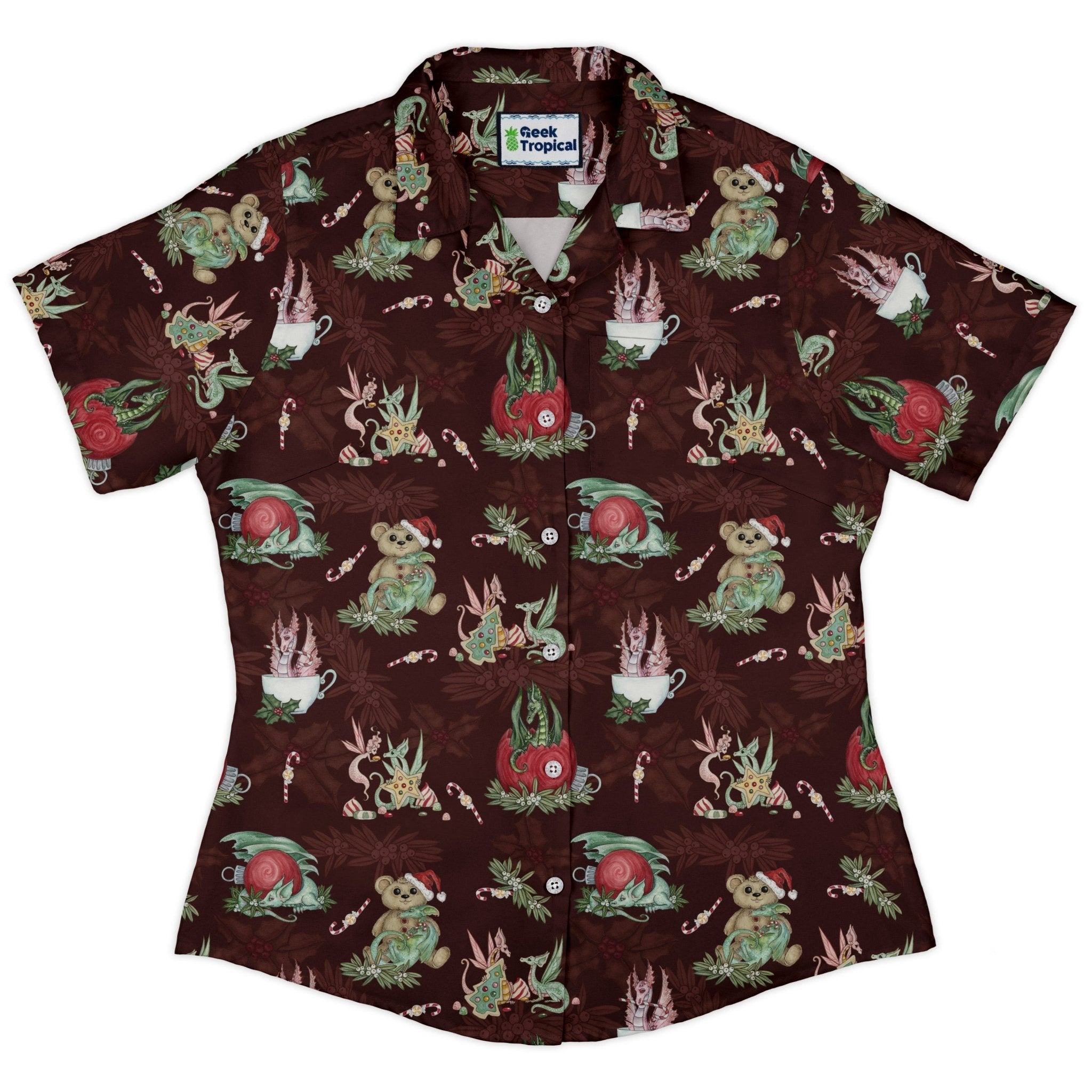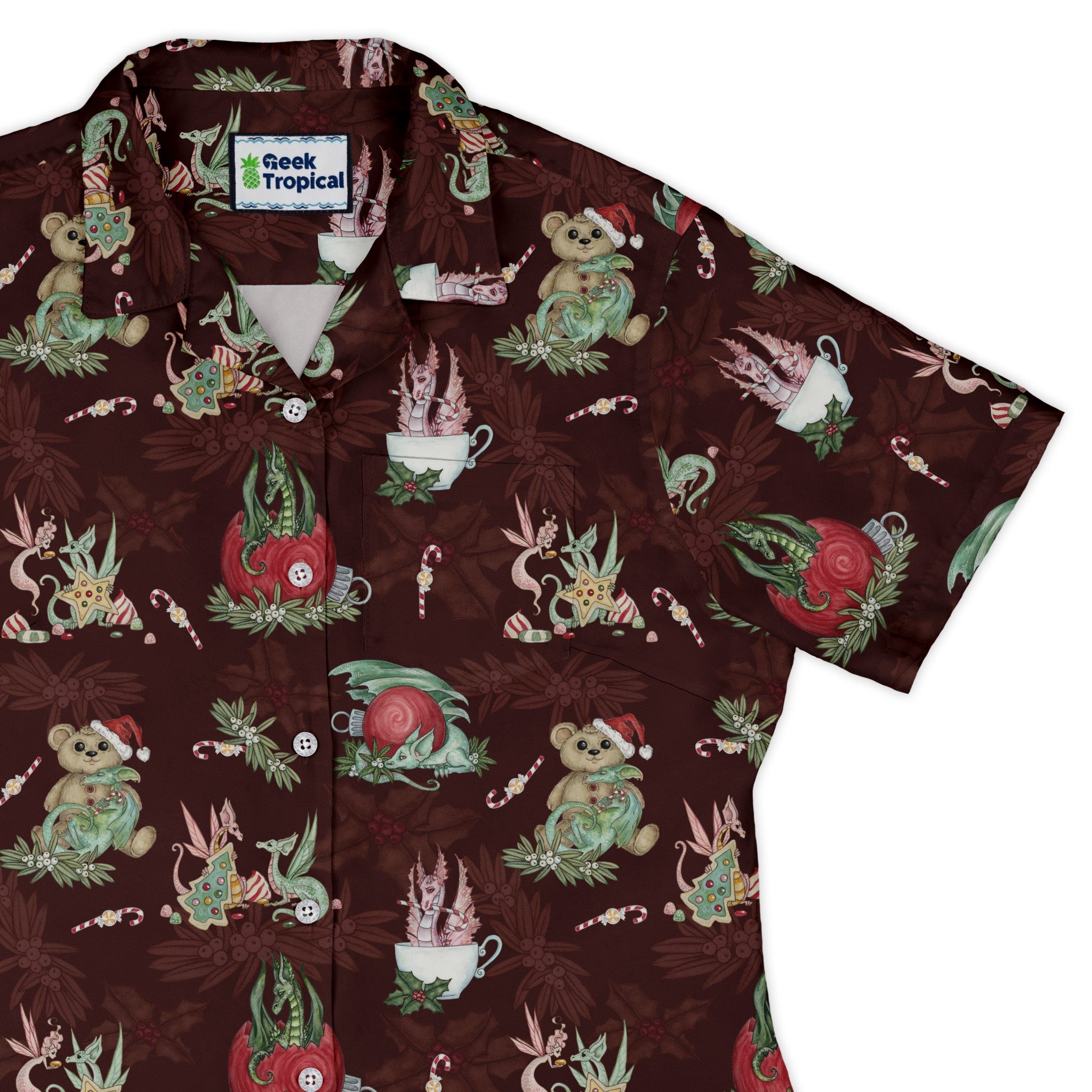 Meet the Christmas Time with Dragons Curvy Button Up Shirt, a festive fantasy for your wardrobe. Designed by Amy Brown, merry dragons parade across a cohesive, wraparound print that even aligns over the pocket. A curve-loving cut, graceful curved hem, and adjustable sleeves keep it polished and versatile. Soft, lightweight comfort lasts all day, finished with branded buttons. Sustainably printed and artist-backed, it’s your cozy nod to holiday geekdom.
