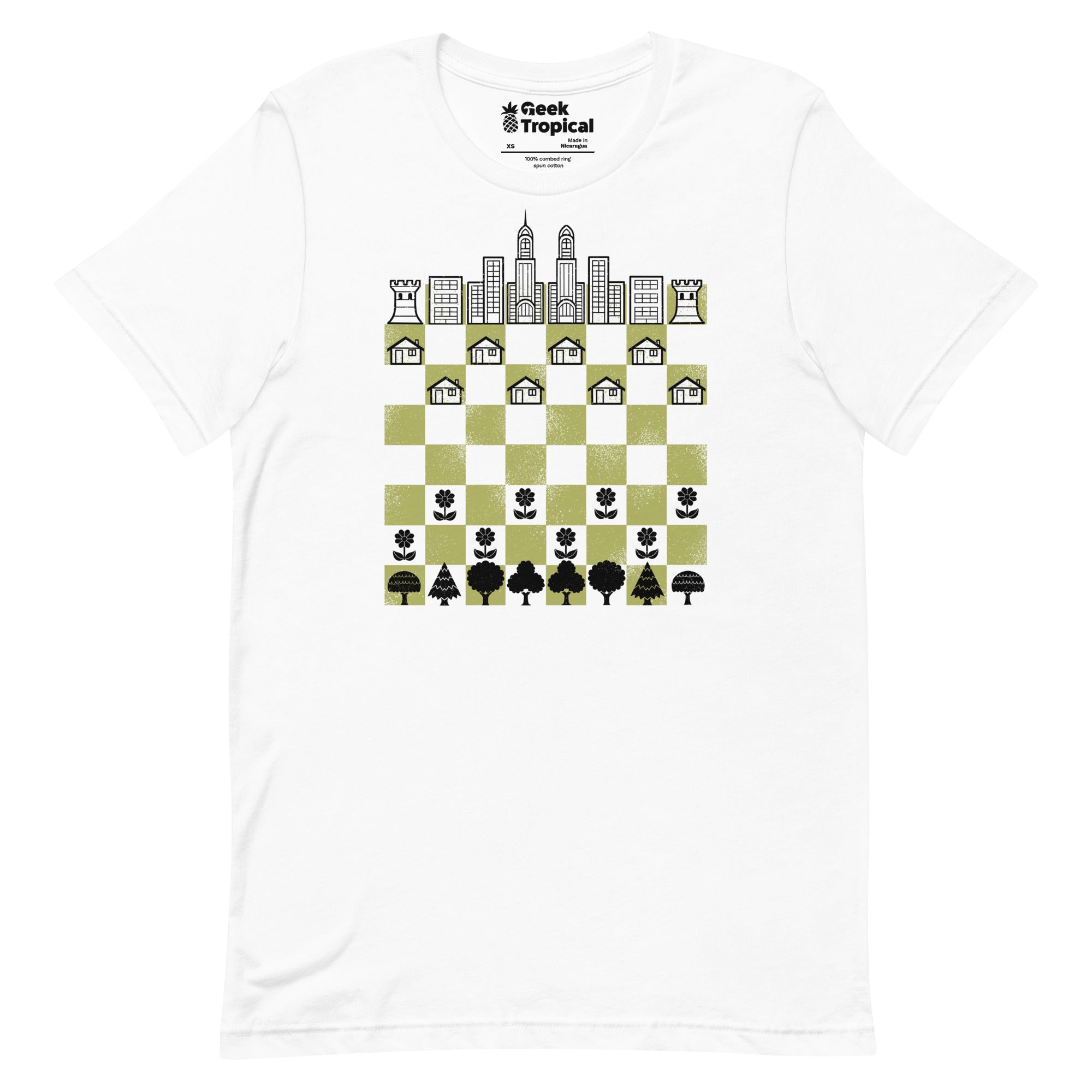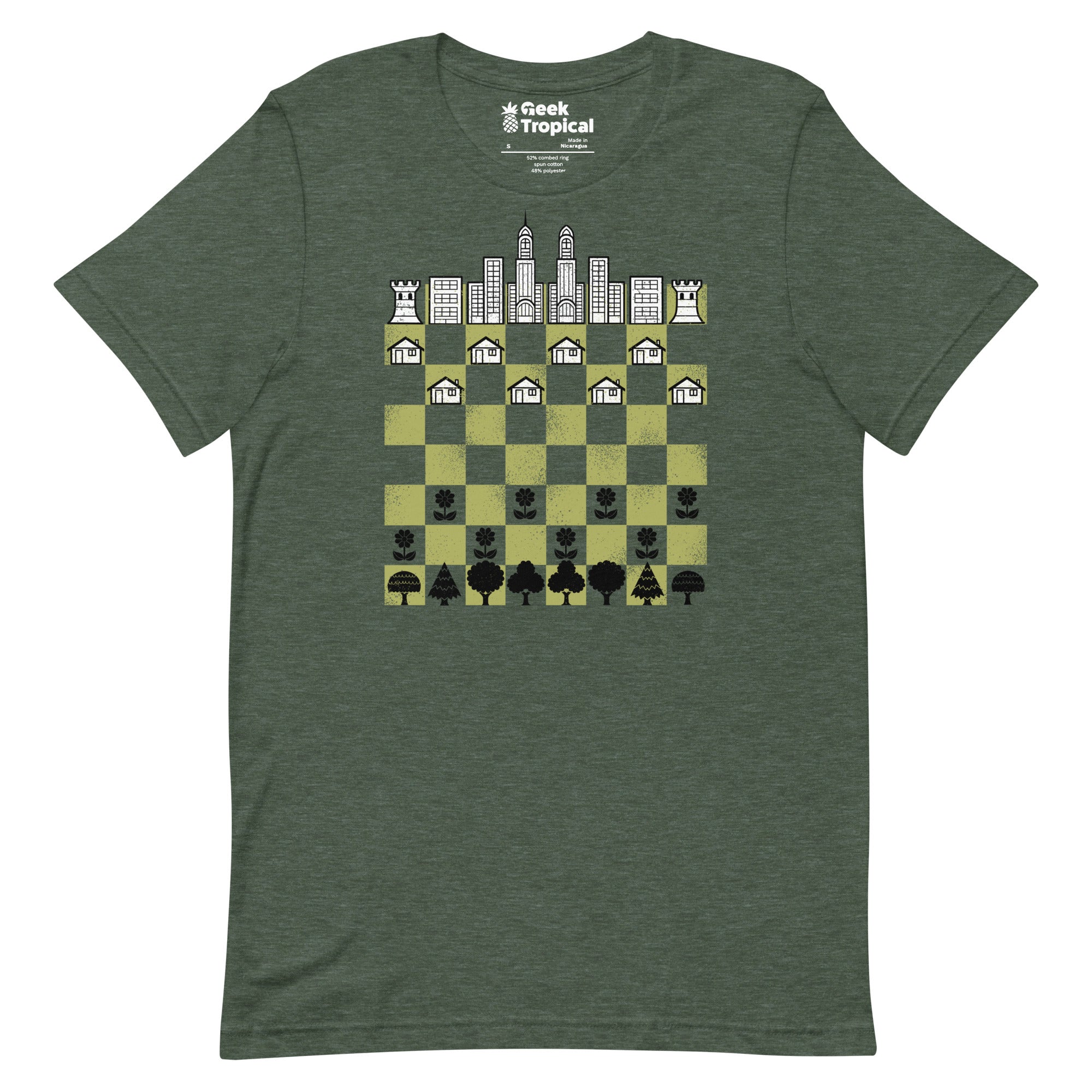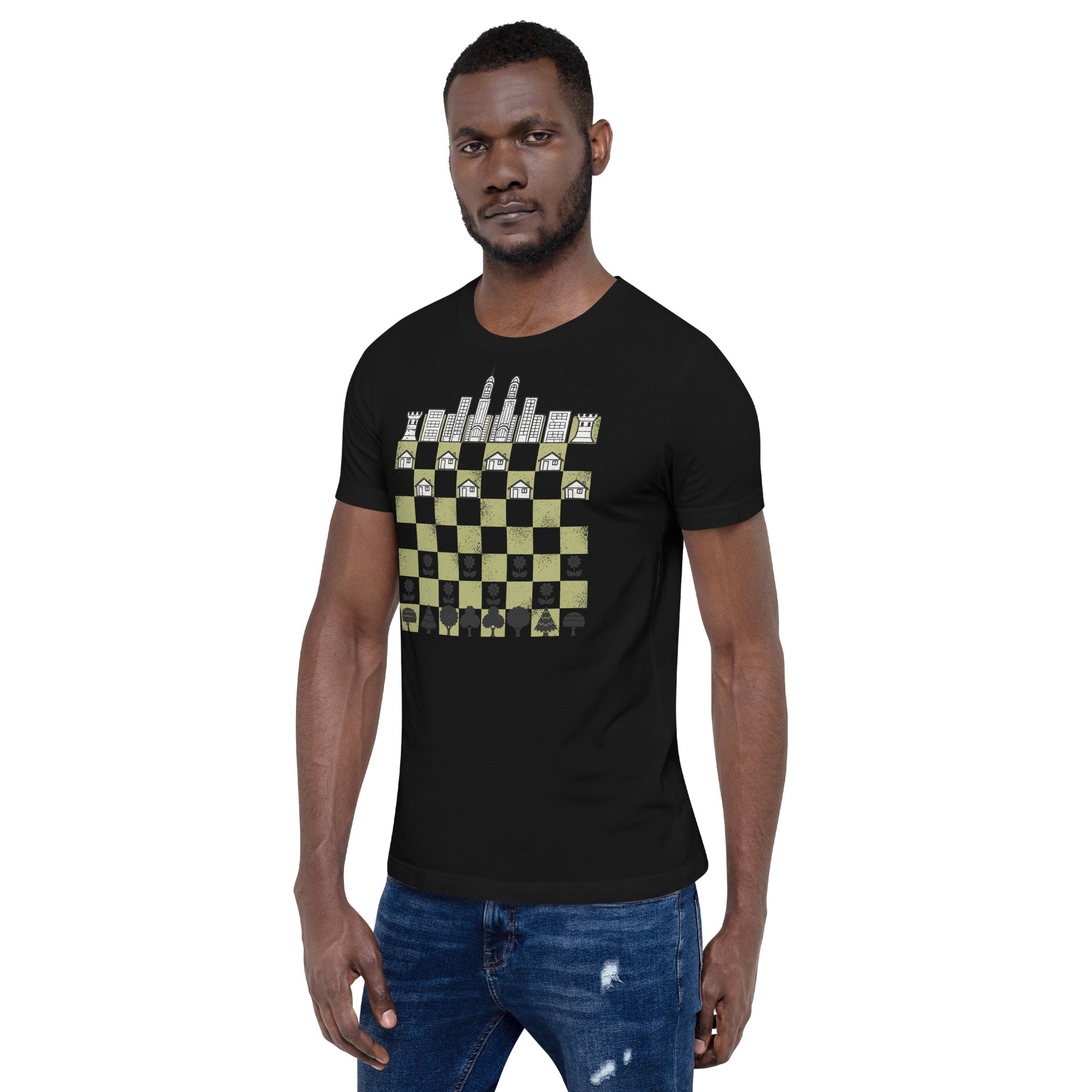 City Forest Chess Vintage Game T-Shirt plants strategy in the wild. Designed by Tobe Fonseca, the artwork fuses vintage chess motifs with lush botanical shapes and subtle urban geometry—rooks and knights entwined with leaves and structured lines. Crisp, enduring color highlights the intricate linework, perfect for board‑game brains and plant geeks alike. Artist-backed and eco‑minded.