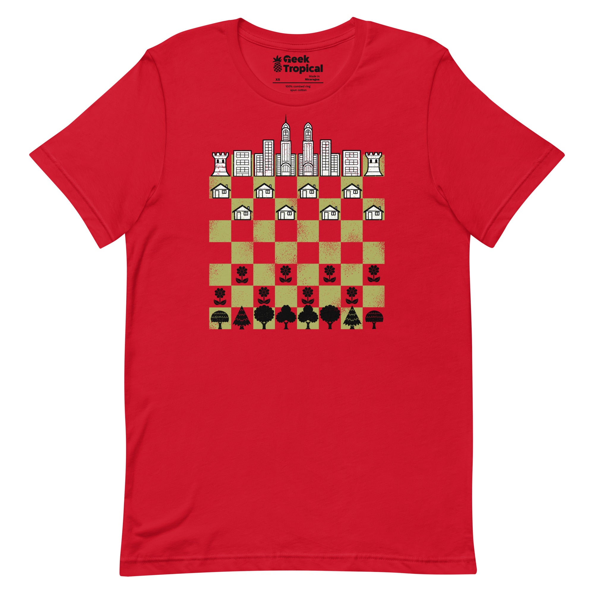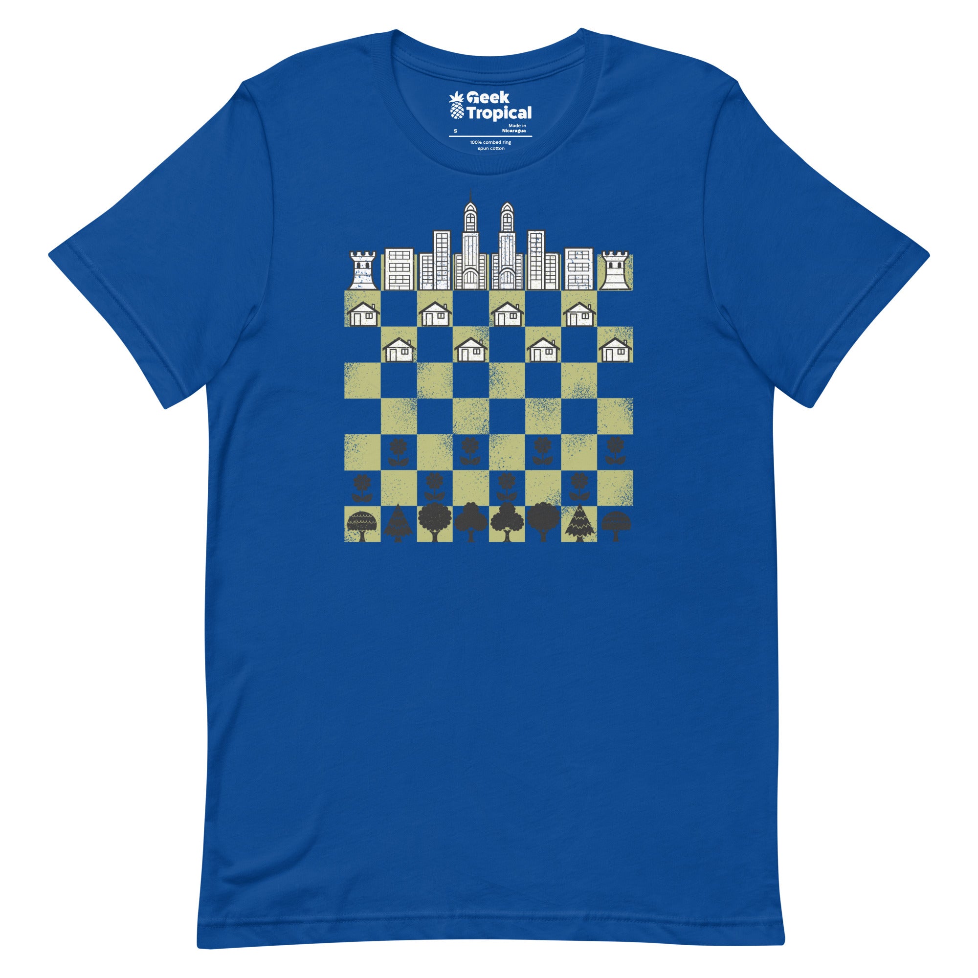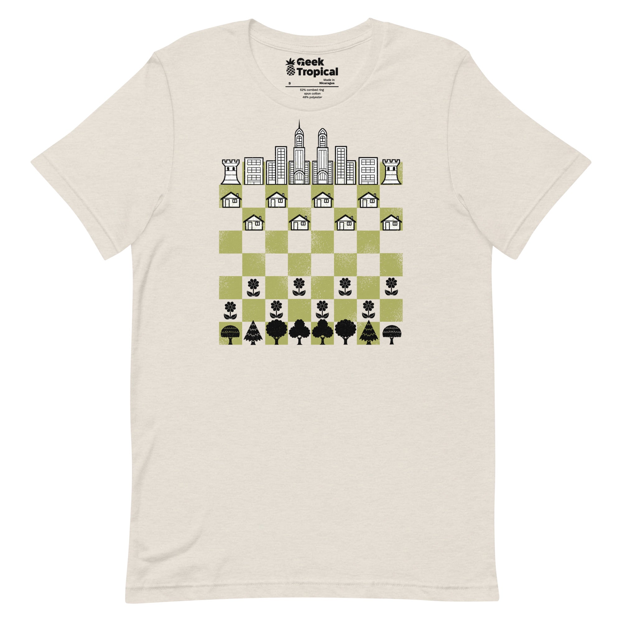 City Forest Chess Vintage Game T-Shirt plants strategy in the wild. Designed by Tobe Fonseca, the artwork fuses vintage chess motifs with lush botanical shapes and subtle urban geometry—rooks and knights entwined with leaves and structured lines. Crisp, enduring color highlights the intricate linework, perfect for board‑game brains and plant geeks alike. Artist-backed and eco‑minded.