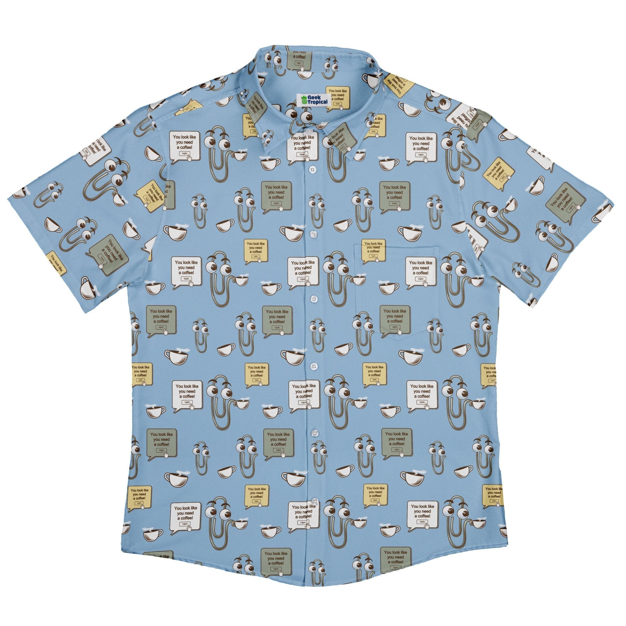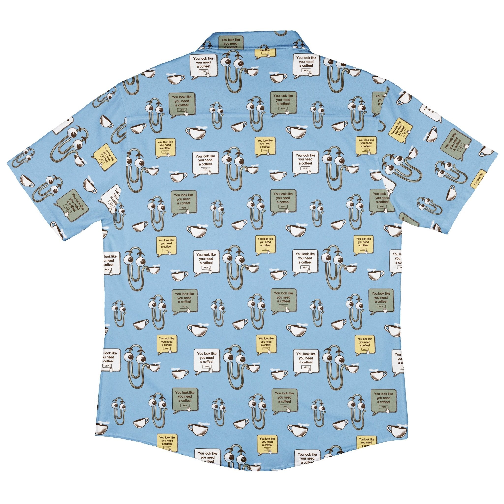 Clippy Coffee Button Up Shirt serves office nostalgia with a caffeine kick. An all-over pattern of the iconic paperclip helper and steaming coffee cups pops across a clean field, flowing neatly over seams and the optional pocket for a sharp, nerdy finish. Designed by Tobe Fonseca, it’s the perfect wink for late-night spreadsheet warriors, code tinkerers, and anyone who runs on ctrl+c and coffee.