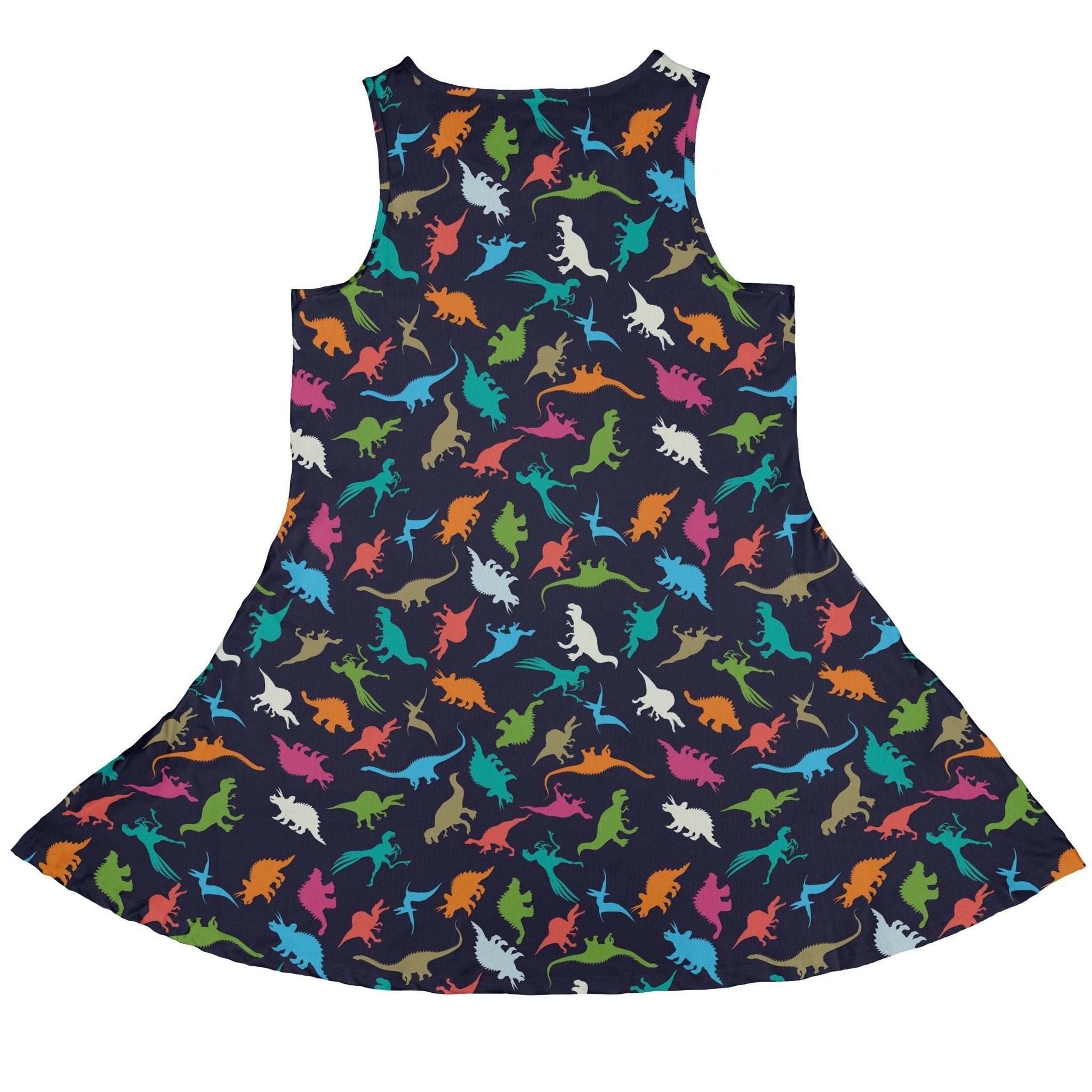 Level up your look with the Colorful Dinosaur Silhouettes Navy Dress. A deep navy backdrop sets off crisp, multihued dino silhouettes for a playful pattern that reads smart, not shouty. The fabric feels smooth and breathable with confident coverage, and yes—there are real pockets that actually hold your game controller. Easy to style, comfy for all-day quests, and created in collaboration with licensed artists.