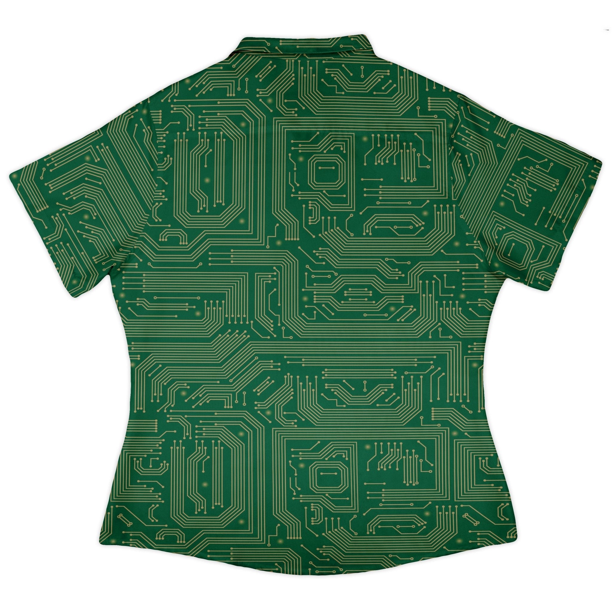 The computer circuit board yellow green Curvy Button Up Shirt channels lab-grade nerdery into a sleek, confidence-boosting fit. A vivid yellow canvas is overlaid with crisp green PCB pathways, solder dots, and circuit motifs, aligned so the pattern flows cleanly across the chest pocket. The contoured cut and curved hem keep it polished even untucked, while eco-friendly inks and artist-backed production make this maximalist print smart in every sense.