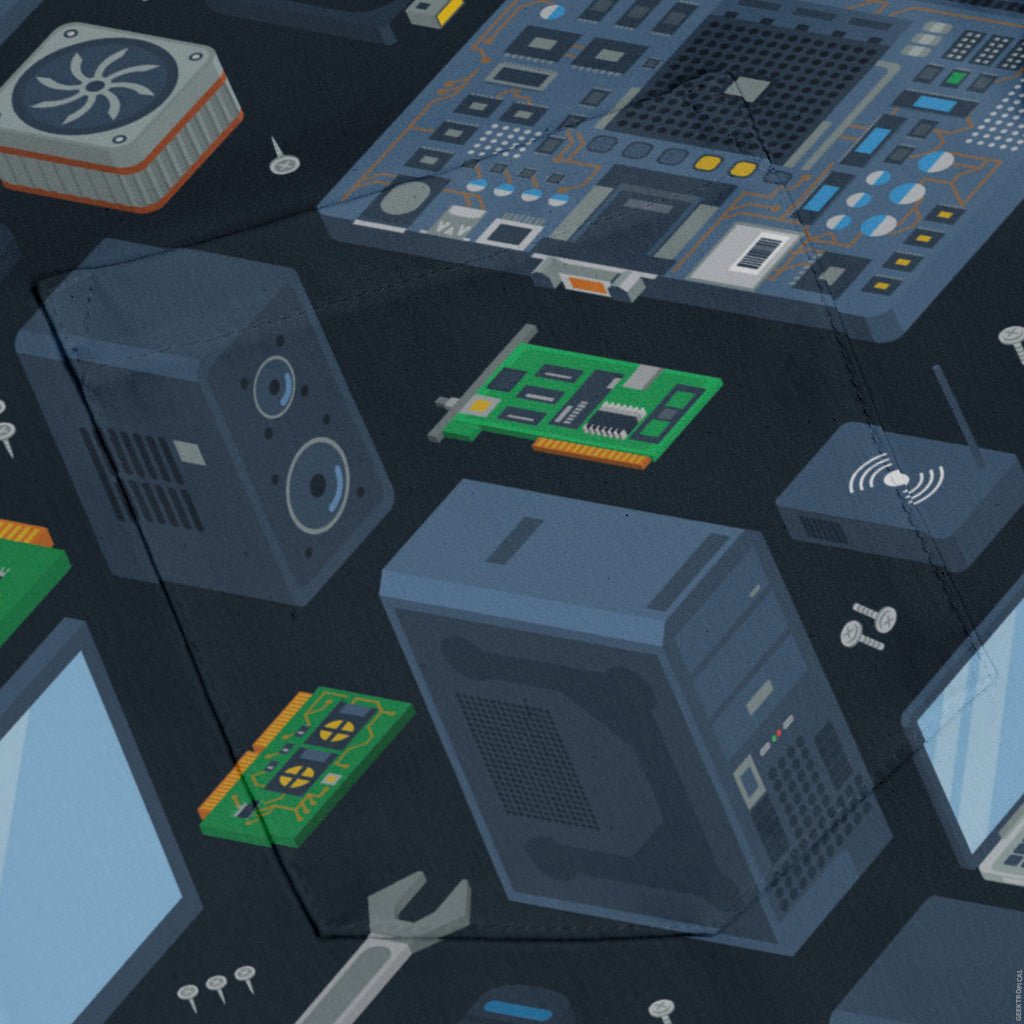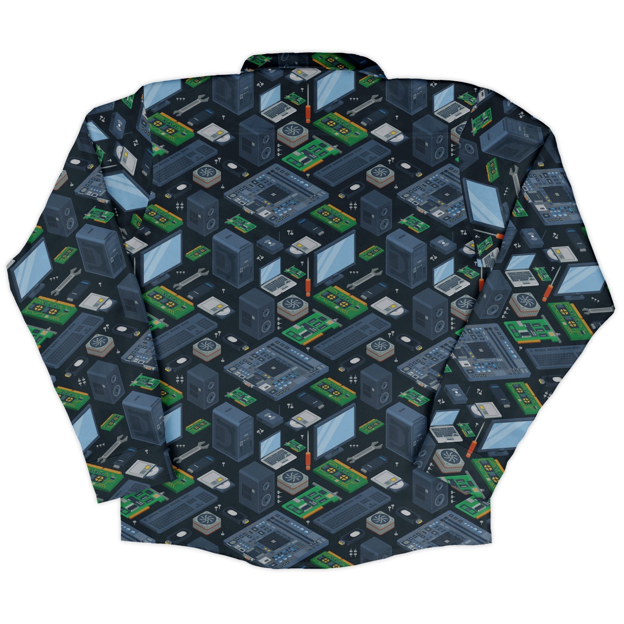 The Computer Electronic Parts Dark Navy Long Sleeve Button Up Shirt turns your love of hardware into wearable art, layering a dark navy base with a dense grid of circuitry and component iconography. Smooth, lightweight fabric keeps it comfortable from desk to after-hours. The artist-backed print maps cleanly across the chest and pocket, and it’s printed with eco-friendly inks. Geeky, bold, and office-to-con—maximalist by design.